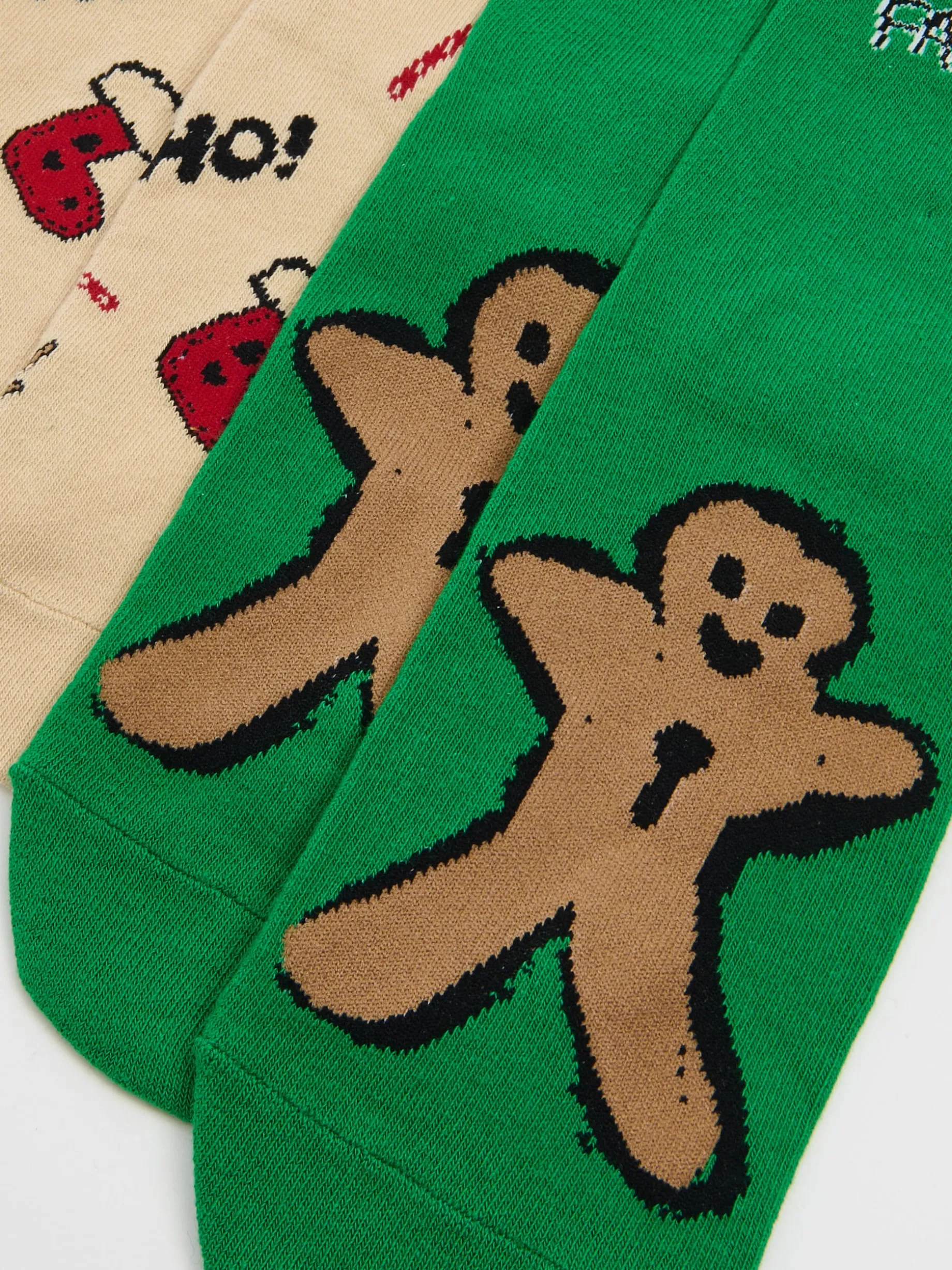 Pierniczków w święta nigdy nie za wiele! Zestaw dwóch par damskich długich skarpet, uszytych z przyjemnej w dotyku mieszanki dzianin. Na całości nadruki z bożonarodzeniowym symbolem. Dzięki świątecznej kolorystyce, możesz je śmiało miksować. dzianinowy materiał z bawełną dłuższy, prosty krój nadruk z motywem Xmas
