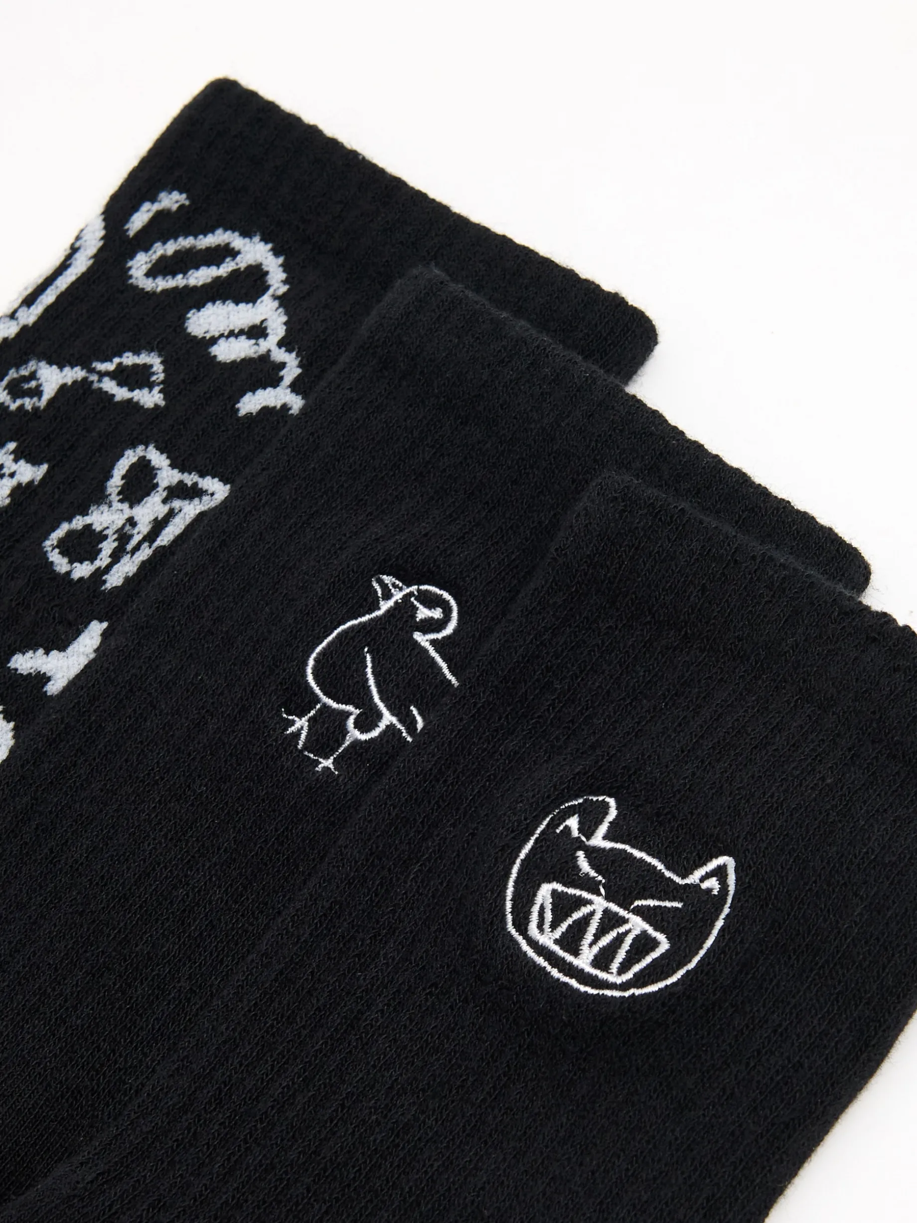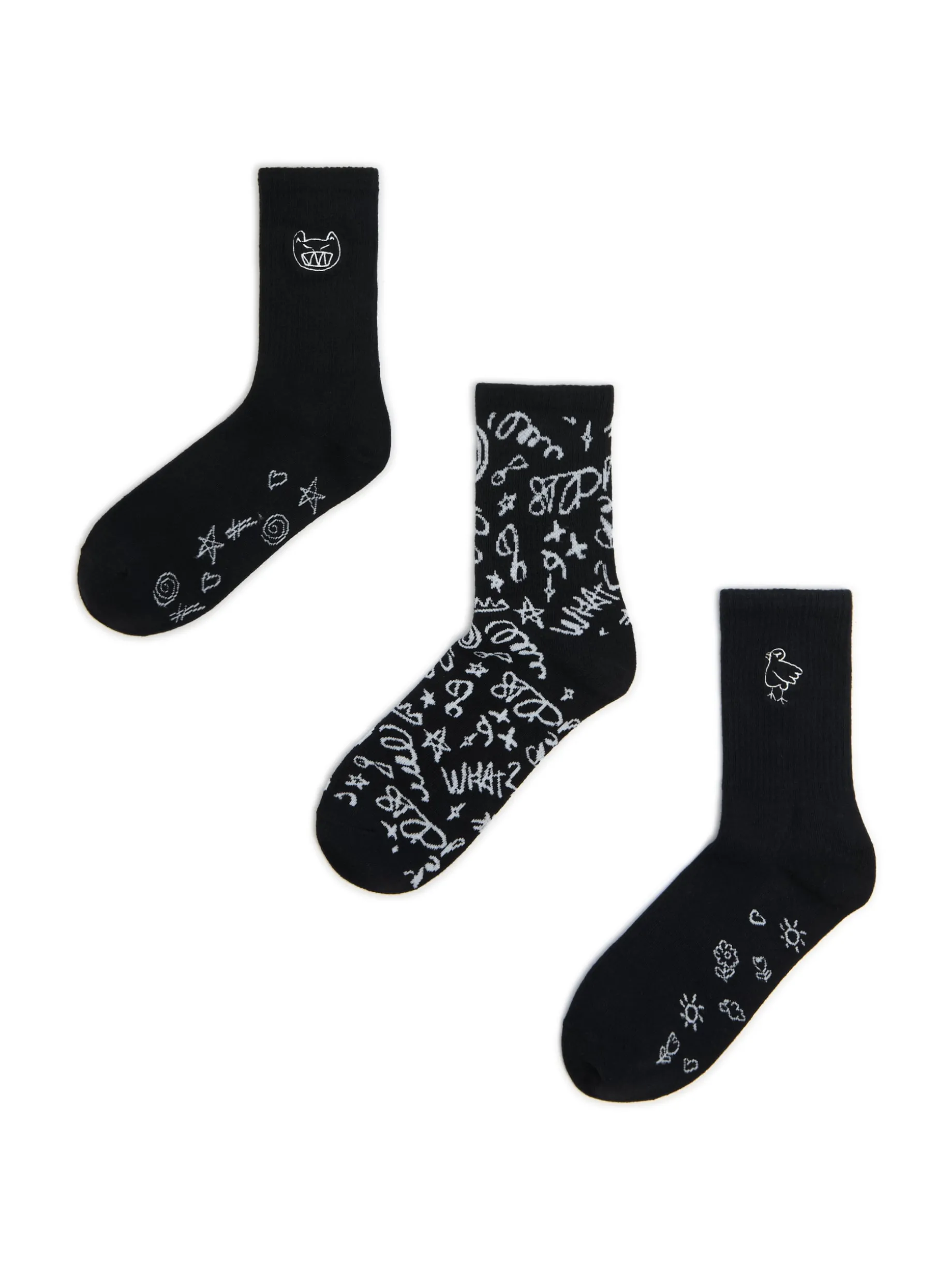 Zestaw trzech par damskich skarpet uszytych z mieszanki dzianin w czarnym kolorze. Ściągacze i prążkowany materiał zapewniają dopasowanie. Ozdobą są kontrastowe nadruki w stylu notatek z brudnopisu. Miksuj dowolnie! dzianinowy materiał z bawełną dłuższy, prosty krój kontrastowy nadruk all over