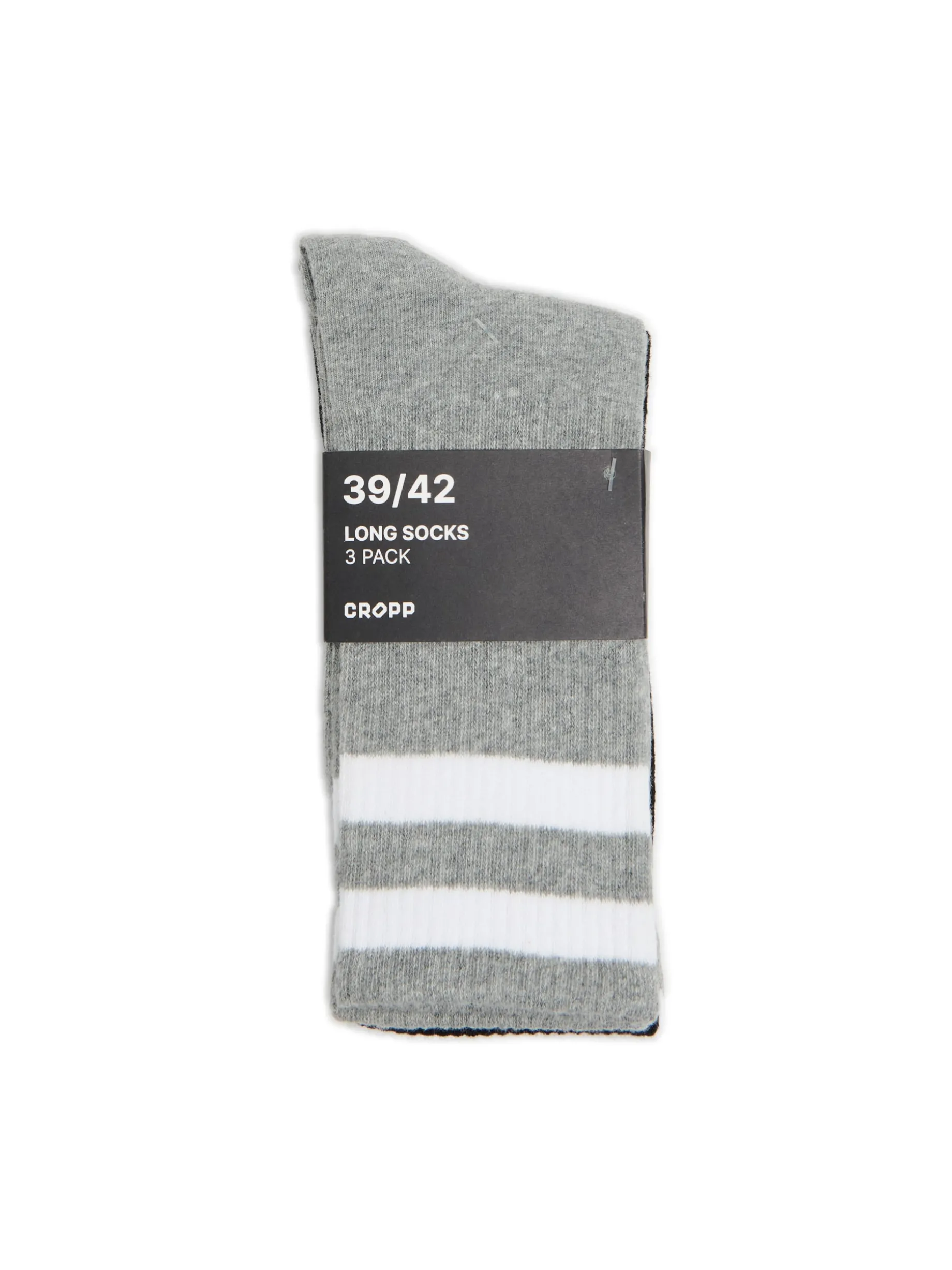 Trójpak męskich skarpet o długim fasonie, uszytych z dzianiny o wysokiej zawartości bawełny. W zestawie wersja czarna, szara i biała – każda ozdobiona poziomymi paskami na ściągaczu. Basic, który musisz mieć!