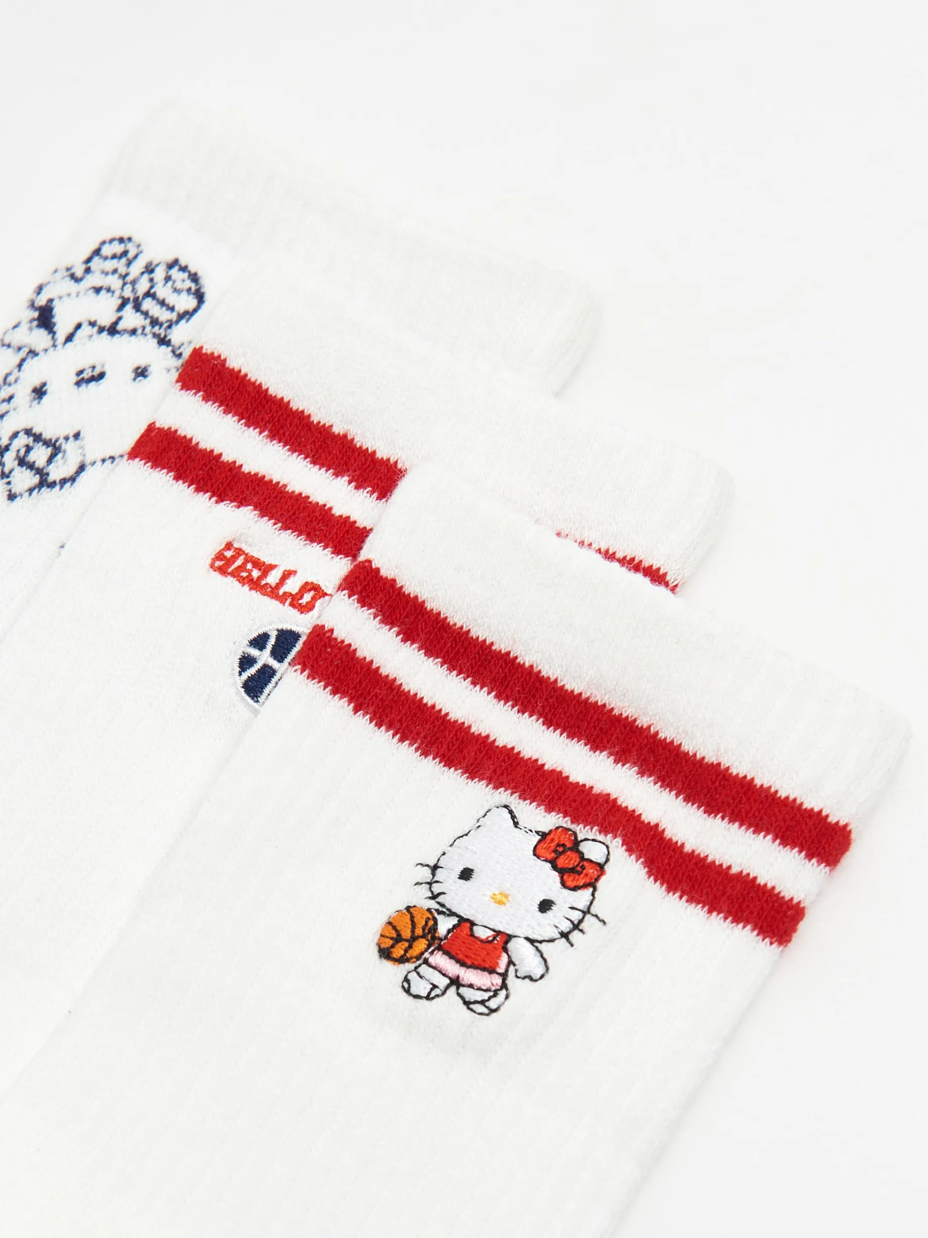 Zestaw trzech par długich, sportowych skarpet, uszytych z dzianiny zawierającej bawełnę. Na każdej parze wizerunek z serii Hello Kitty. dzianinowy materiał z bawełną prosty krój nadruk z motywem Hello Kitty © 2024 SANRIO CO., LTD.