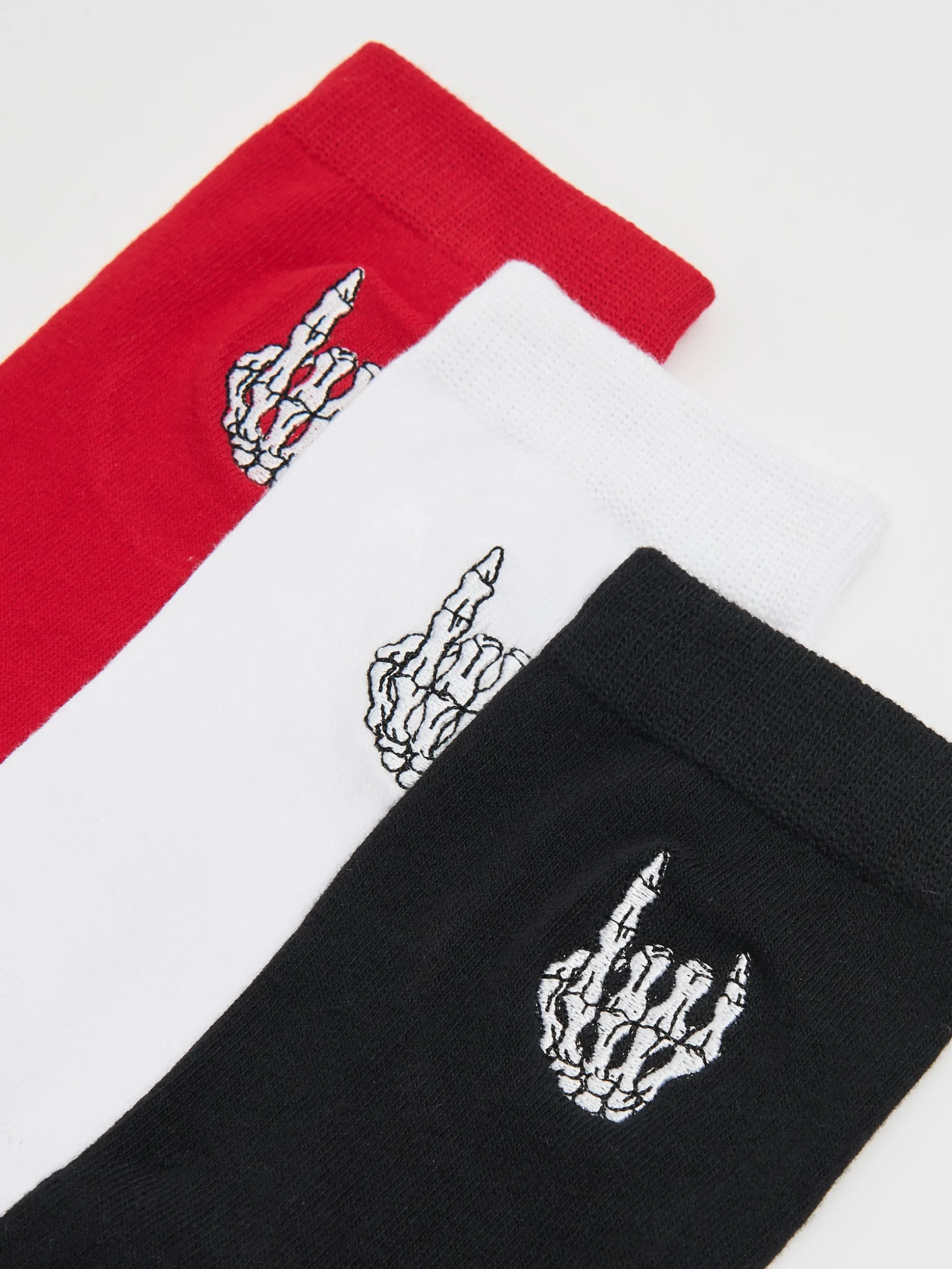 Zestaw pięciu męskich, długich skarpet, uszytych z mieszanki dzianin w kolorach – białym, czarnym i czerwonym. Na każdej parze brandowy napis i nadruk w stylu death art. dzianinowy materiał z bawełną dłuższy, prosty krój naszywka Cropp nadruki z dłonią kościotrupa