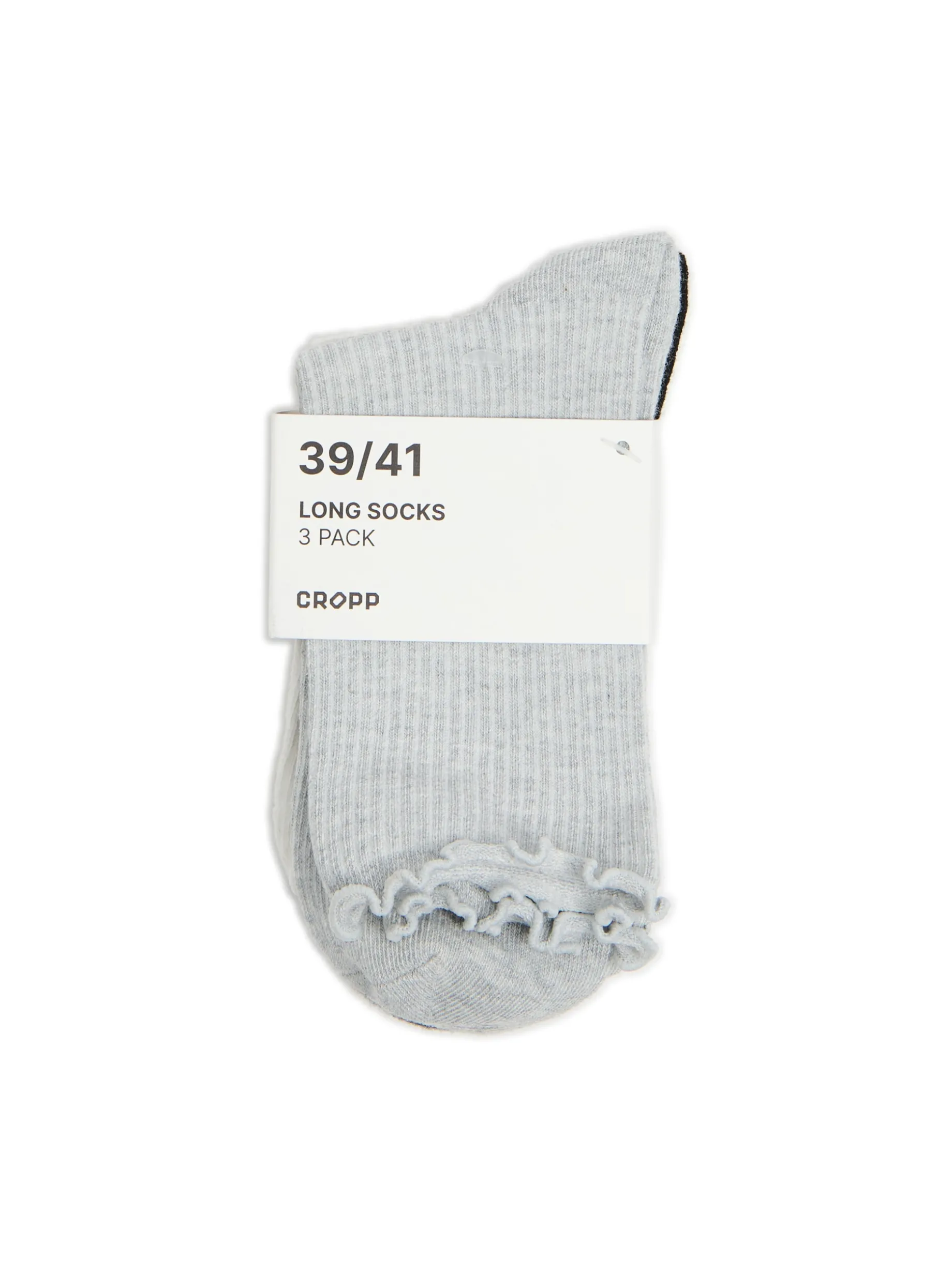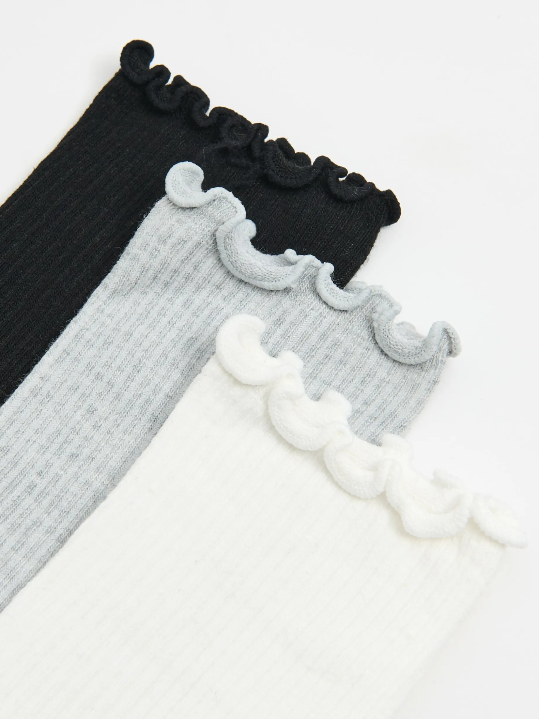 Zestaw trzech par długich skarpet, uszytych z dzianiny o wysokiej zawartości bawełny. Stonowane kolory i delikatna, ozdobna falbanka uzupełnią Twoją stylizację. dzianinowy materiał z bawełną dłuższy, prosty krój ozdobne wstawki