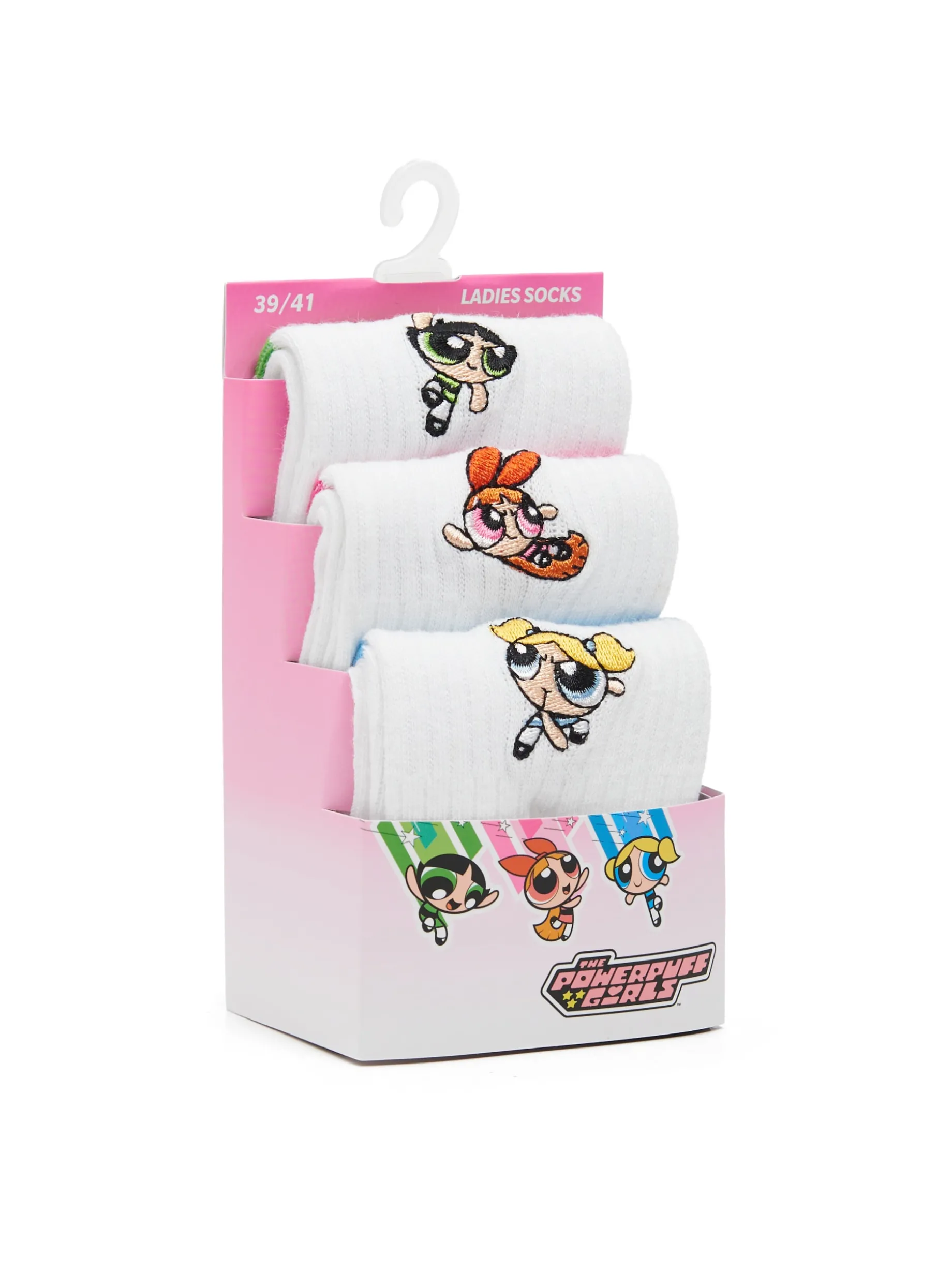 Zestaw 3 par damskich długich skarpetek, ozdobionych haftami z motywem postaci z kreskówki „Atomówki”. Uszyte z dzianiny zawierającej bawełnę. Idealne jako prezent – opakowane w ozdobne pudełeczko. TM & © Cartoon Network
