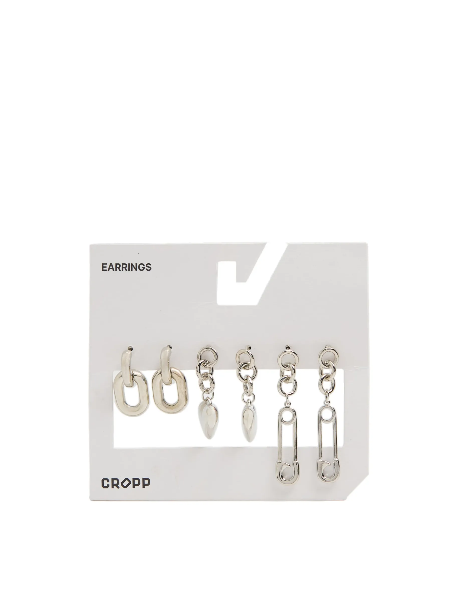 Trójpak damskich kolczyków z zawieszkami w różnych kształtach – m. in. serca i agrafki. Wykonane z tworzywa w kolorze srebrnym.