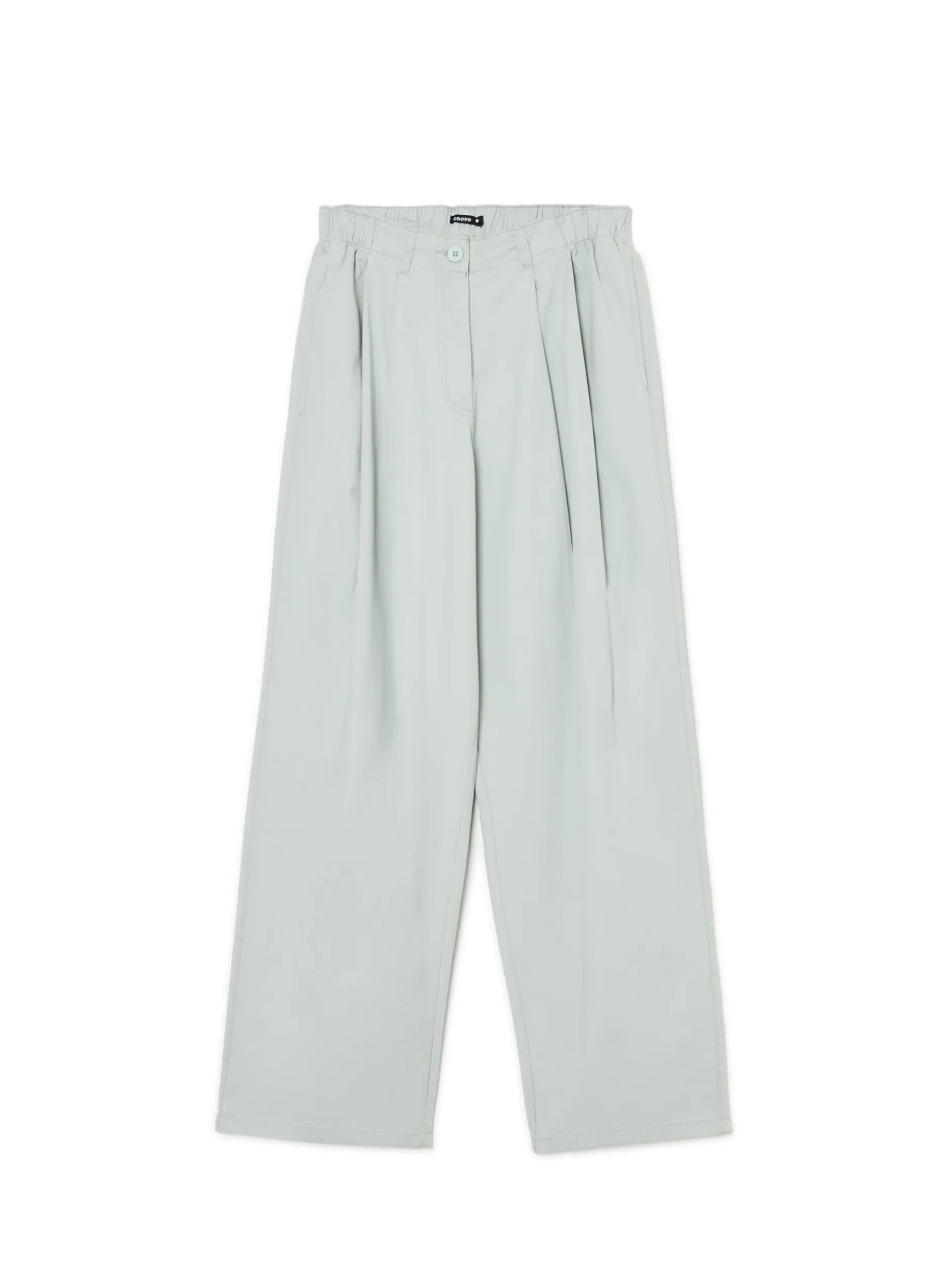 Damskie spodnie o kroju wide leg, uszyte z bawełny. Dzięki specjalnym zakładkom modelującym, ten item będzie się pięknie prezentował. 100% bawełny długie, szerokie nogawki zapięcie na zamek i guzik elastyczna gumka w pasie dwie kieszenie z przodu dwie naszyte kieszenie tylnie modelujące zakładki z przodu szlufki na pasek Wzrost modelki: 172 cm
