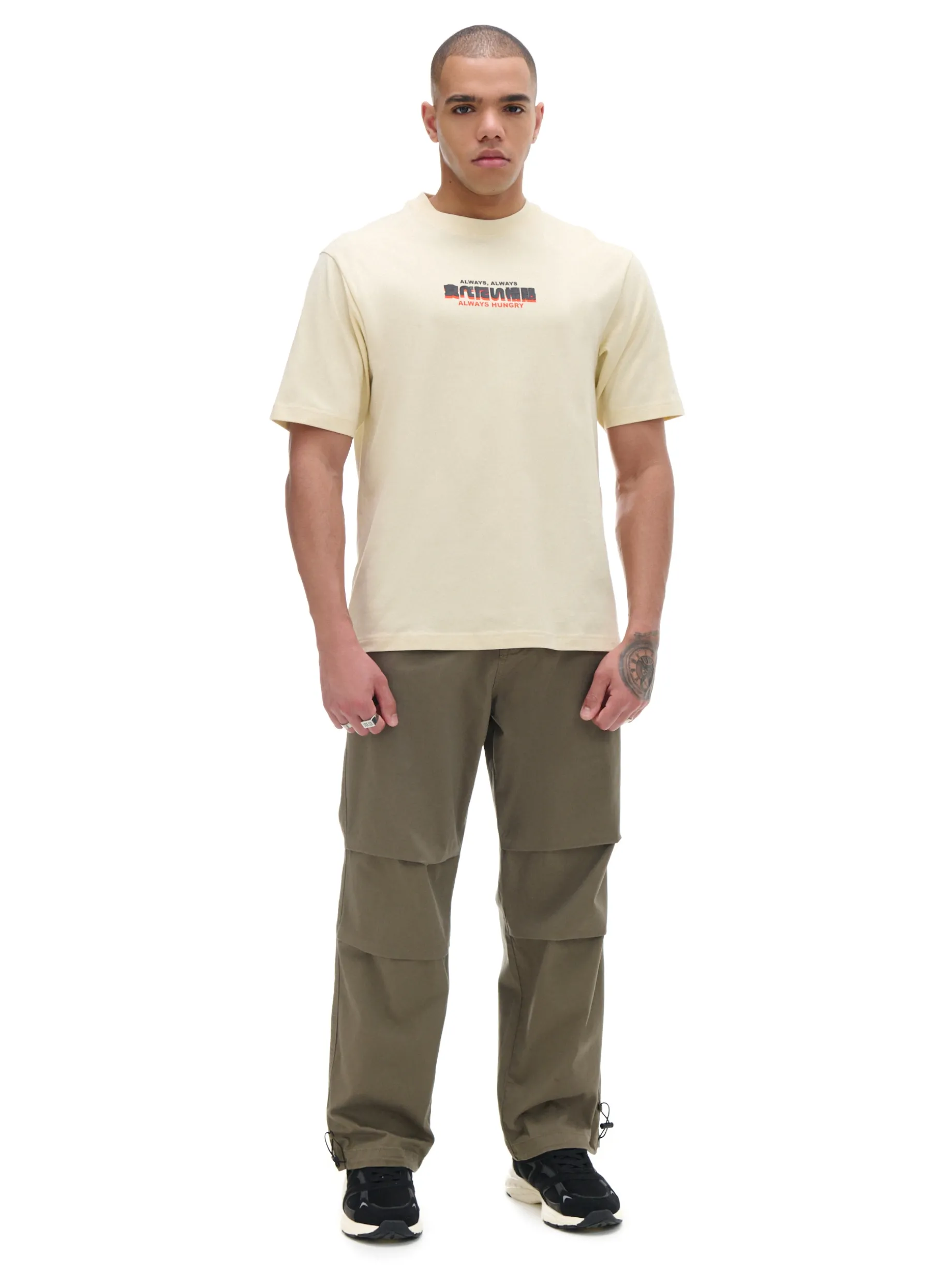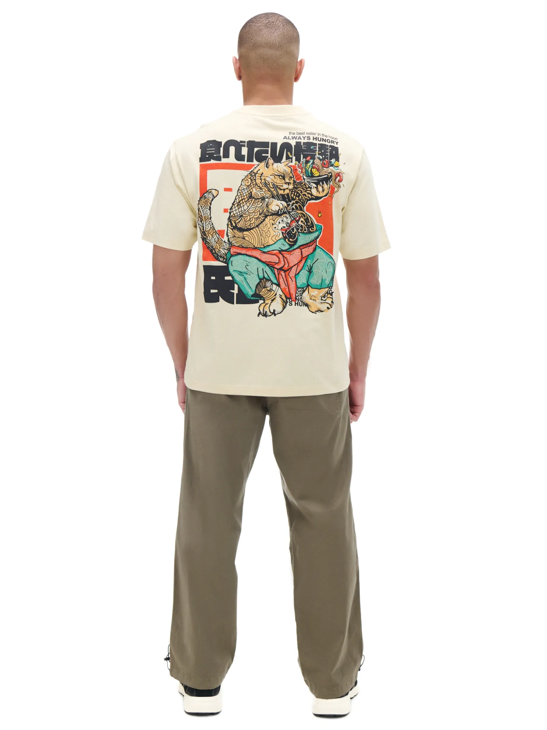 Męska kremowa koszulka, uszyta w 100% z bawełny. fason comfort krótkie rękawy z przodu nadruk typu puff print na plecach duży nadruk z motywem kota jedzącego ramen