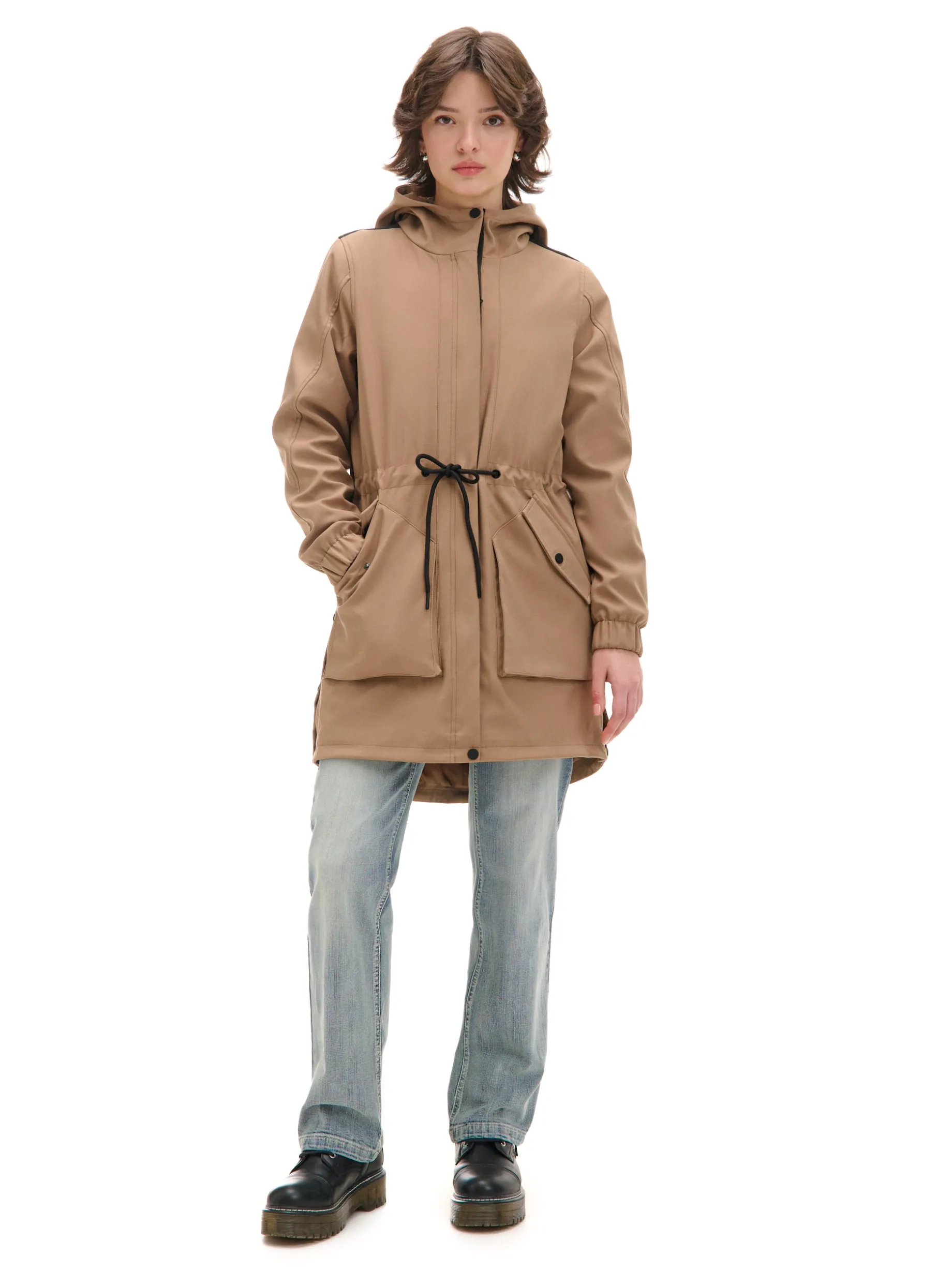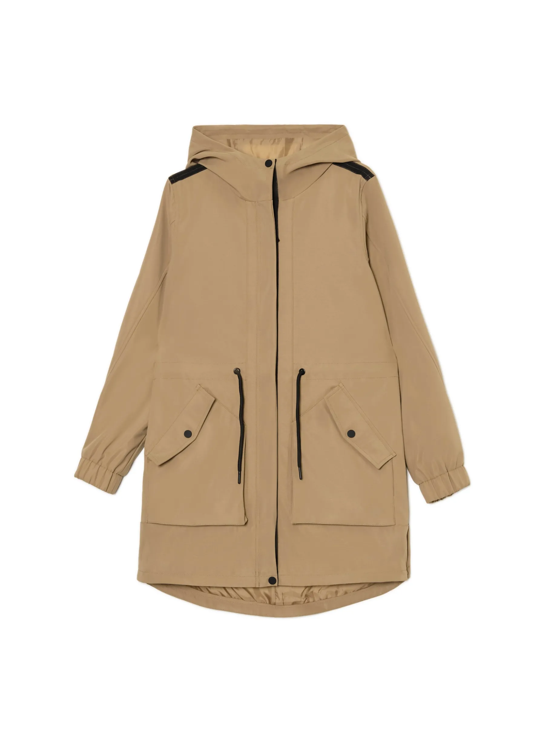 Damski płaszcz typu parka, uszyty z gładkiej beżowej tkaniny. Idealny na deszczowe jesienne dni i nie tylko! regularny krój wewnątrz wykończenie na gładkiej podszewce zapięcie na zamek ukryty pod listwą z napami zapięcie na zatrzask na dole szeroki kaptur zapinany na zatrzask długie rękawy ze ściągaczem wewnątrz mankietów regulacja w talii za pomocą sznurka kieszenie boczne z zatrzaskami ozdobne patki na ramionach