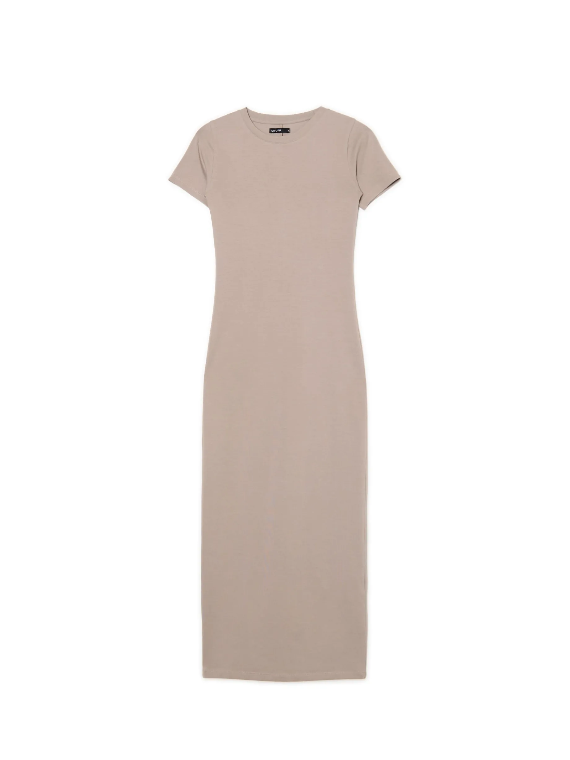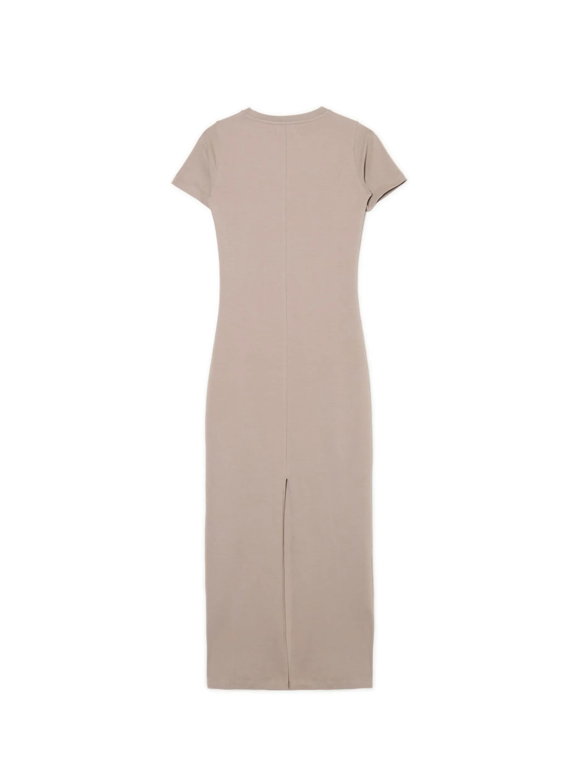 Damska sukienka maxi o dopasowanym kroju, uszyta z mieszanki dzianin z bawełną. Dobierz do tego modelu swoje ulubione dodatki i ruszaj na miasto! bawełna z dodatkiem elastycznych włókien długość maxi i dopasowany krój krótkie, ścięte rękawy półokrągły dekolt z lamówką Wzrost modelki: 172 cm