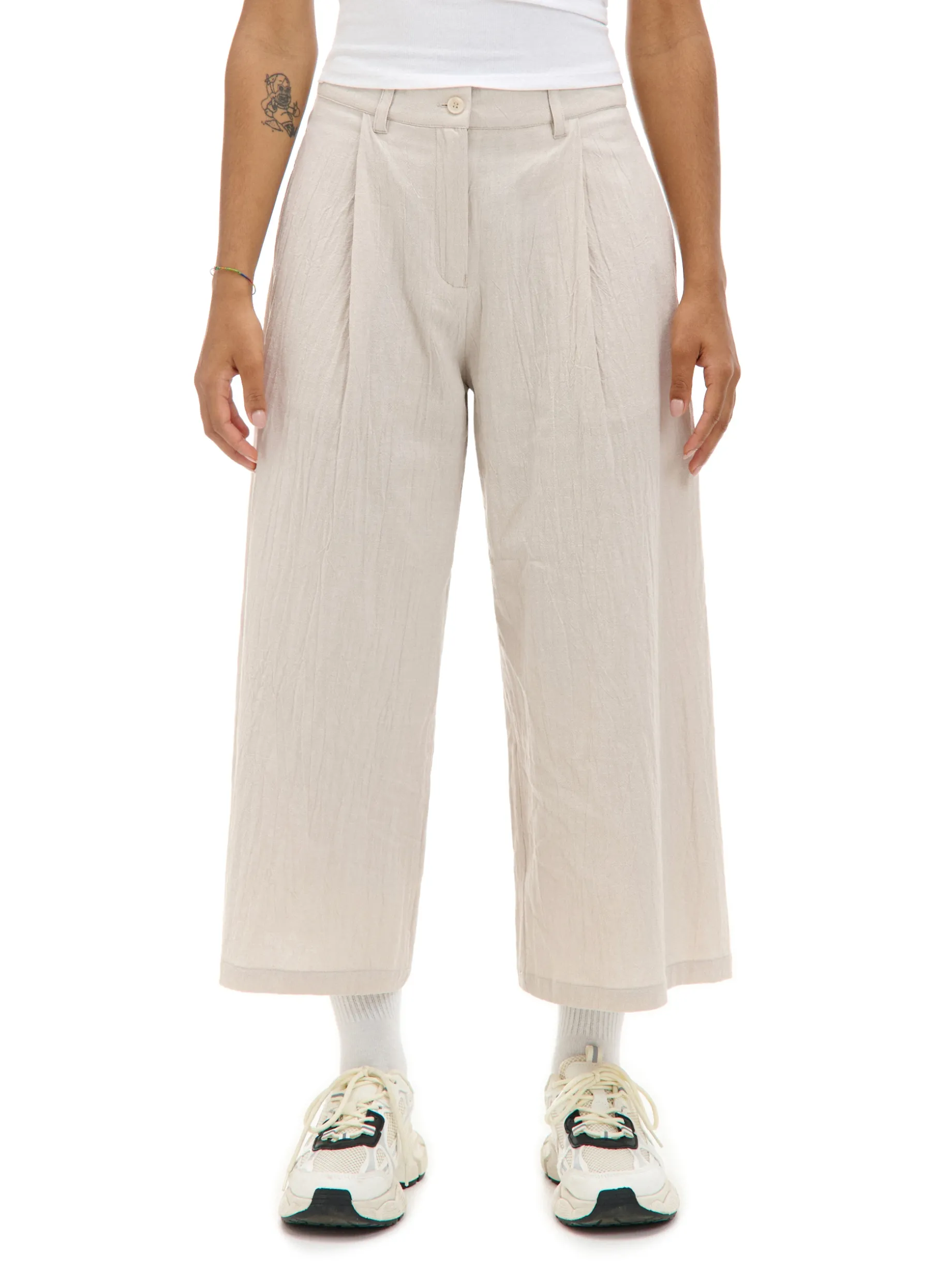 Tkaninowe damskie spodnie w kolorze beżowym, uszyte z bawełny. Kuloty są idealnym dodatkiem zarówno do eleganckich stylizacji, jak i casualowych. 100% bawełny spodnie typu kuloty zapięcie na zamek i guzik modelujące zakładki z przodu szerokie nogawki dwie kieszenie po bokach szlufki blisko siebie