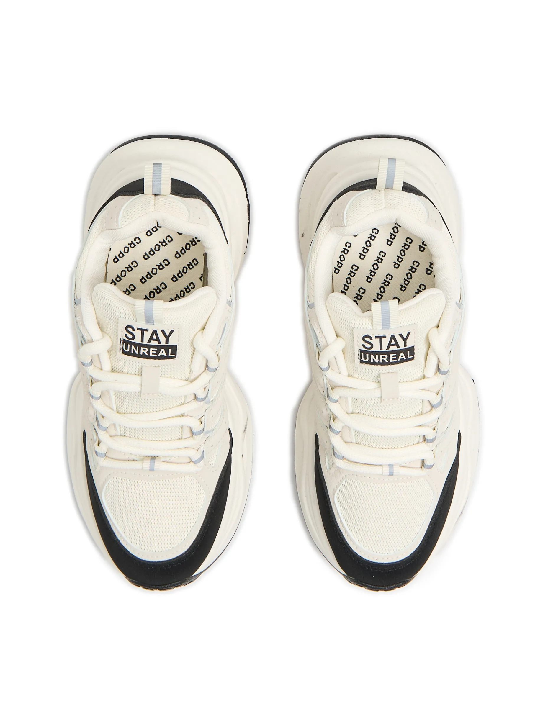 Damskie sneakersy, wykonane z m. in. imitacji zamszu i gumy termoplastycznej. Odpowiednie na sezon przejściowy. niska, elastyczna cholewka gruba, solidna podeszwa wiązanie na białe okrągłe sznurówki kontrastowe naszywki na języku naszywka z hasłem STAY UNREAL wstawki z efektem reflective
