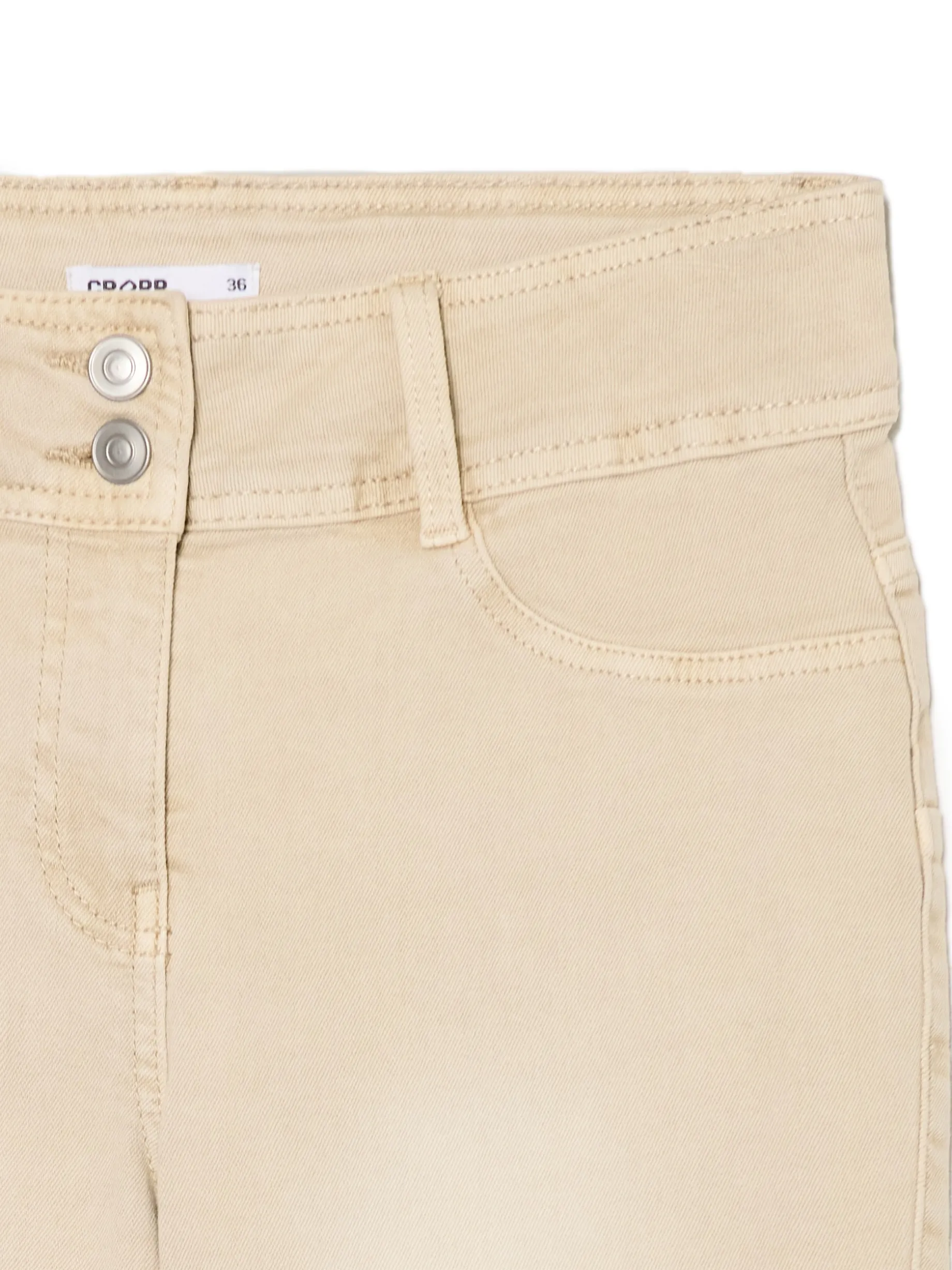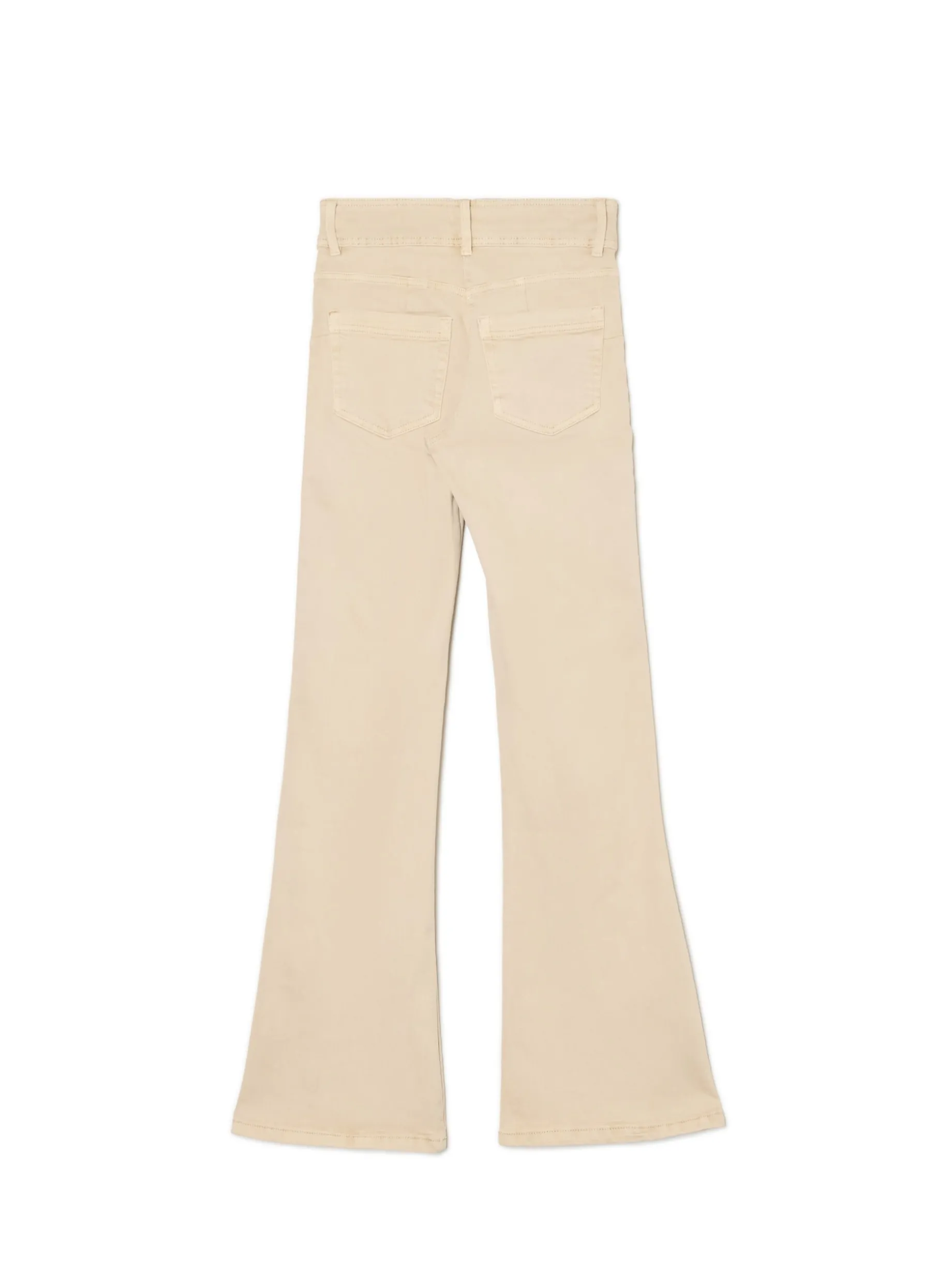 Damskie spodnie uszyte z trwałej i elastycznej tkaniny. Ciekawe zapięcie na 2 guziki i ozdobny efekt sprania na nogawkach wyróżniają ten model. bawełna z dodatkiem elastycznych włókien spodnie o kroju flare regularny stan zapięcie na dwa guziki i zamek długie nogawki rozszerzane u dołu imitacja kieszeni z przodu naszywane kieszenie z tyłu ozdobne zakładki z tyłu lekki efekt sprania na udach szerokie szlufki na pasek Wzrost modelki: 177 cm