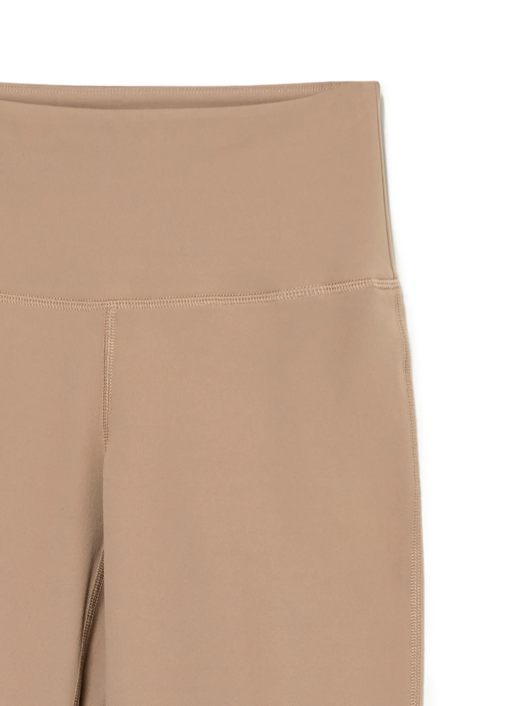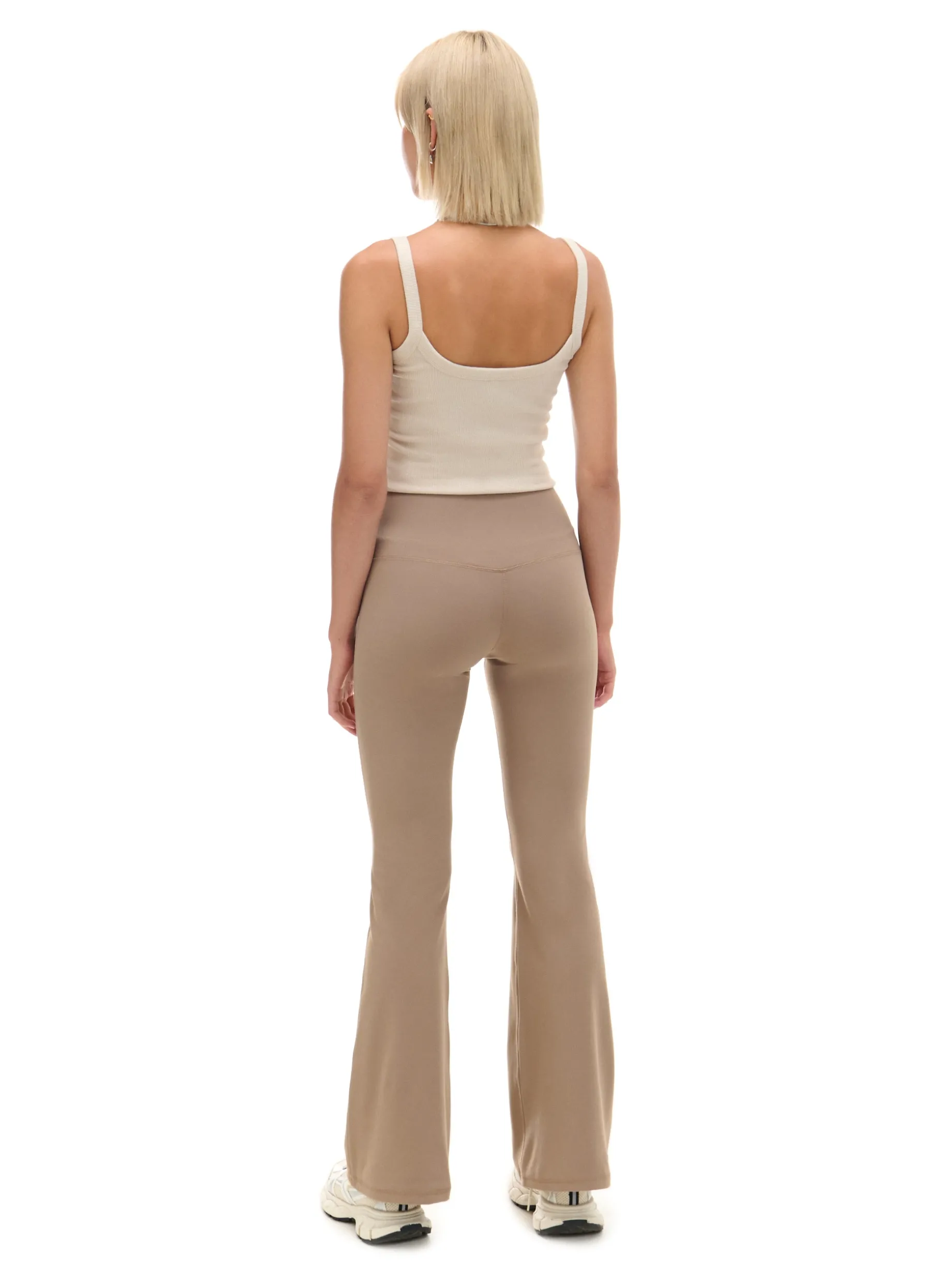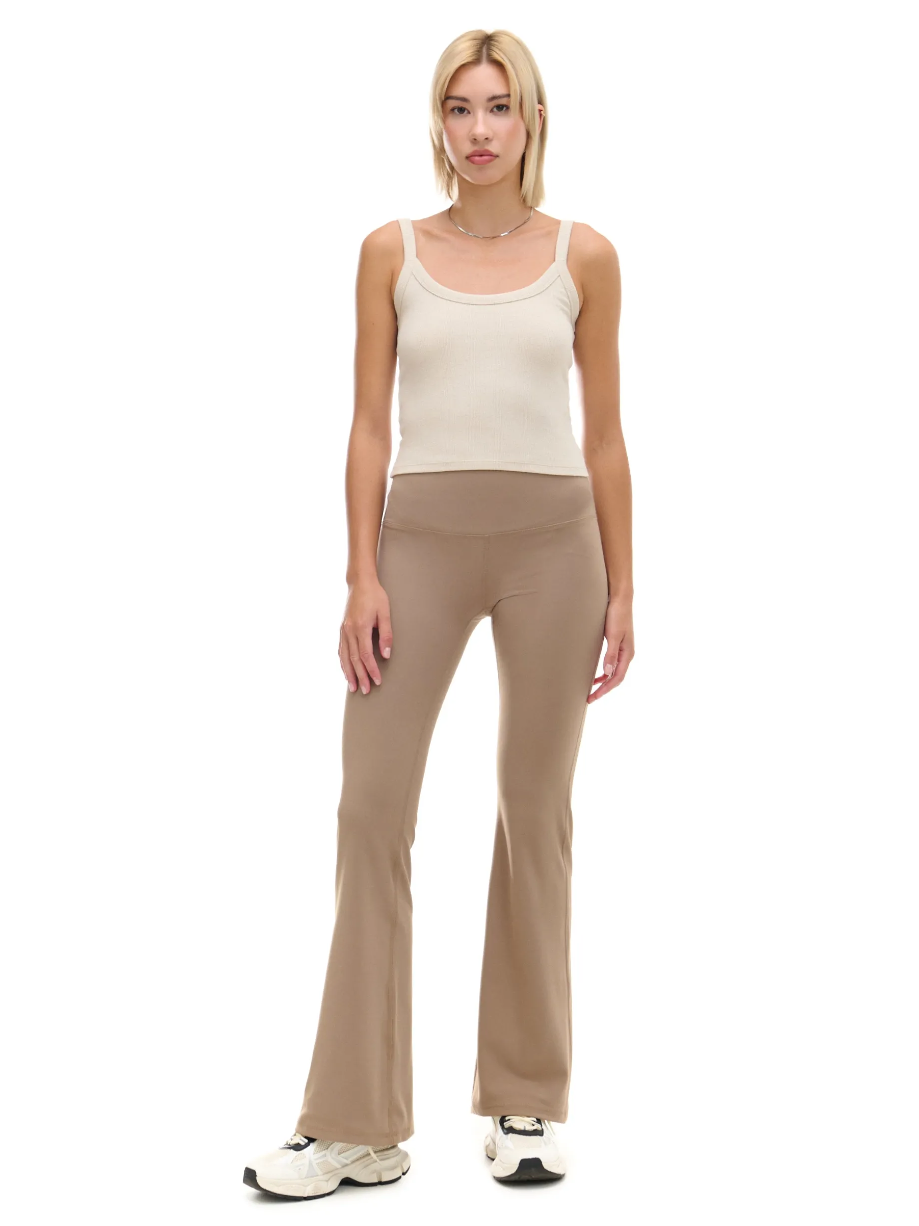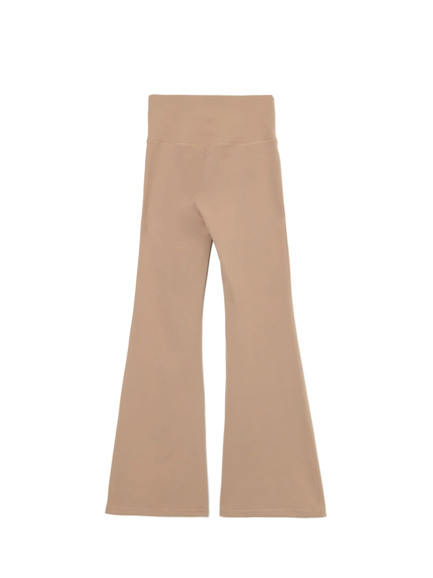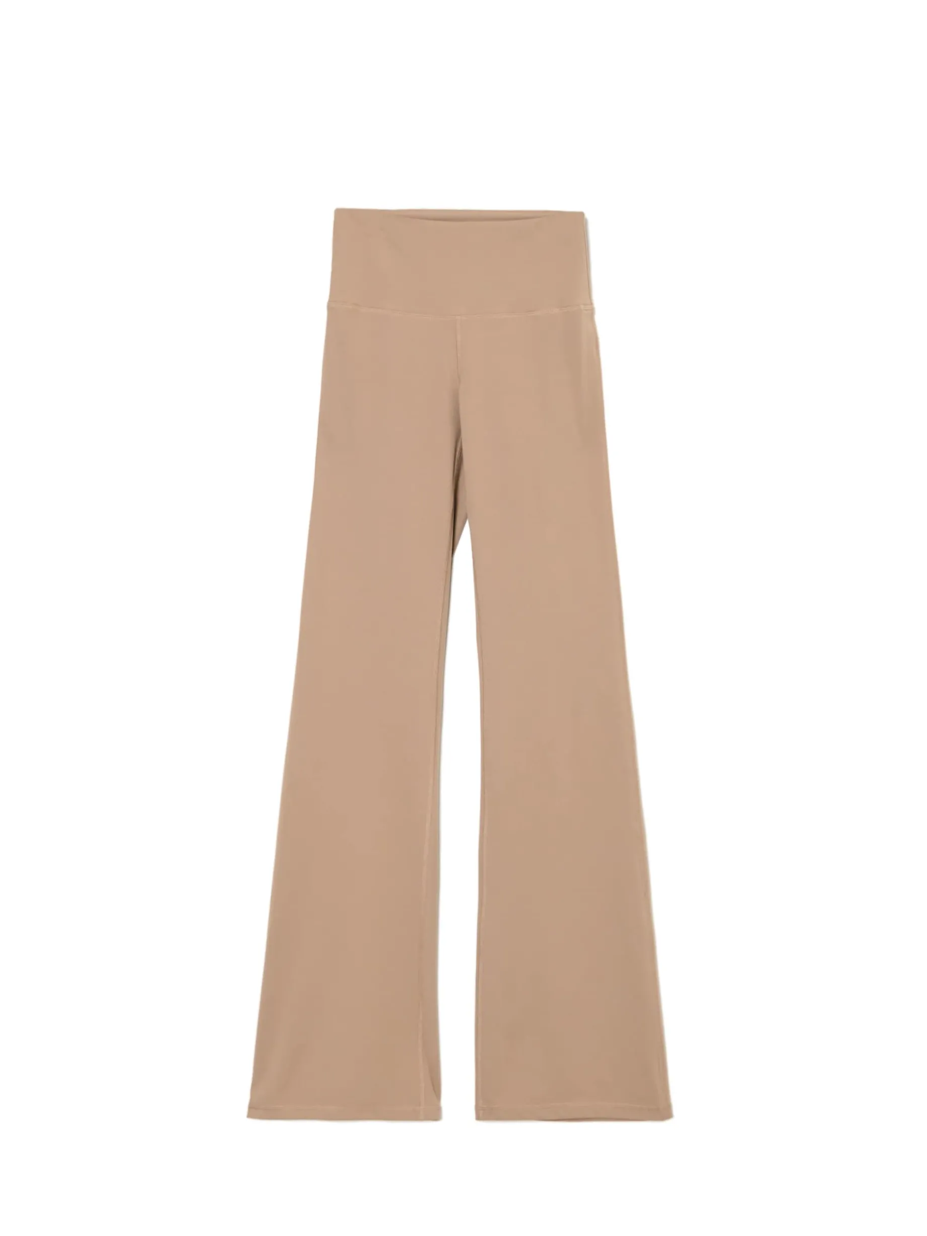 Beżowe spodnie z wysokim stanem, uszyte z mieszanki dzianin z dodatkiem elastycznych włókien. Posiadają wygodne, długie nogawki rozszerzone na dole, idealne na jesień! dzianina z domieszką elastycznych włókien wysoki stan długie nogawki rozszerzane u dołu Wzrost modelki: 177 cm