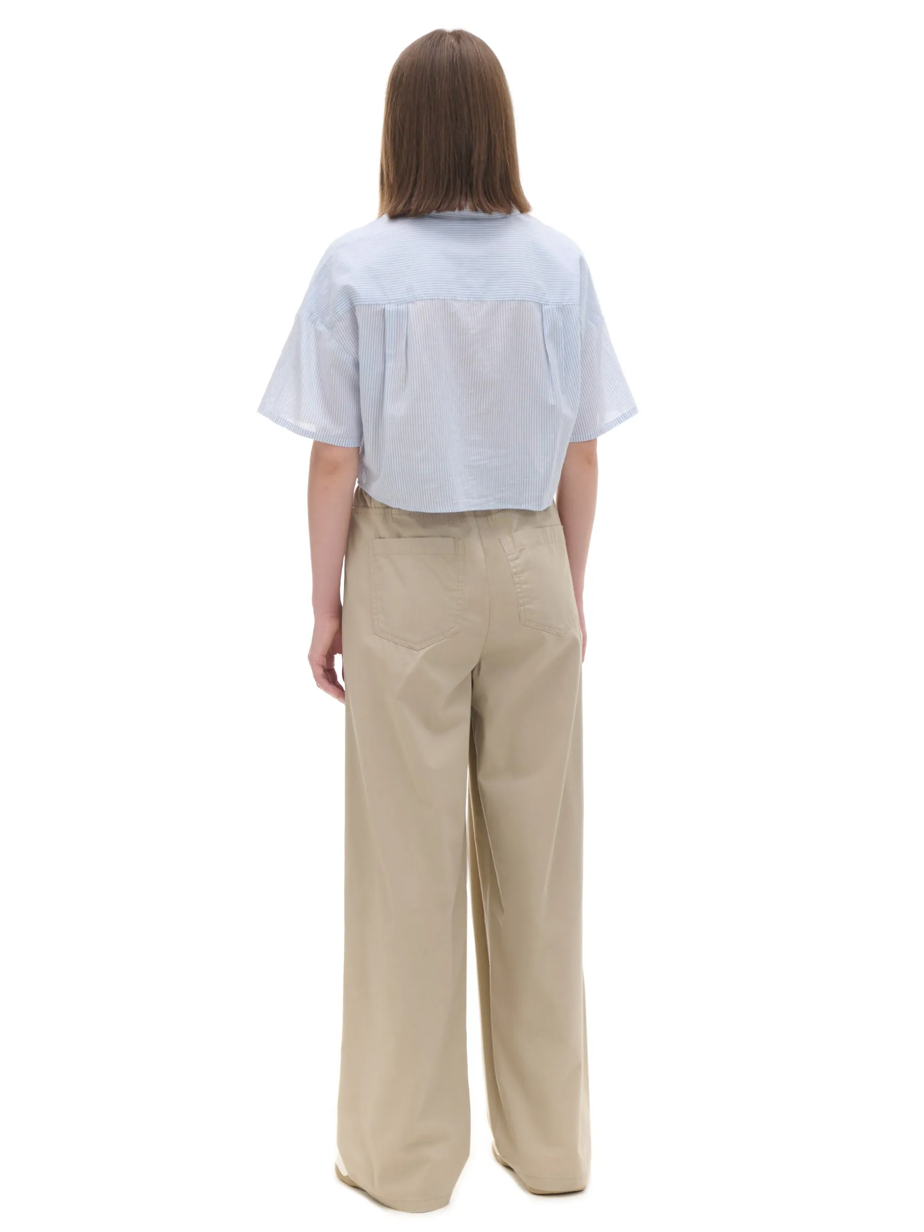 Damskie spodnie o kroju wide leg, uszyte z bawełny. Dzięki specjalnym zakładkom modelującym, ten item będzie się pięknie prezentował. 100% bawełny długie, szerokie nogawki zapięcie na zamek i guzik elastyczna gumka w pasie dwie kieszenie z przodu dwie naszyte kieszenie tylnie modelujące zakładki z przodu szlufki na pasek Wzrost modelki: 172 cm