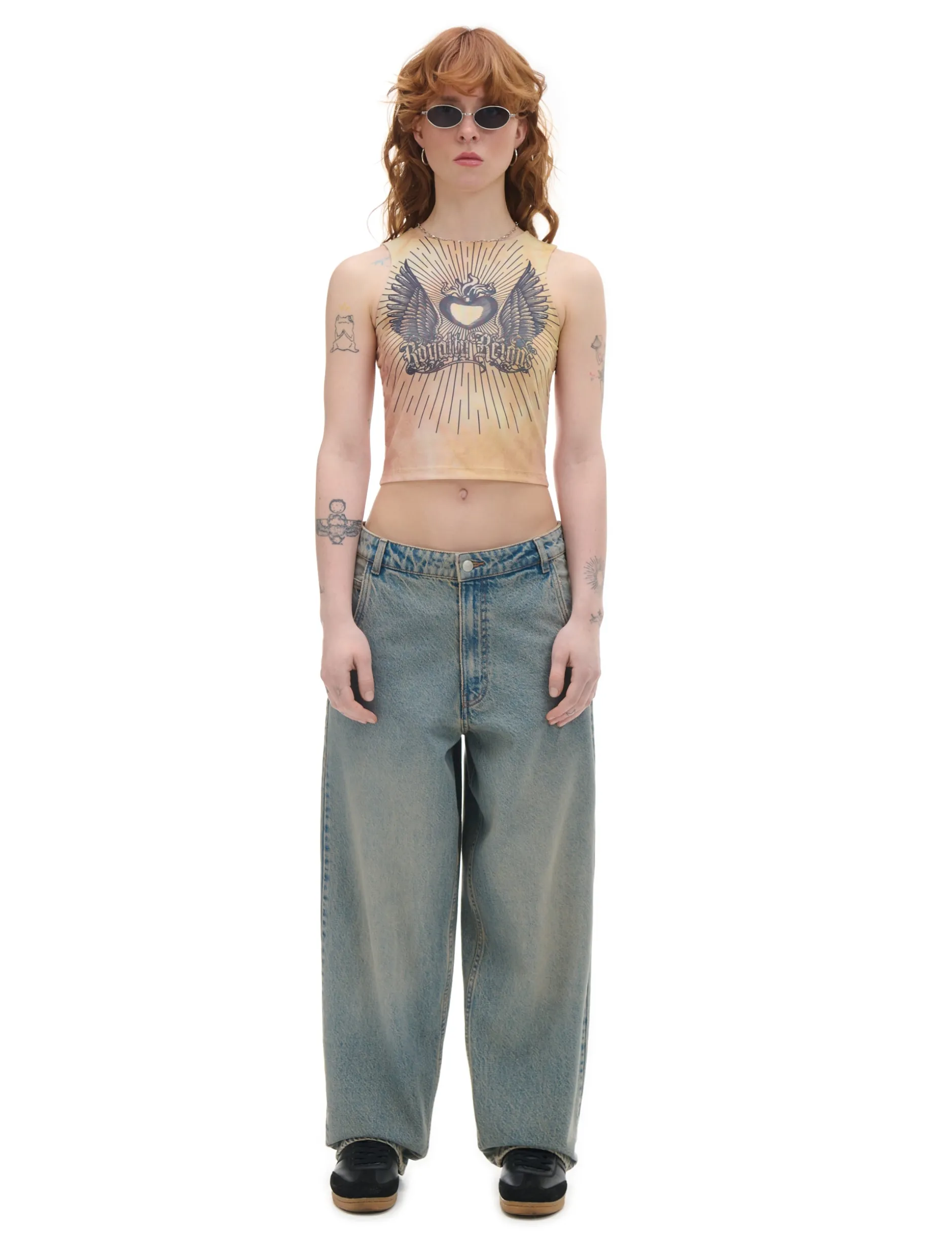 Damski top na ramiączkach z okrągłym dekoltem i printem dla rockowej dziewczyny.