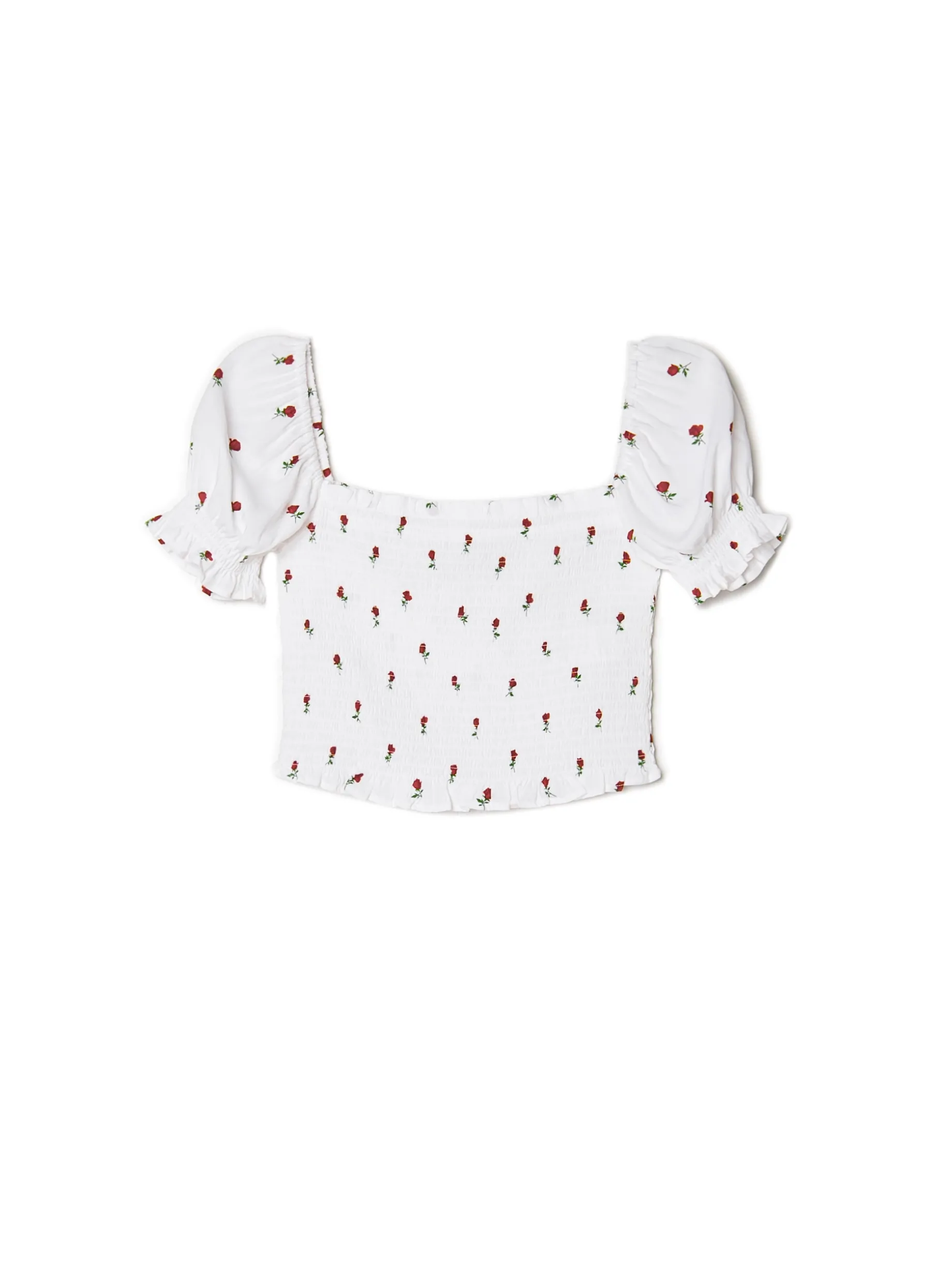 Bluzka damska typu crop top, uszyta z wiskozowej tkaniny. dopasowany krój podkreślający sylwetkę kwadratowy dekolt z przodu i z tyłu krótkie, bufiaste rękawy zakończone gumką ozdobne marszczenia dół wykończony falbaną kwiatowy wzór dostępne inne warianty kolorystyczne Wzrost modelki: 172 cm