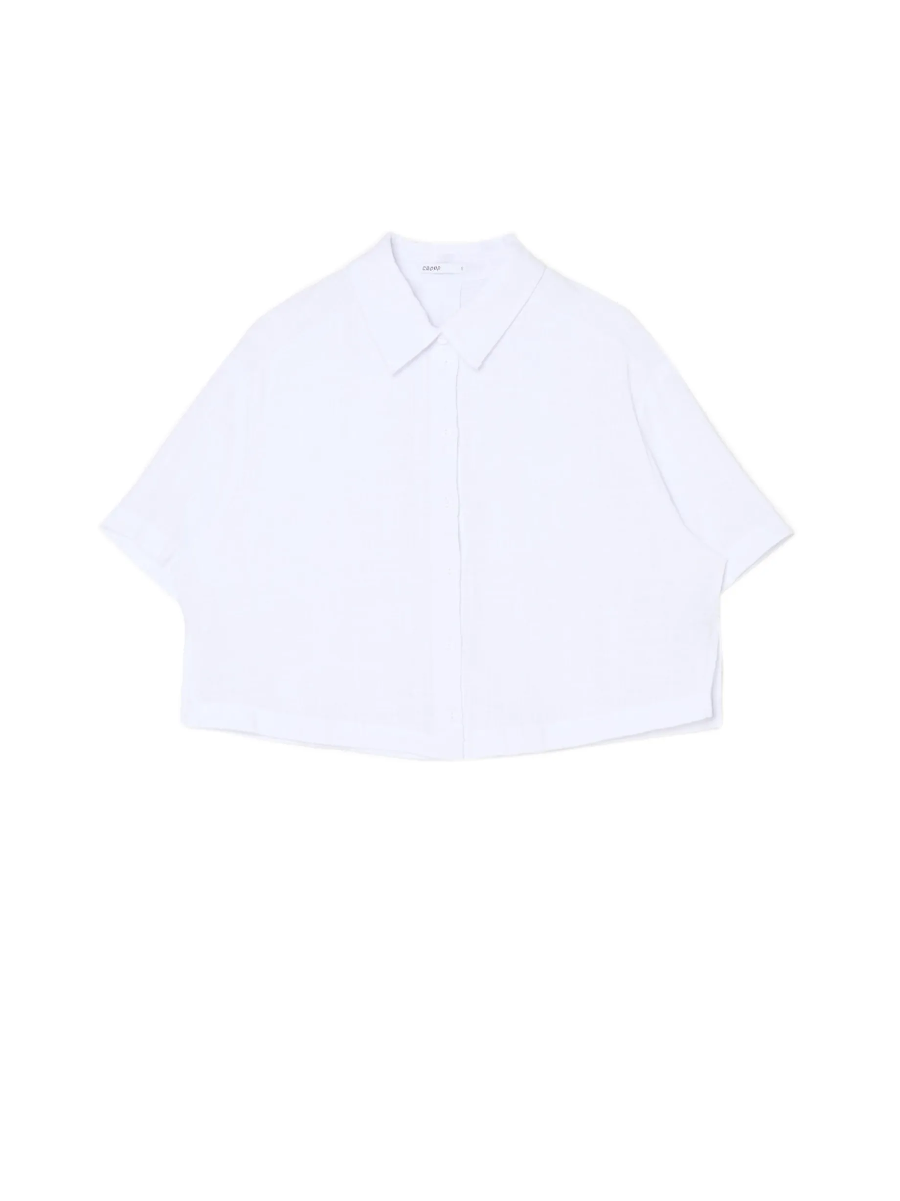 Damska luźna koszula, uszyta z bawełnianej tkaniny o wyjątkowej fakturze. krótki, obszerny krój oversize krótkie, luźne rękawy zapięcie na drobne guziki klasyczny kołnierzyk Wzrost modelki: 177 cm