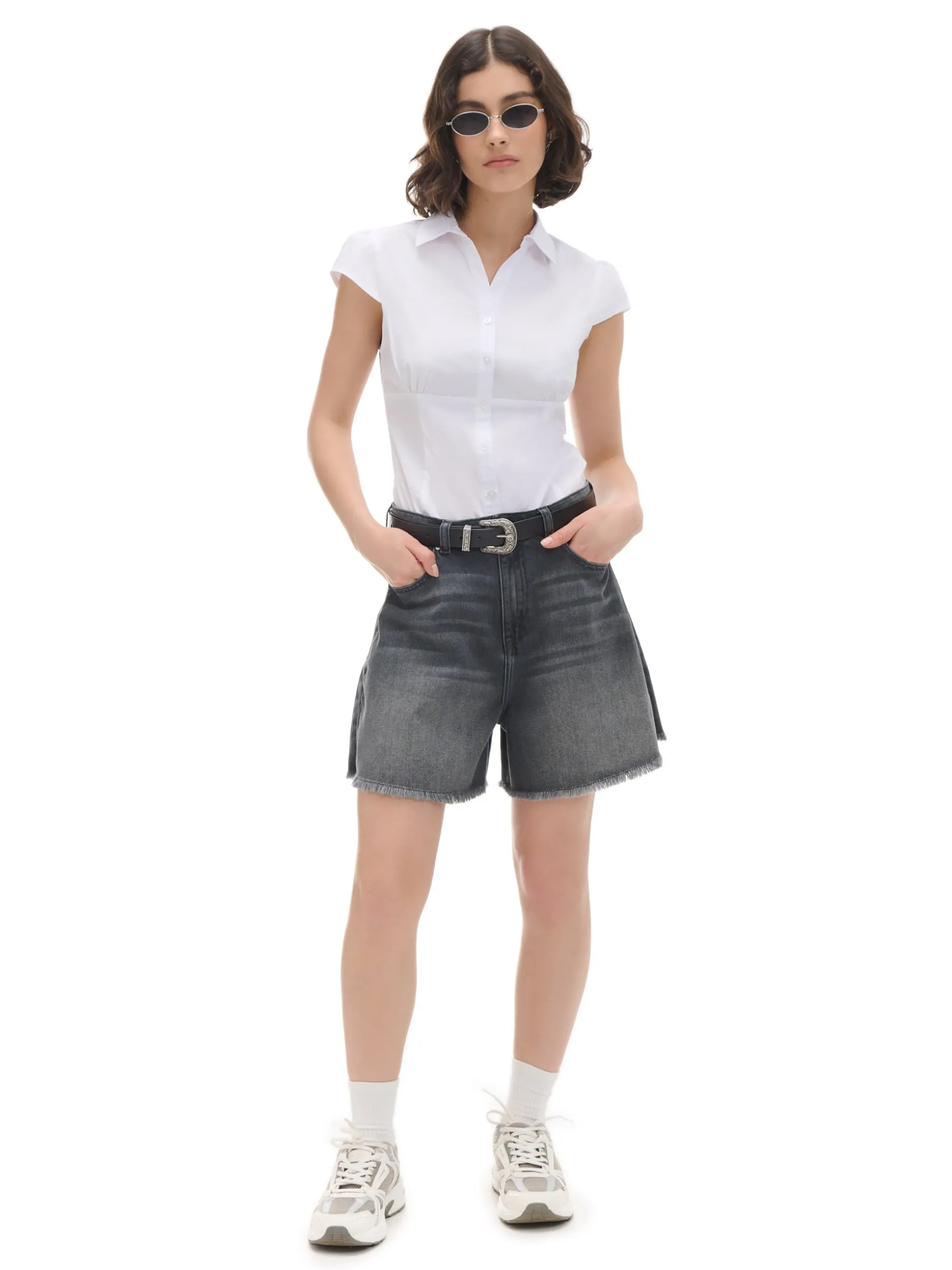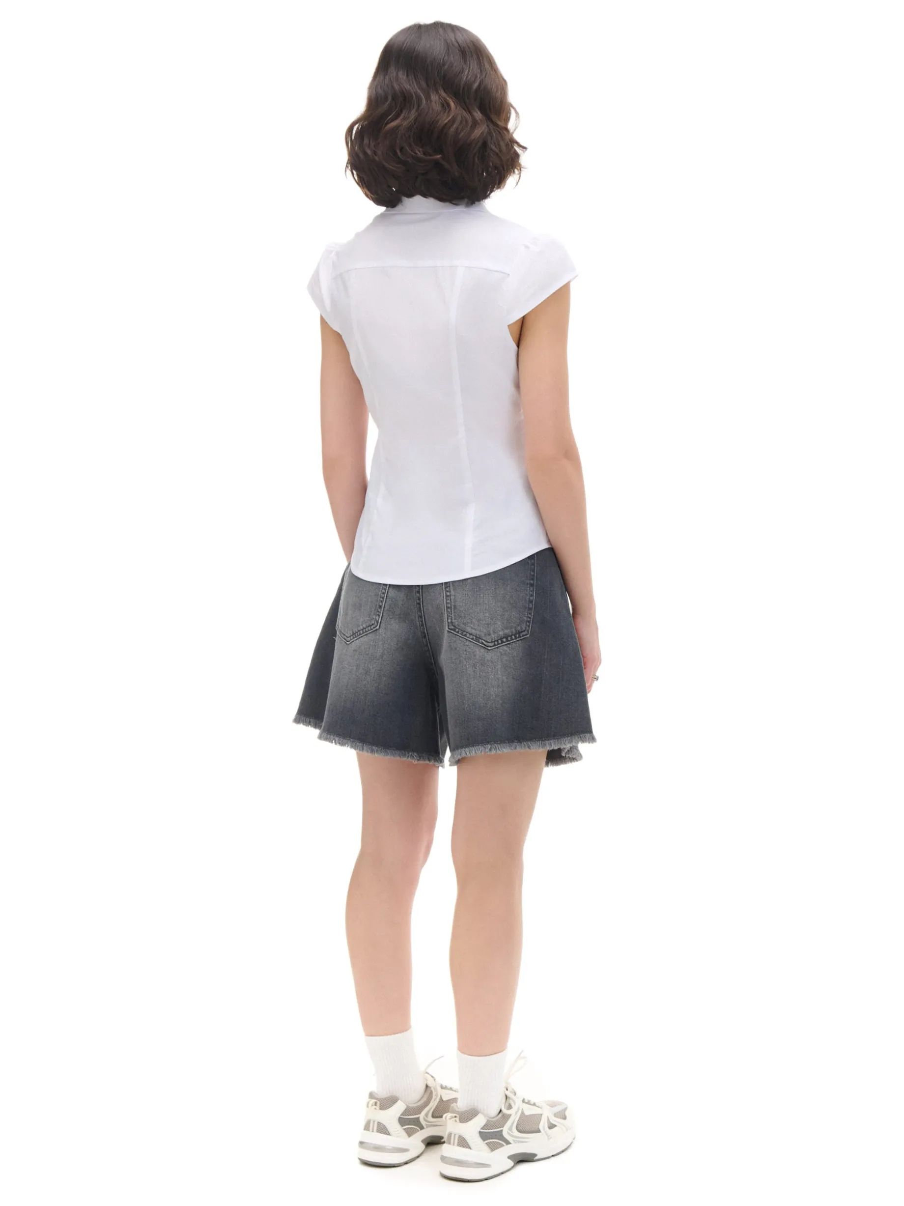 Biała damska koszula z krótkim rękawem i kołnierzykiem, uszyta z lekkiej tkaniny. Ten model fituje z casualowymi, jak i bardziej eleganckimi stylizacjami. uszyta z gładkiej tkaniny z dodatkiem elastanu jednorzędowe zapięcie na guziki klasyczny kołnierzyk krótkie, ścięte rękawy modelujące zakładki z przodu Wzrost modelki: 172 cm
