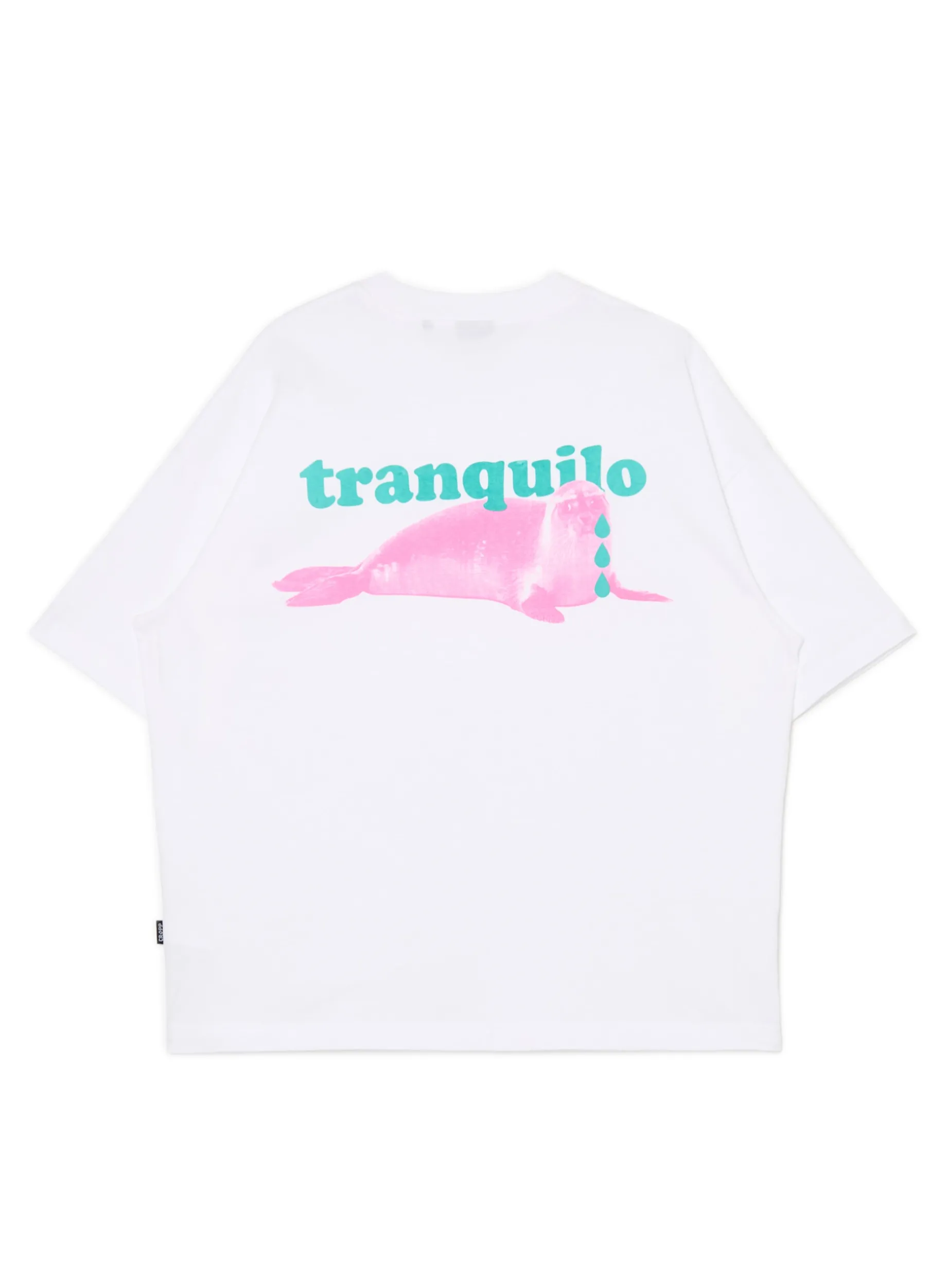 Męski T-shirt z krótkim rękawem, uszyty z bawełnianej dzianiny. Na przodzie delikatny napis, a na plecach nadruk z uroczą foczką. 100% bawełny obszerny krój boxy krótkie, swobodne rękawy mały nadruk na piersi, duży nadruk na plecach