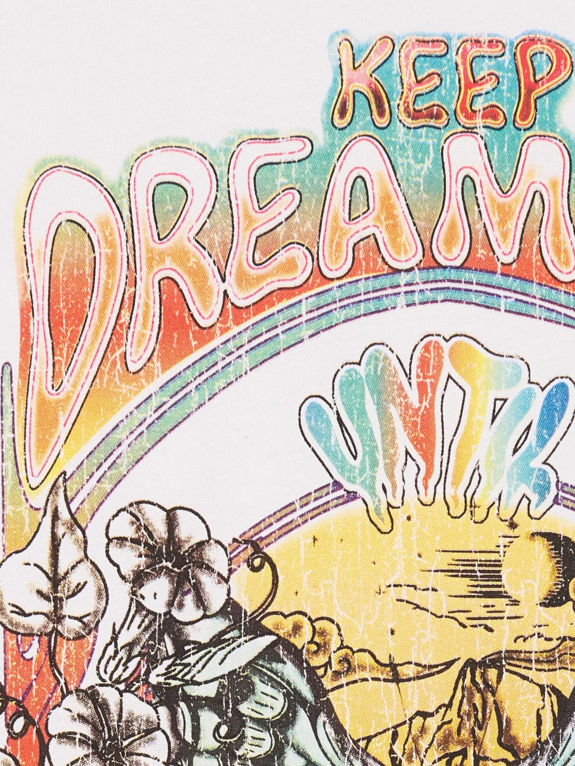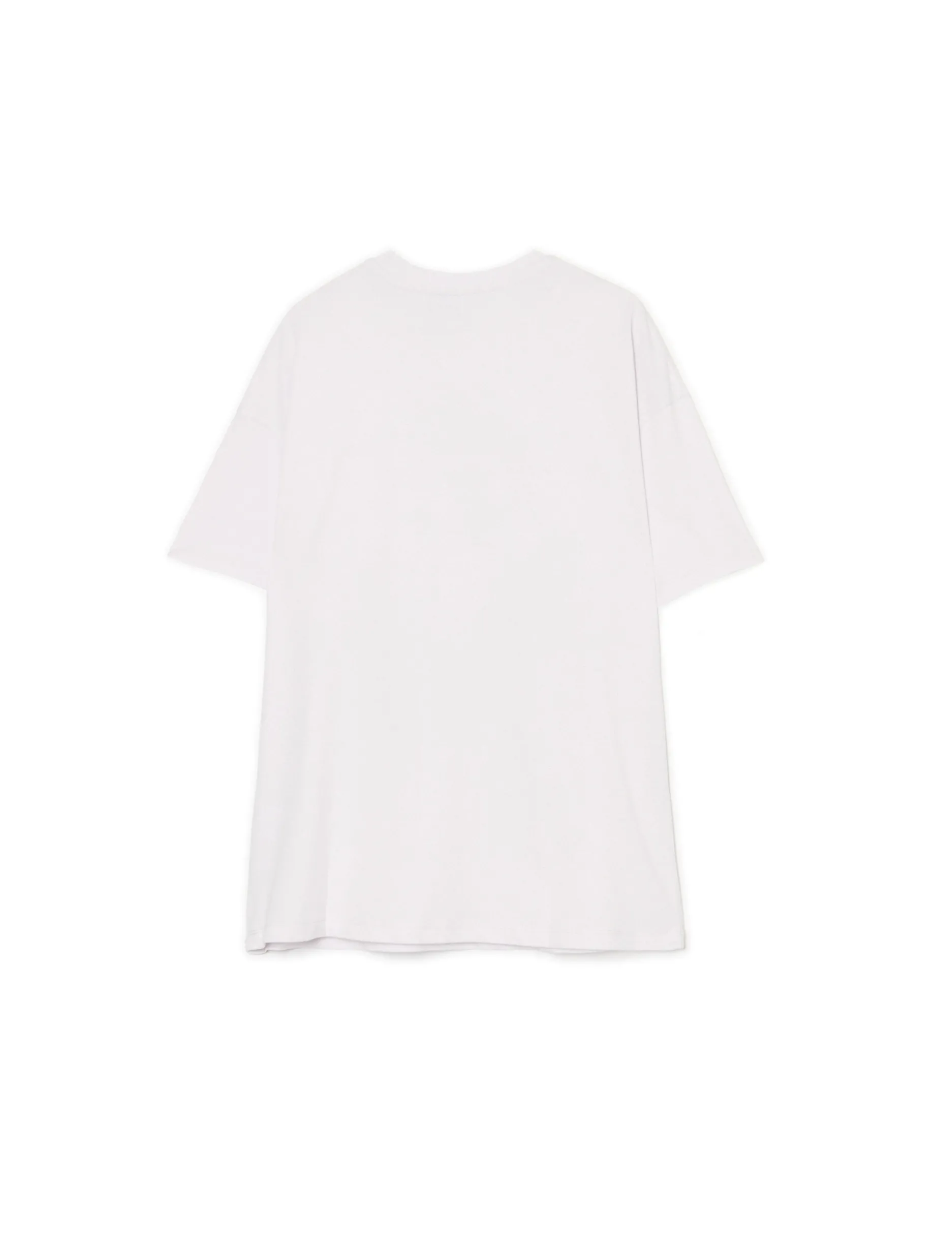 T-shirt damski uszyty z bawełnianej dzianiny z krótkim rękawem. Na przodzie wzorzysty, kolorowy nadruk z delikatnym efektem sprania. 100% bawełny krój oversize krótkie, swobodne rękawy z przodu kolorowy nadruk i napis Ten produkt należy do kolekcji UNISEX – zalecamy wybranie mniejszego rozmiaru niż zazwyczaj, jeśli chcesz uniknąć efektu oversize.