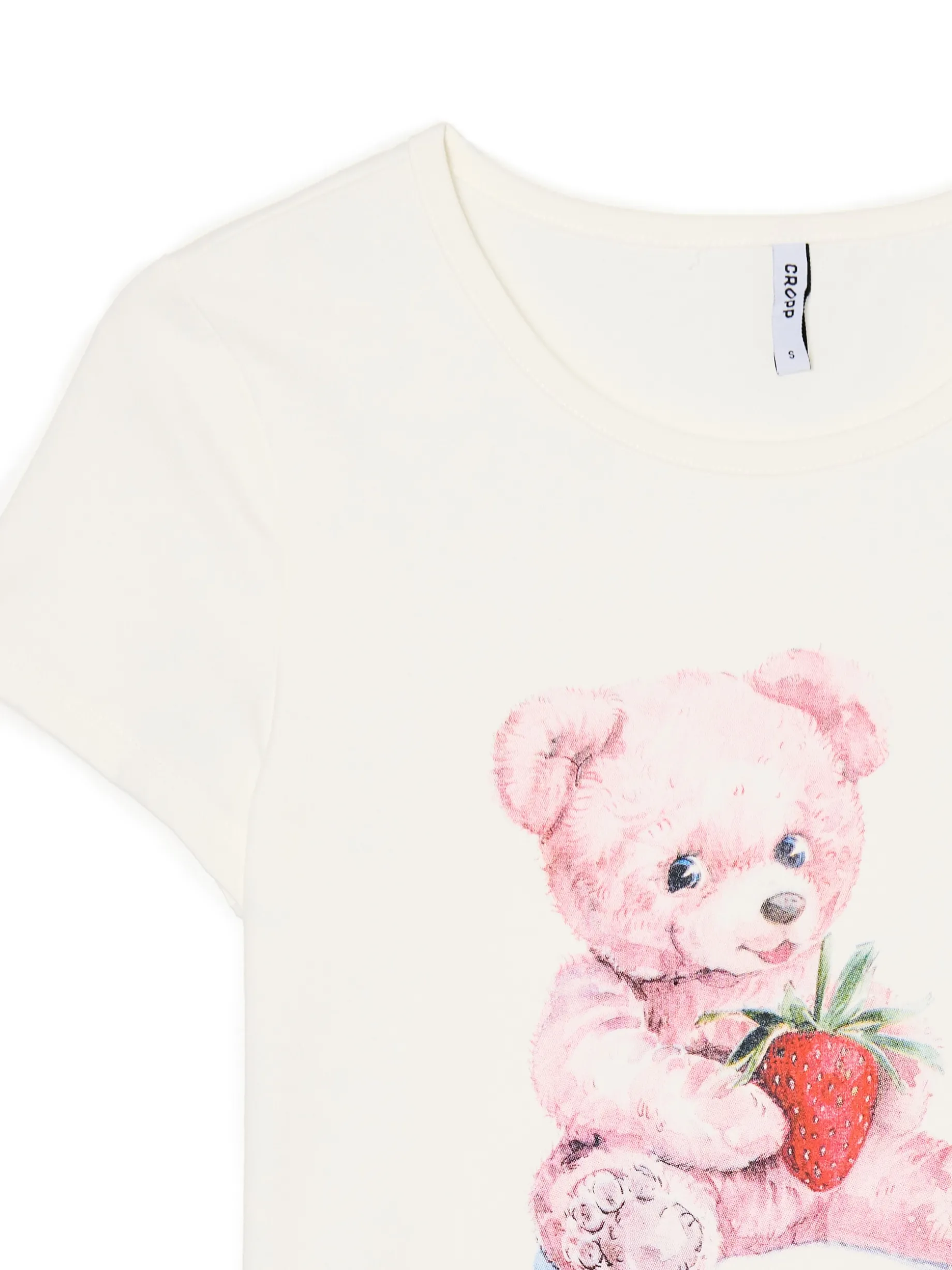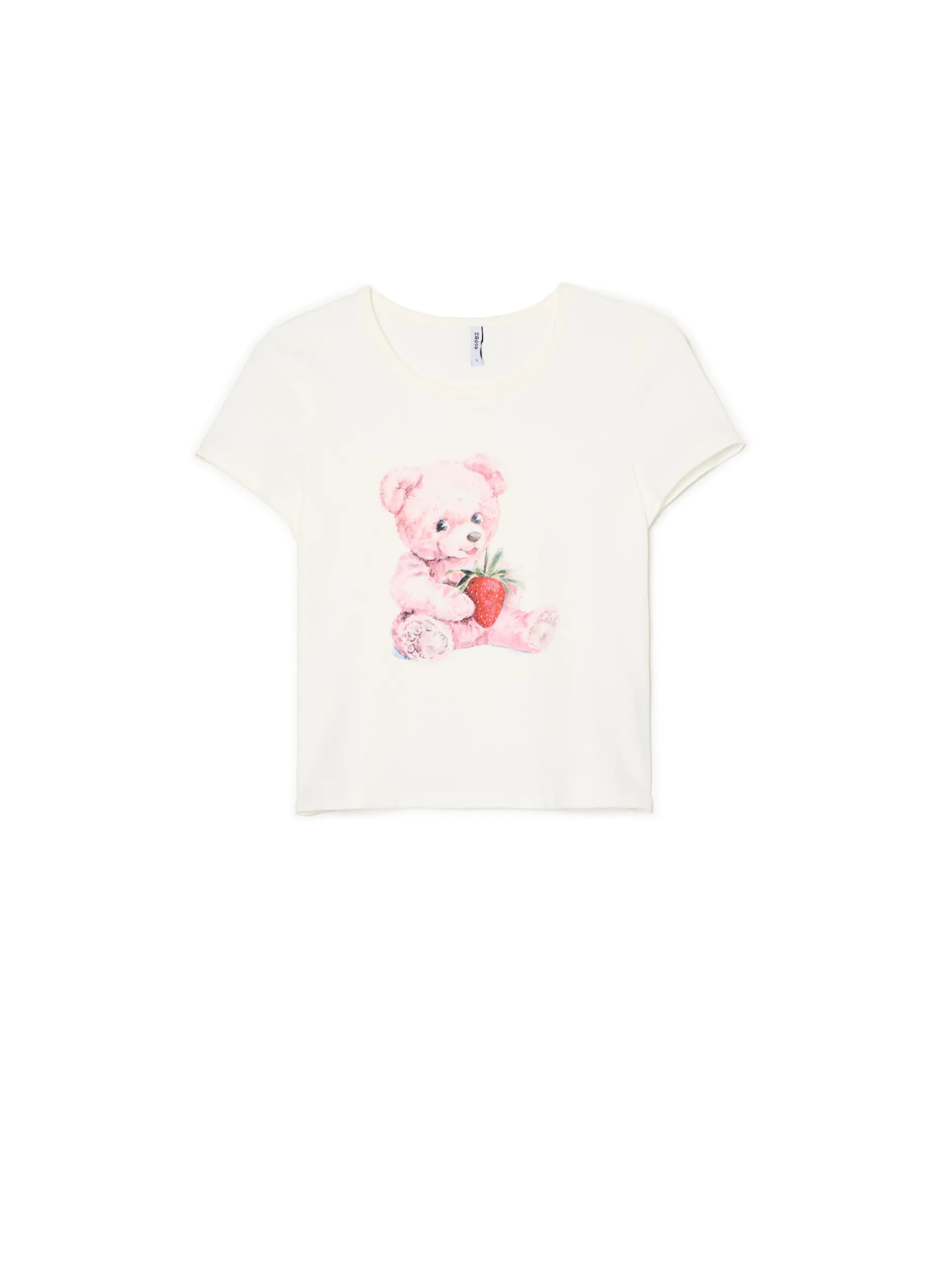 Damski T-shirt z krótkim rękawem uszyty z bawełnianej tkaniny z dodatkiem elastycznych włókien. Na przodzie duży nadruk z uroczym, różowym misiem trzymającym truskawkę. Wrzuć słodziaka do koszyka! bawełna z dodatkiem elastycznych włókien dopasowany krój podkreślający sylwetkę okrągły dekolt krótkie, ścięte rękawy oryginalny print