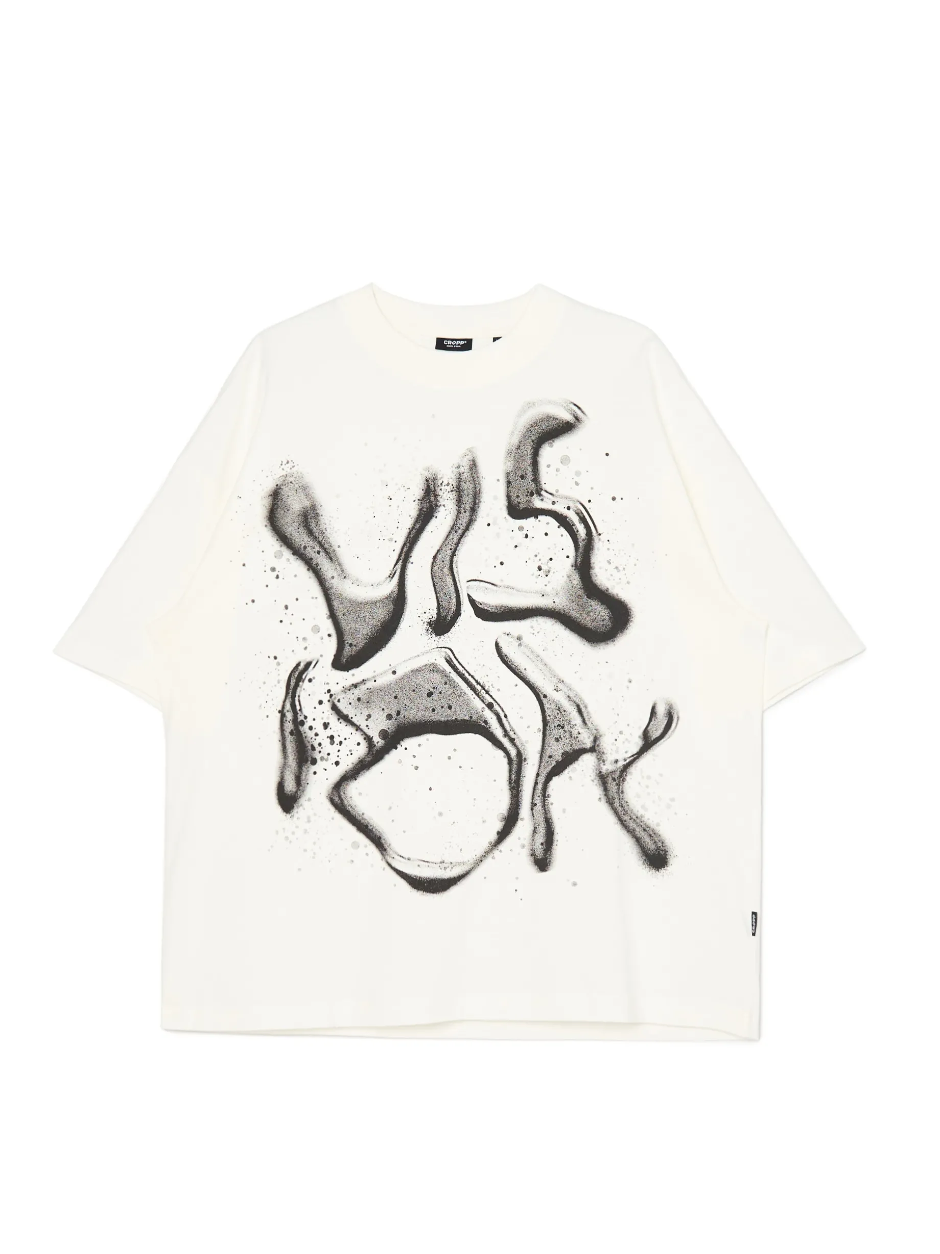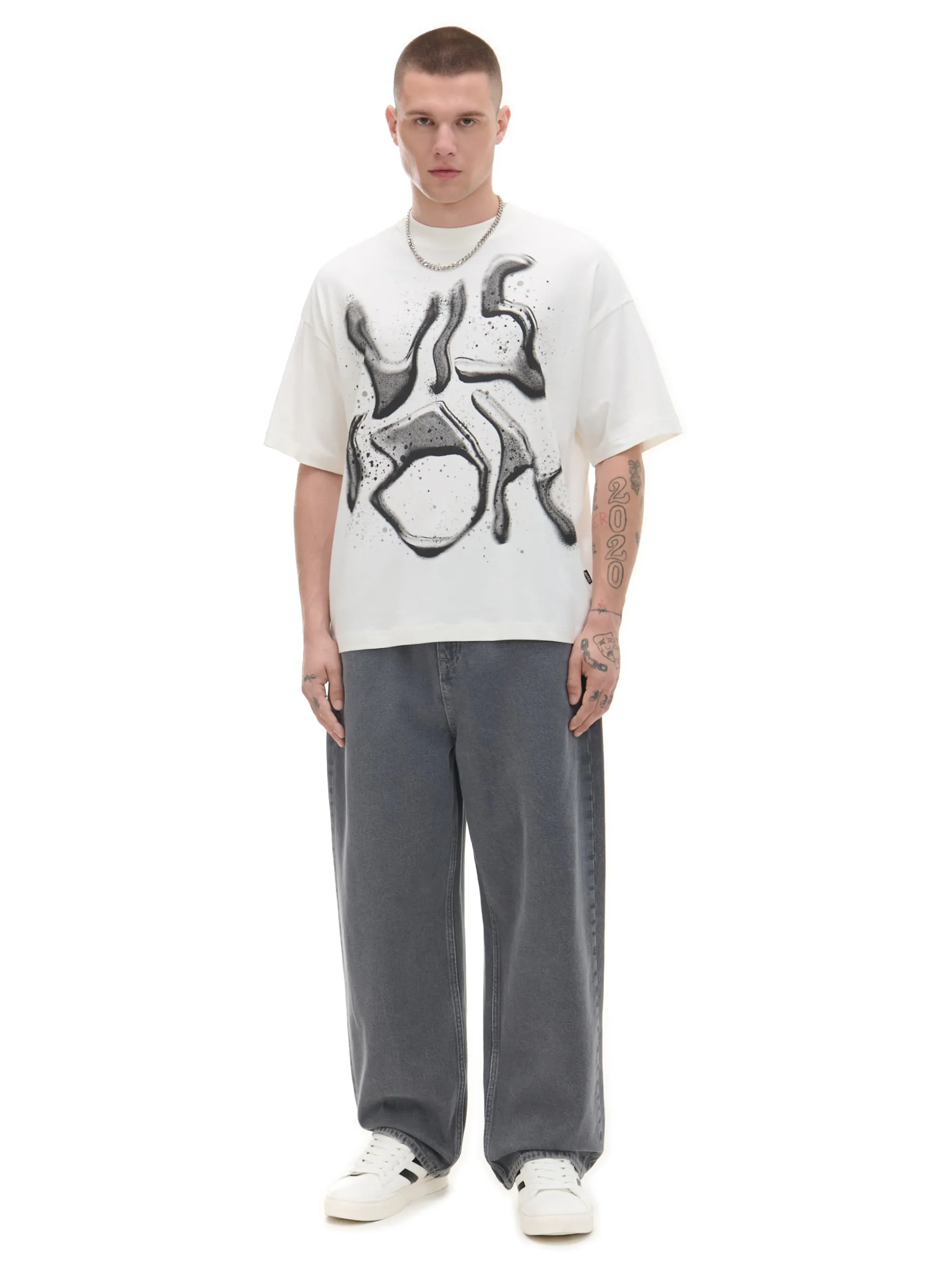 Męska bawełniana koszulka z krótkim rękawem i oryginalnym nadrukiem. 100% bawełny obszerny krój boxy krótkie, swobodne rękawy oryginalny print Model prezentuje produkt w rozmiarze M/L. Wzrost modela: 185 cm