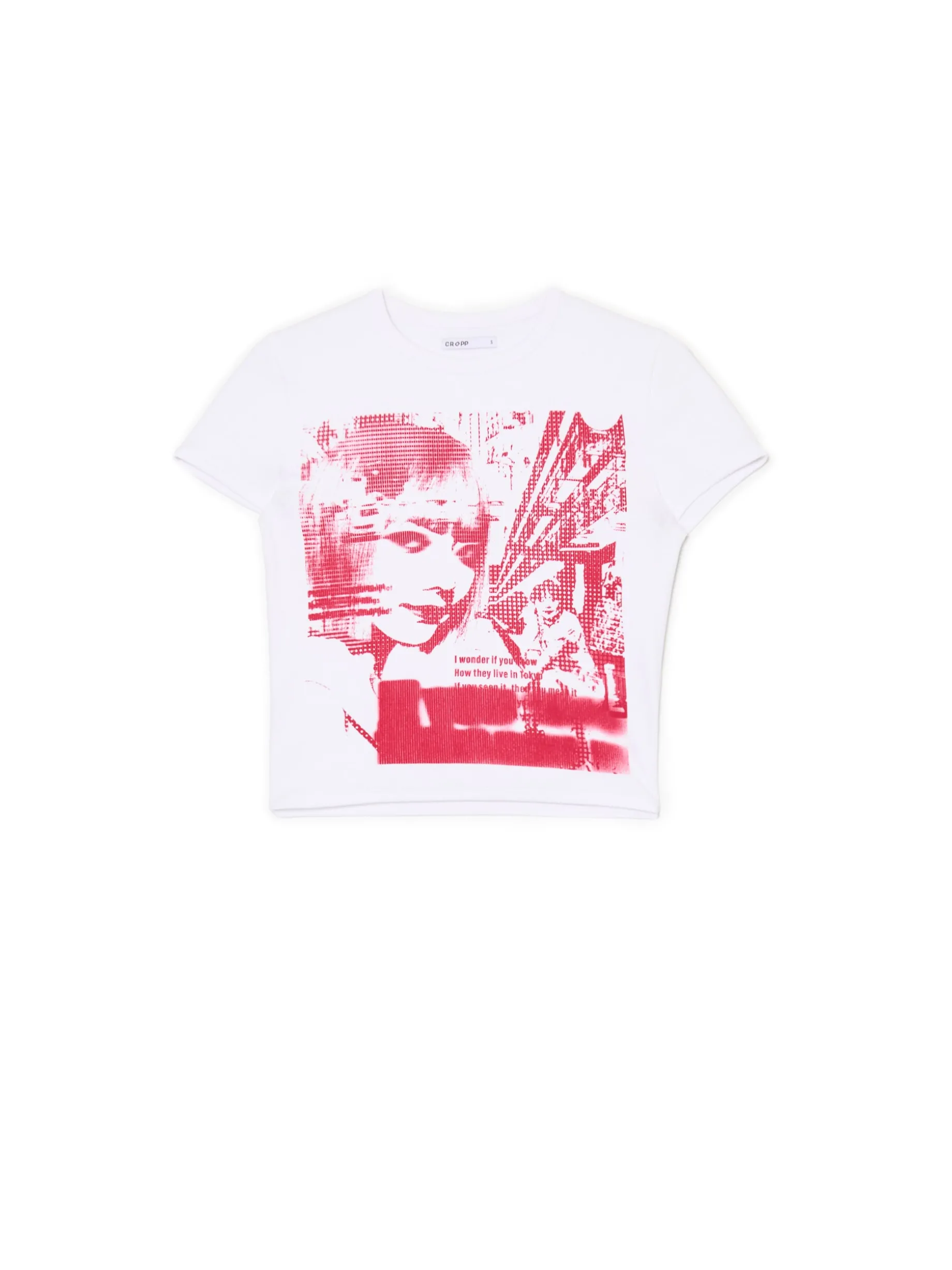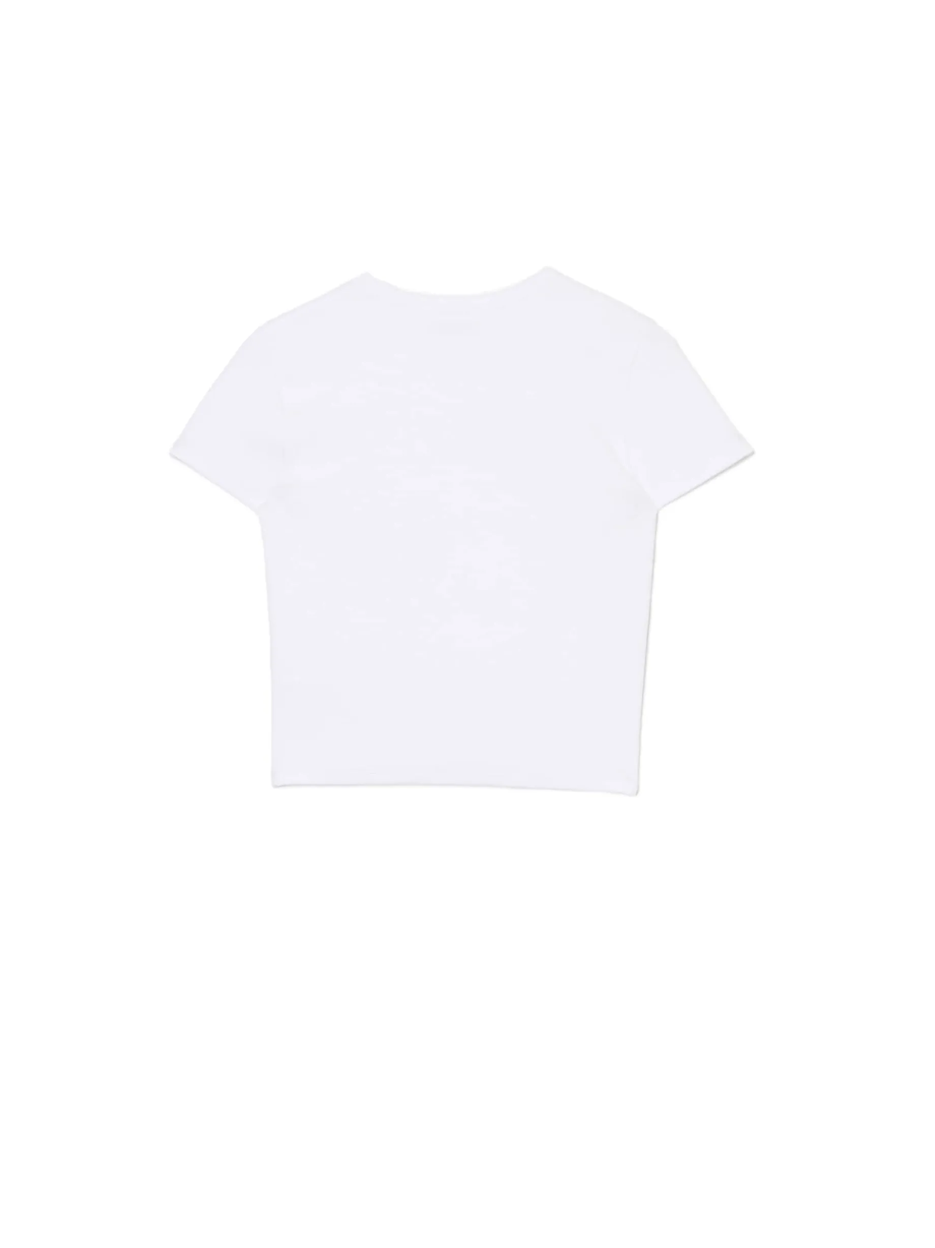 Damska koszulka o krótszym kroju, uszyta z bawełny z domieszką elastycznych włókien. Na przodzie autorski nadruk z motywem muzycznym. elastyczna, prążkowana dzianina krótki, dopasowany krój półokrągły dekolt wykończony ściągaczem krótkie, ścięte rękawy oryginalny print Wzrost modelki: 172 cm