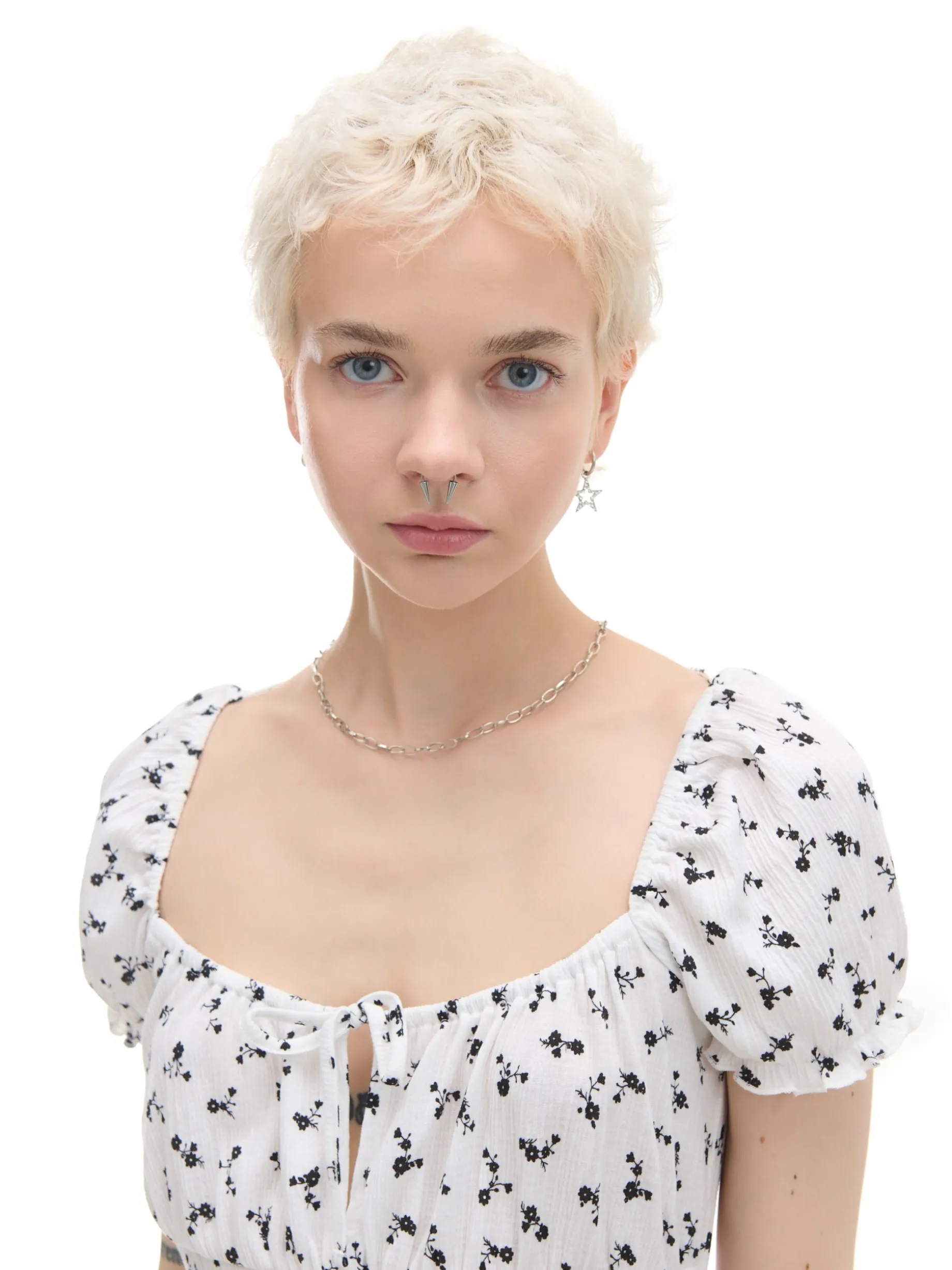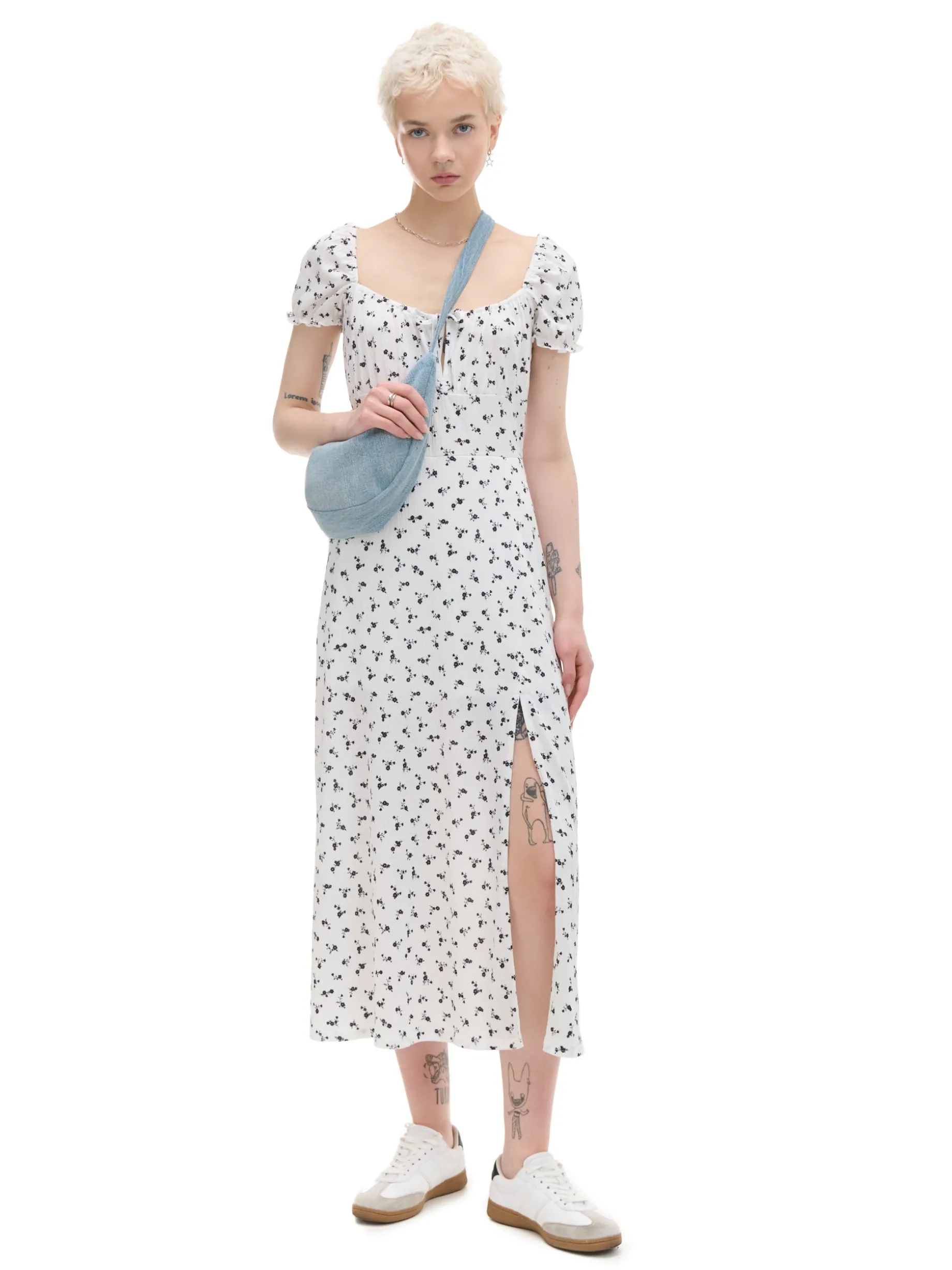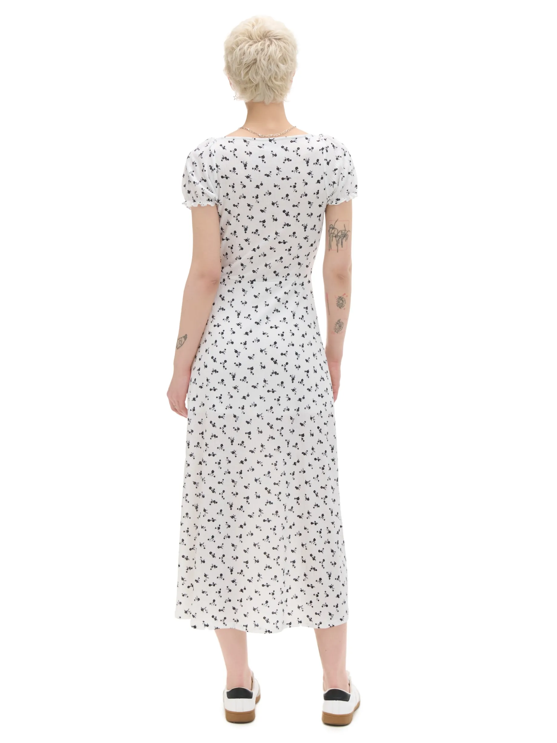 Lekka sukienka, uszyta z wzorzystej dzianiny z kwiatowym motywem. Dostępne inne warianty kolorystyczne. długość midi fason typu empire – odcięcie tuż po biustem krótkie, bufiaste rękawy dekolt z rozcięciem i wiązaniem lekko rozkloszowana spódnica z rozcięciem nadruk w kwiaty na całej powierzchni