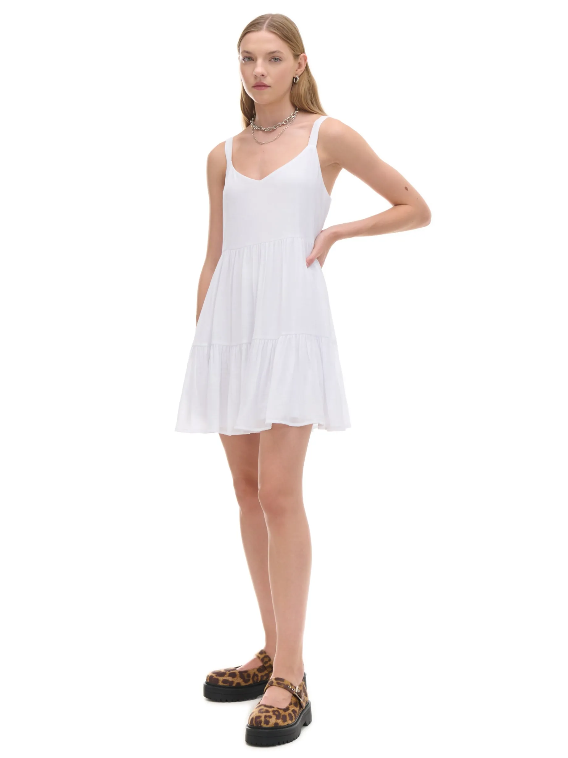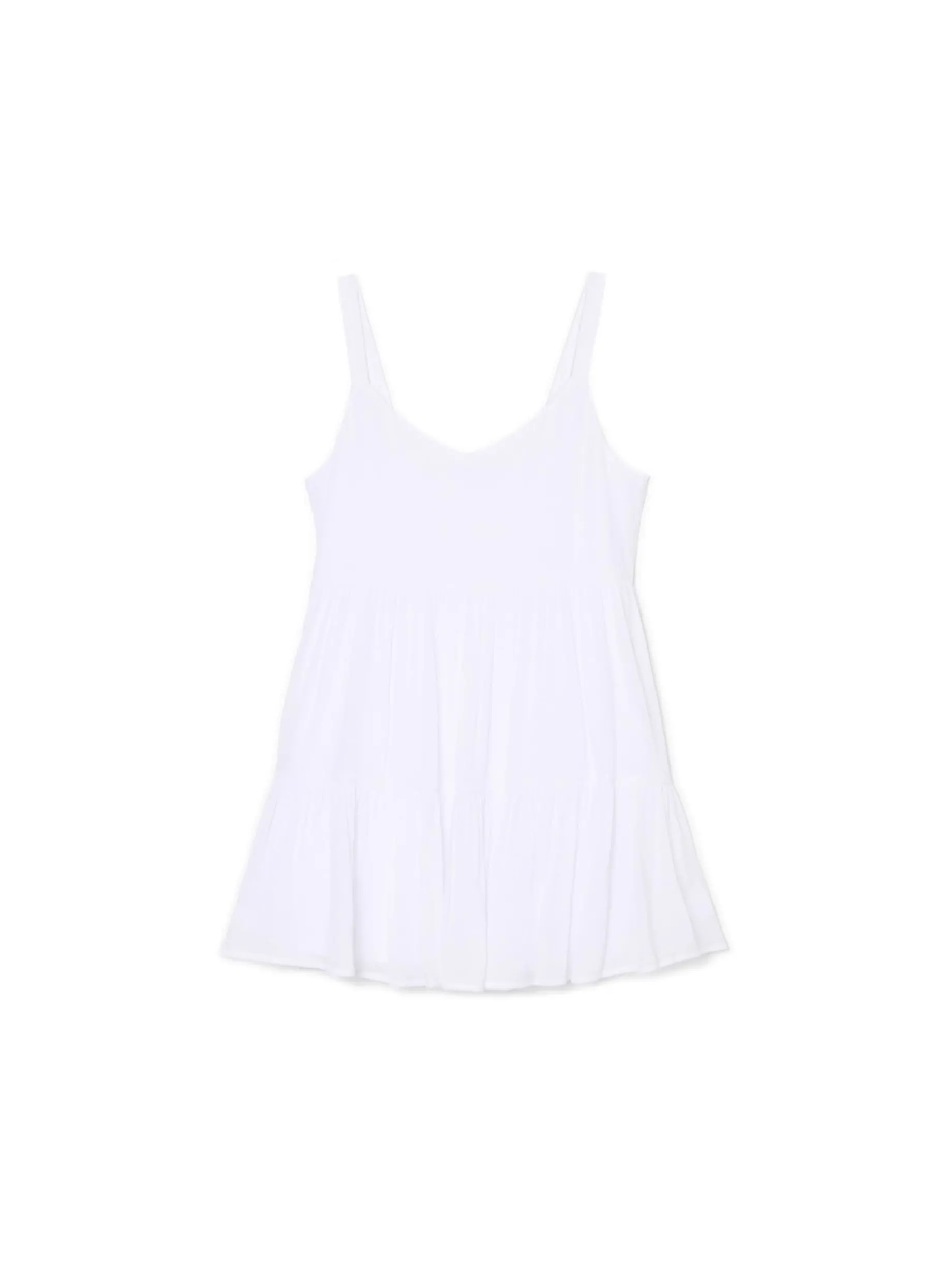 Krótka sukienka, uszyta z lekkiej tkaniny o bardzo wysokiej zawartości wiskozy. Idealna, by poczuć w niej summertime sadness. luźny, letni krój modna długość mini głęboki dekolt w kształcie litery V odcięcie pod biustem z elastyczną gumką cienkie ramiączka spódnica wykończona falbaną
