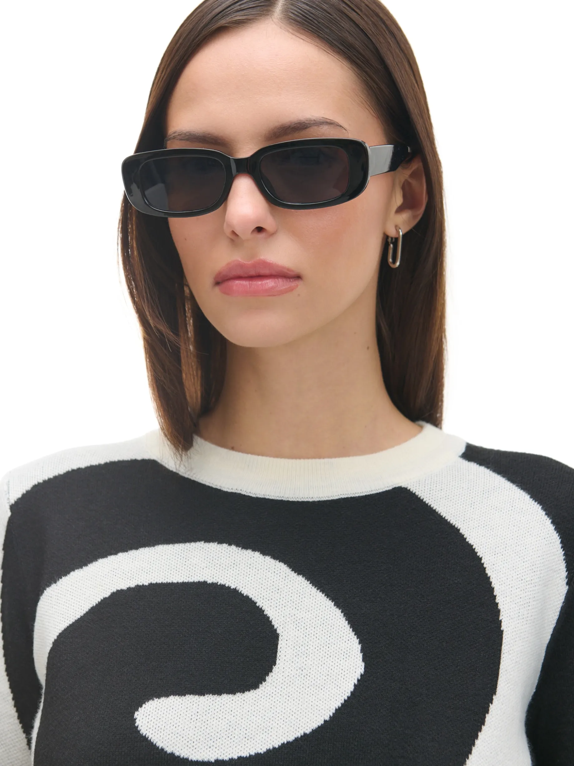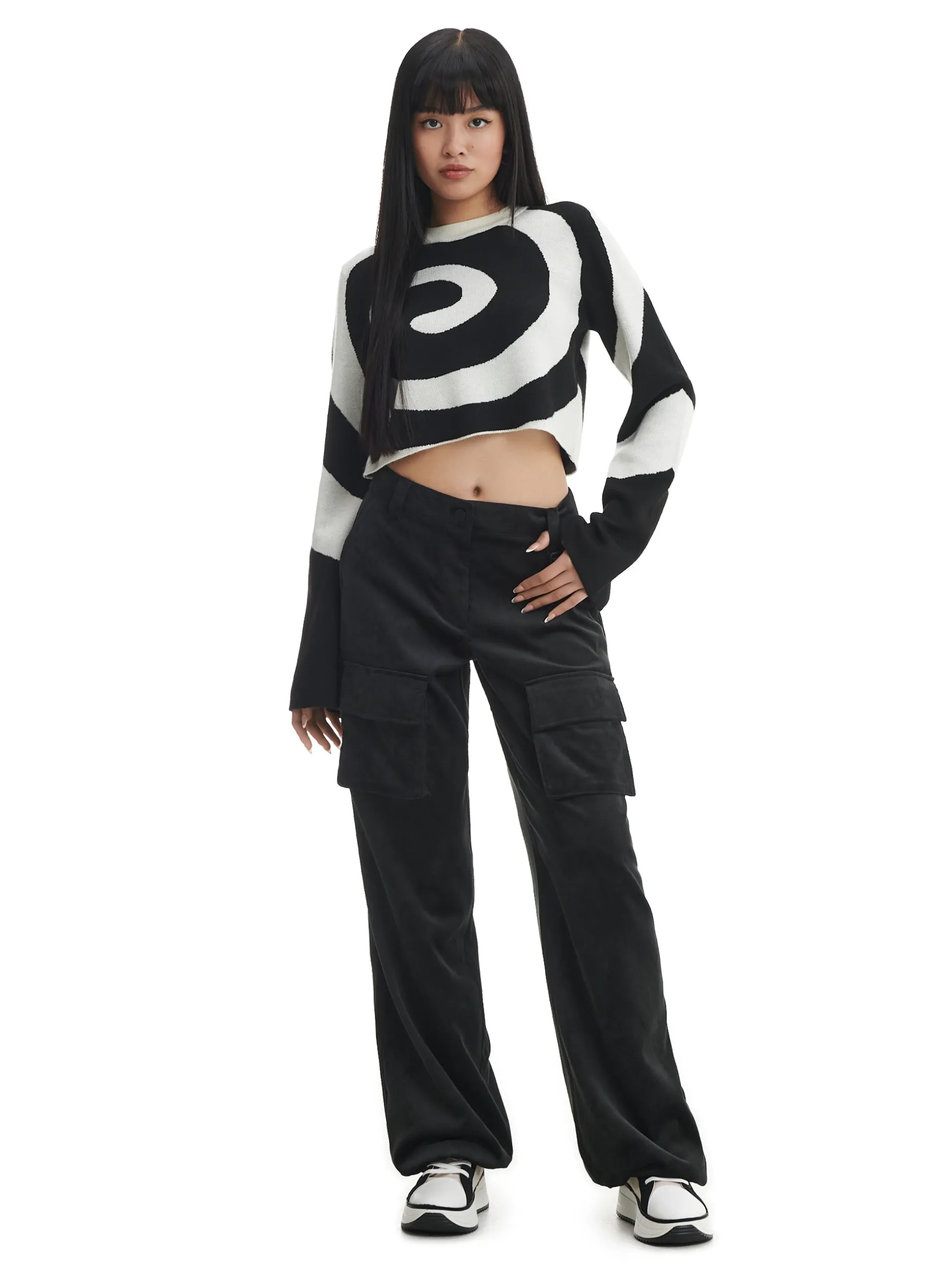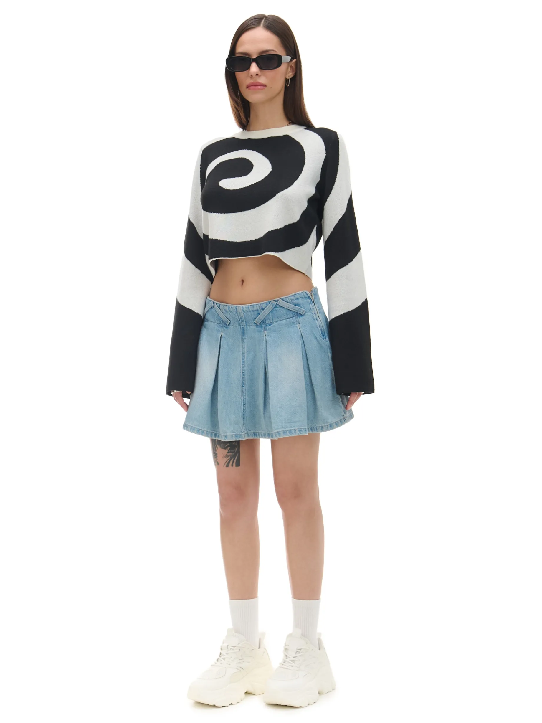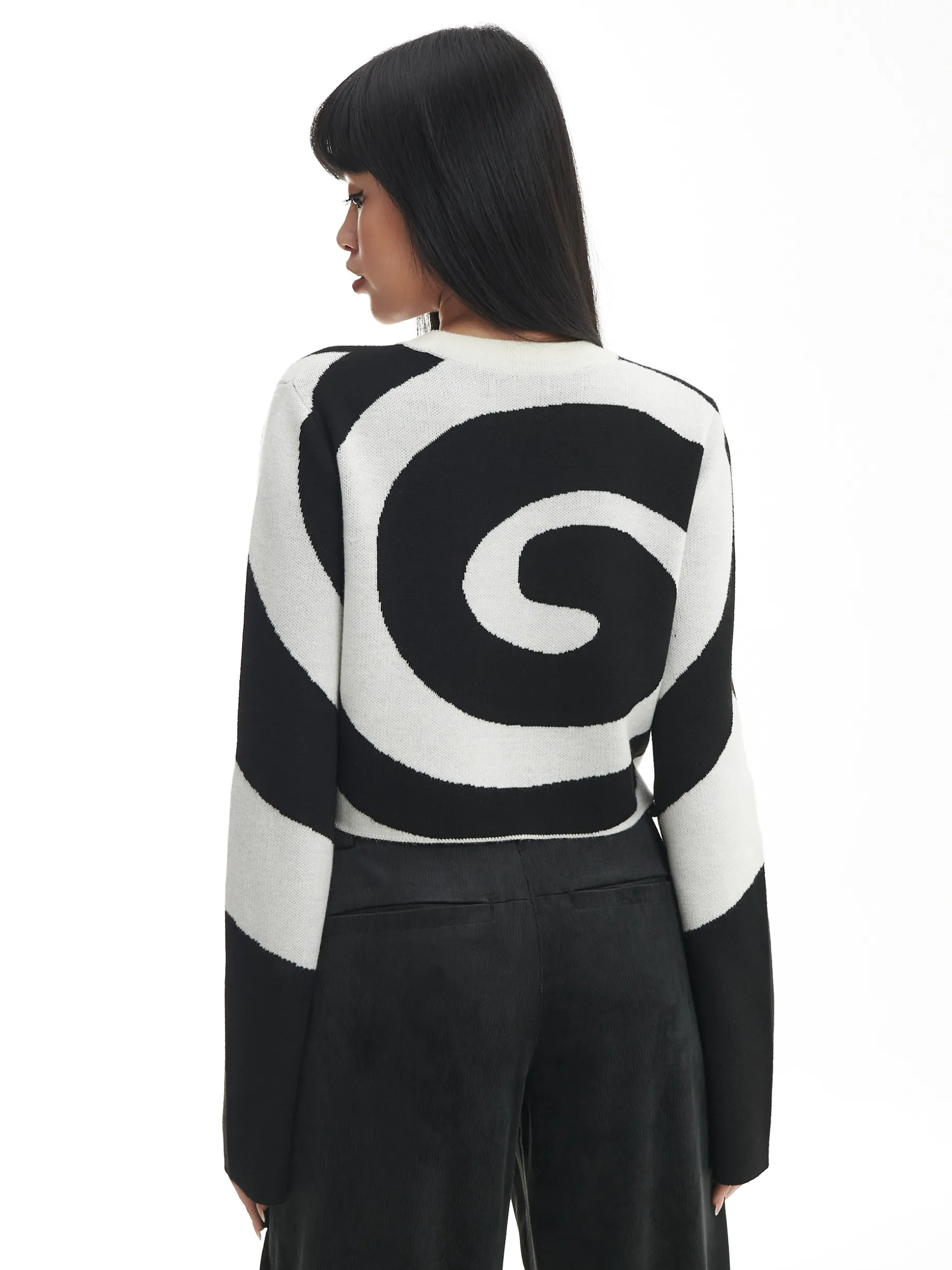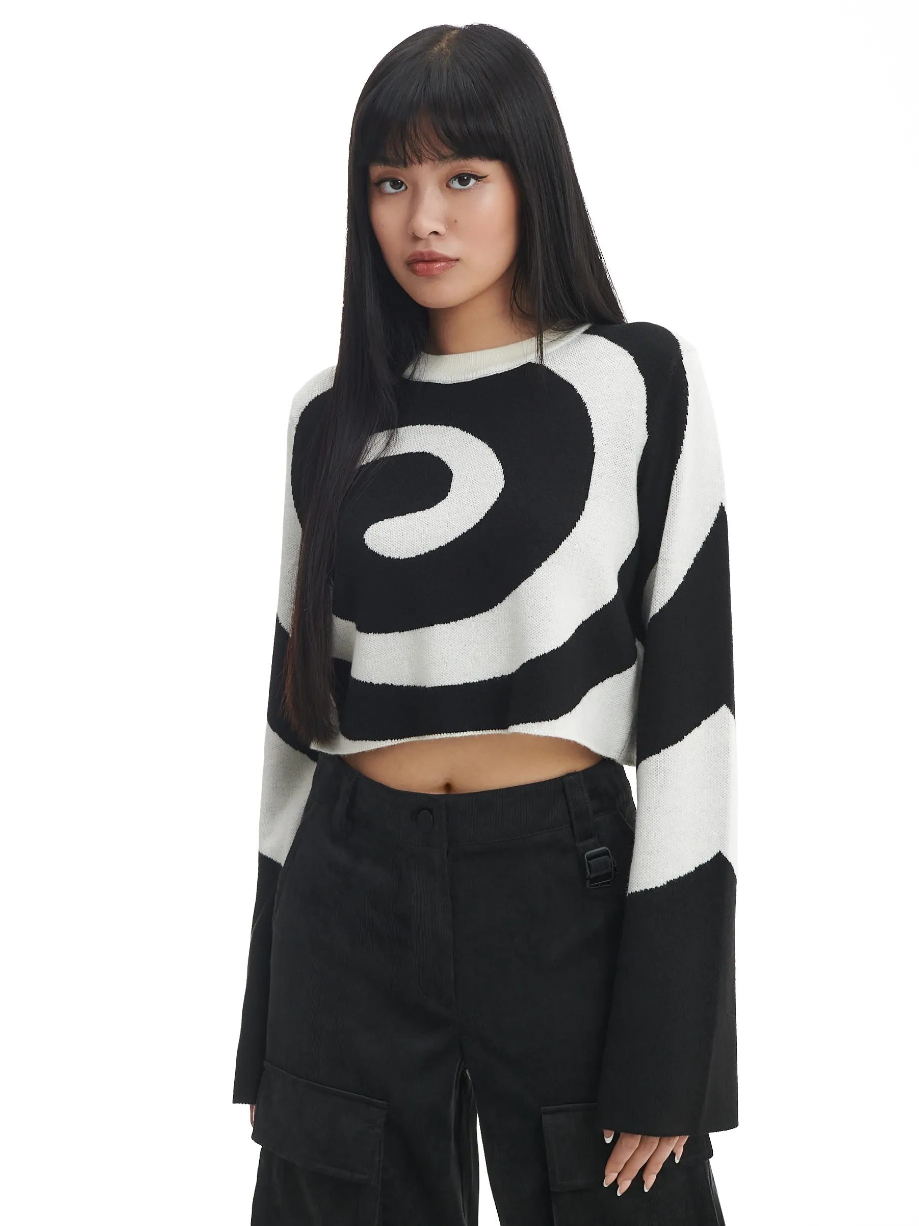 Damski sweter o krótszym kroju, uszyty z żakardowej dzianiny. Szerokie rękawy, na całości biało-czarny motyw. Sweter dostępny w innej wersji kolorystycznej. Rozmiar ubrania: S Wzrost modelki: 168 cm