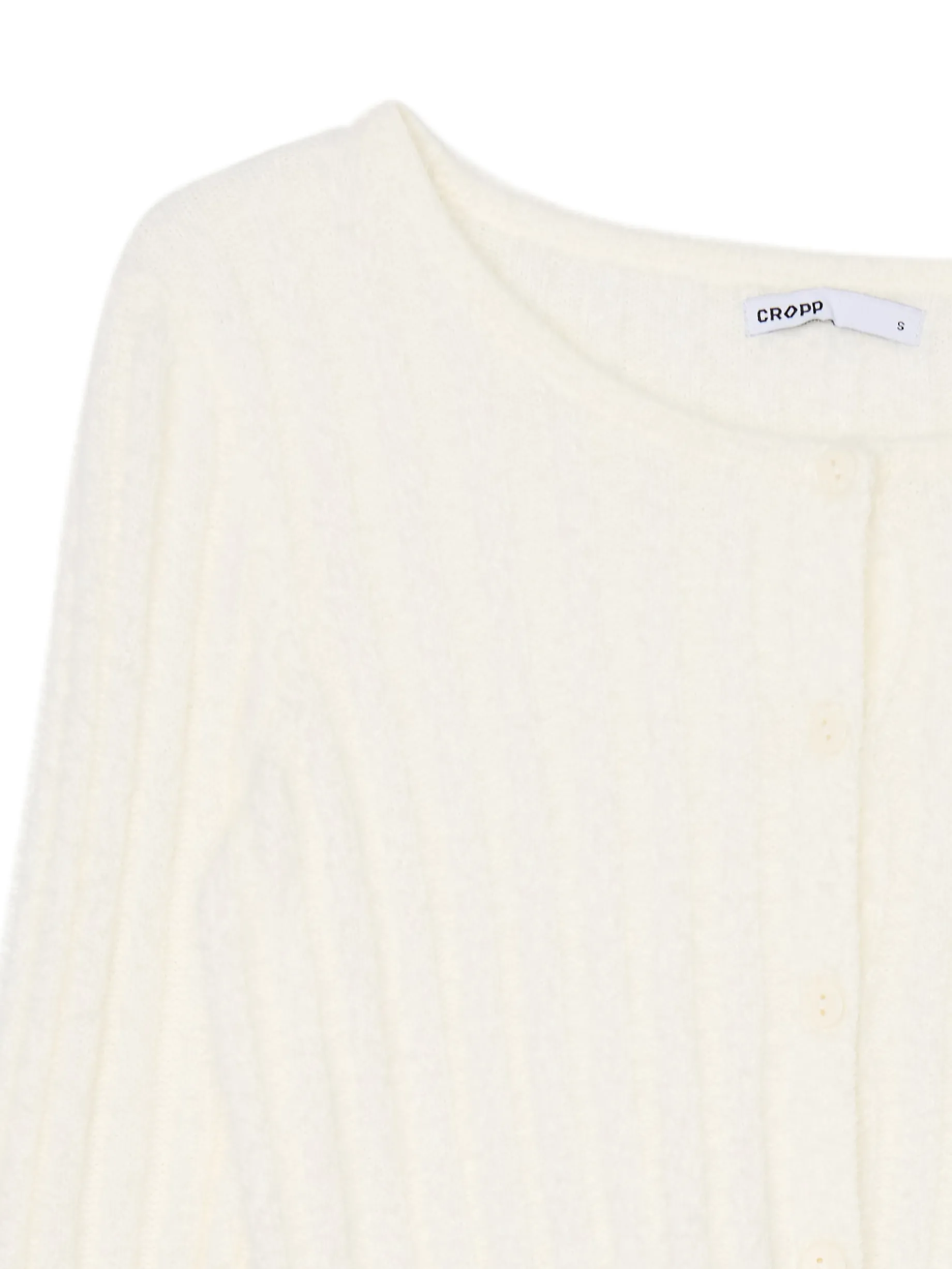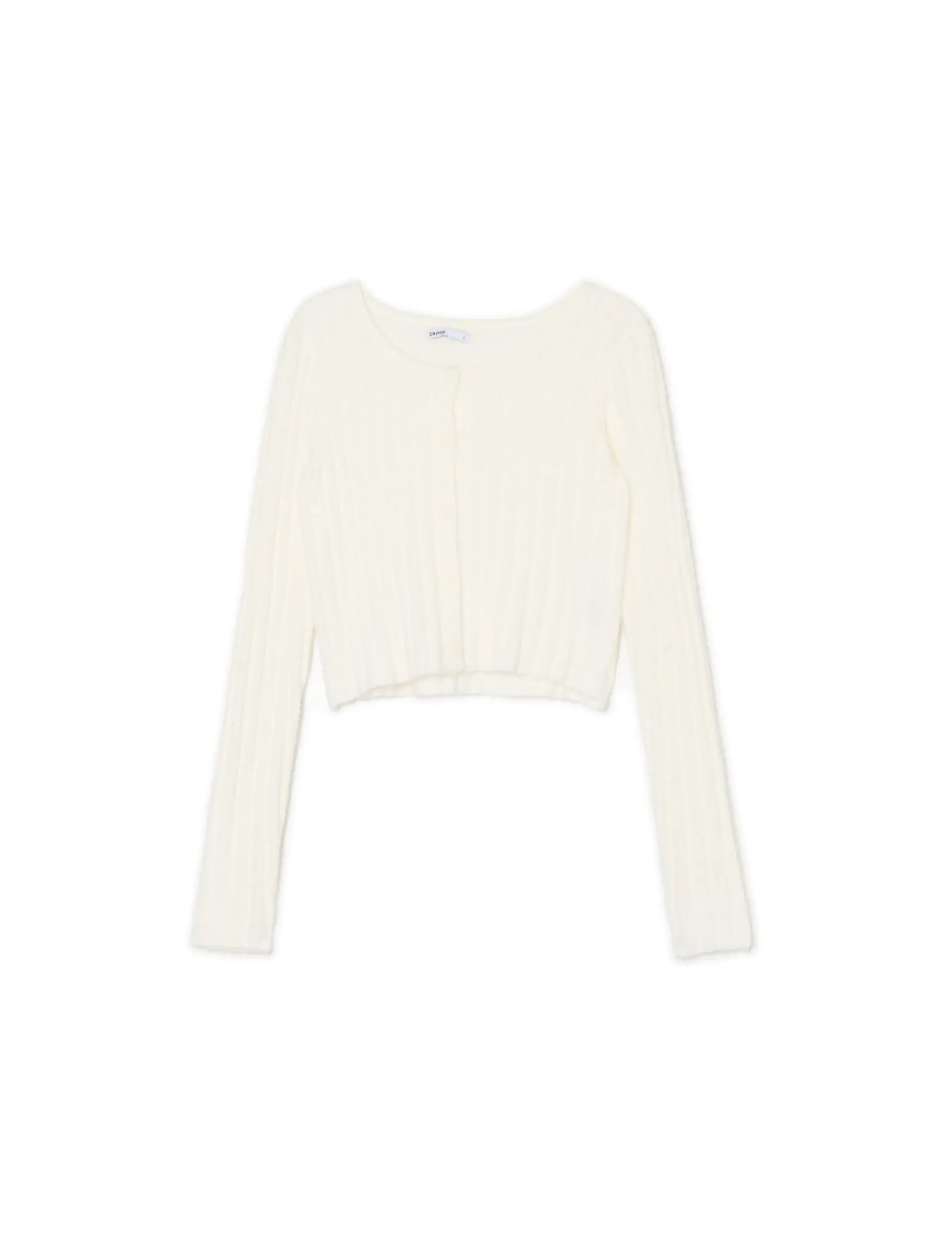 Damski biały sweterek, uszyty z przyjemnej w dotyku mieszanki dzianin. Idealny, jeśli kochasz cozy vibes: strukturalne pionowe prążki podkreślają jego jesienarski charakter. dopasowany krój długie rękawy dekolt typu łódka z przodu zapięcie na guziki