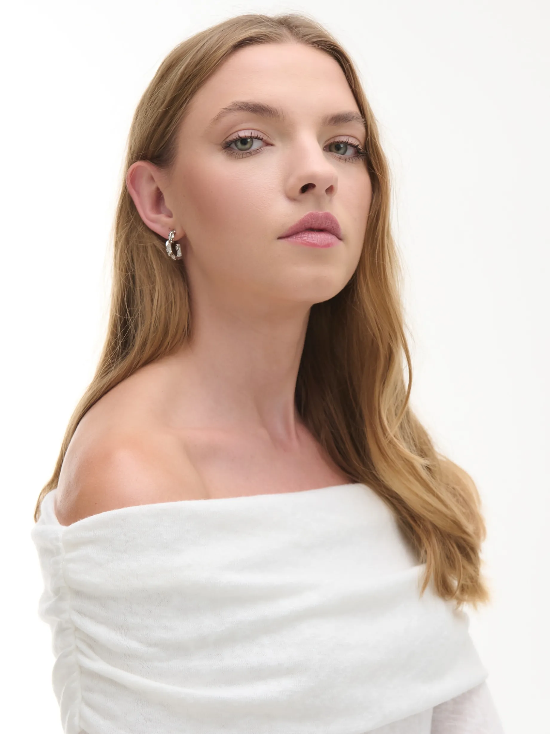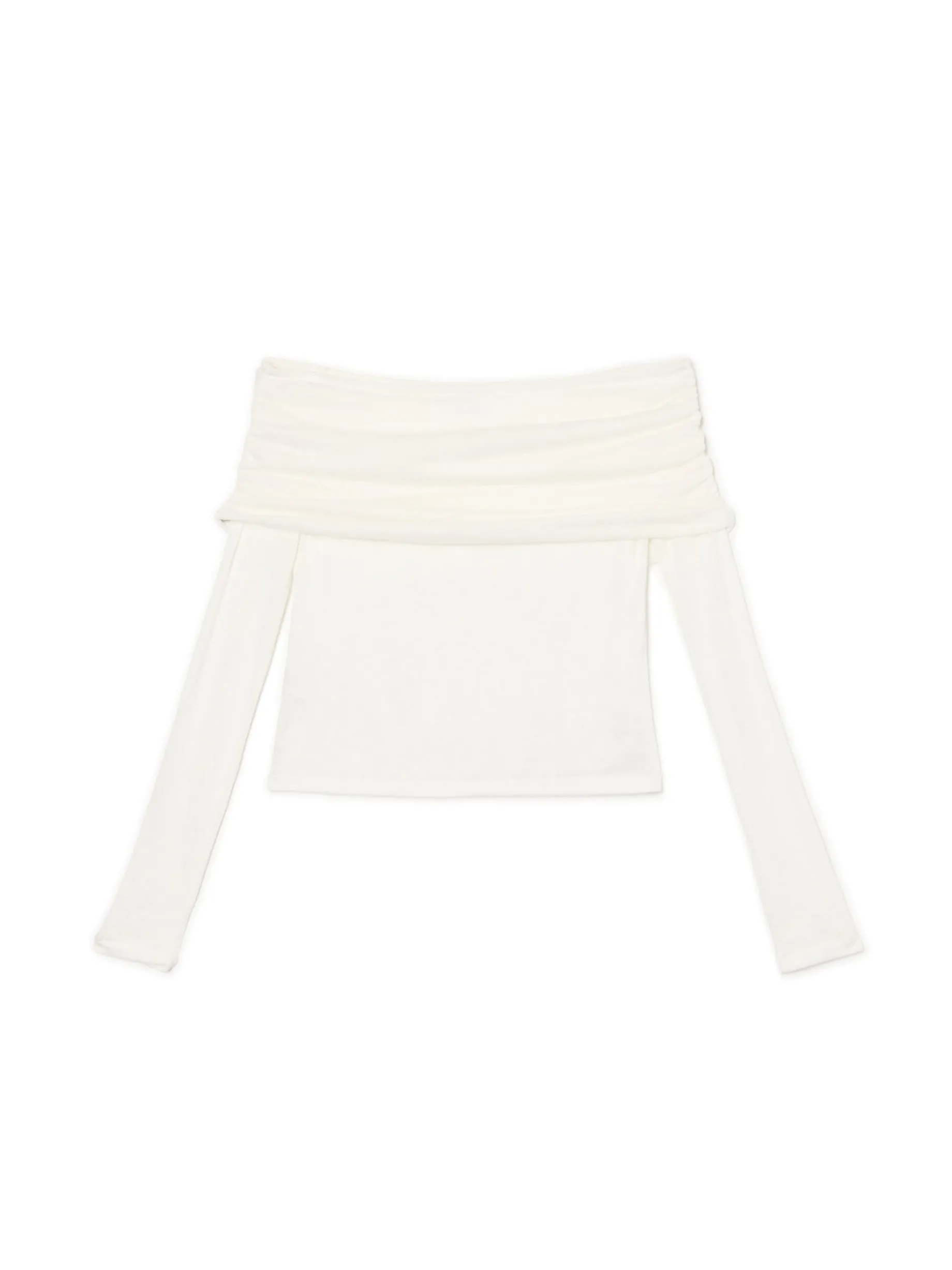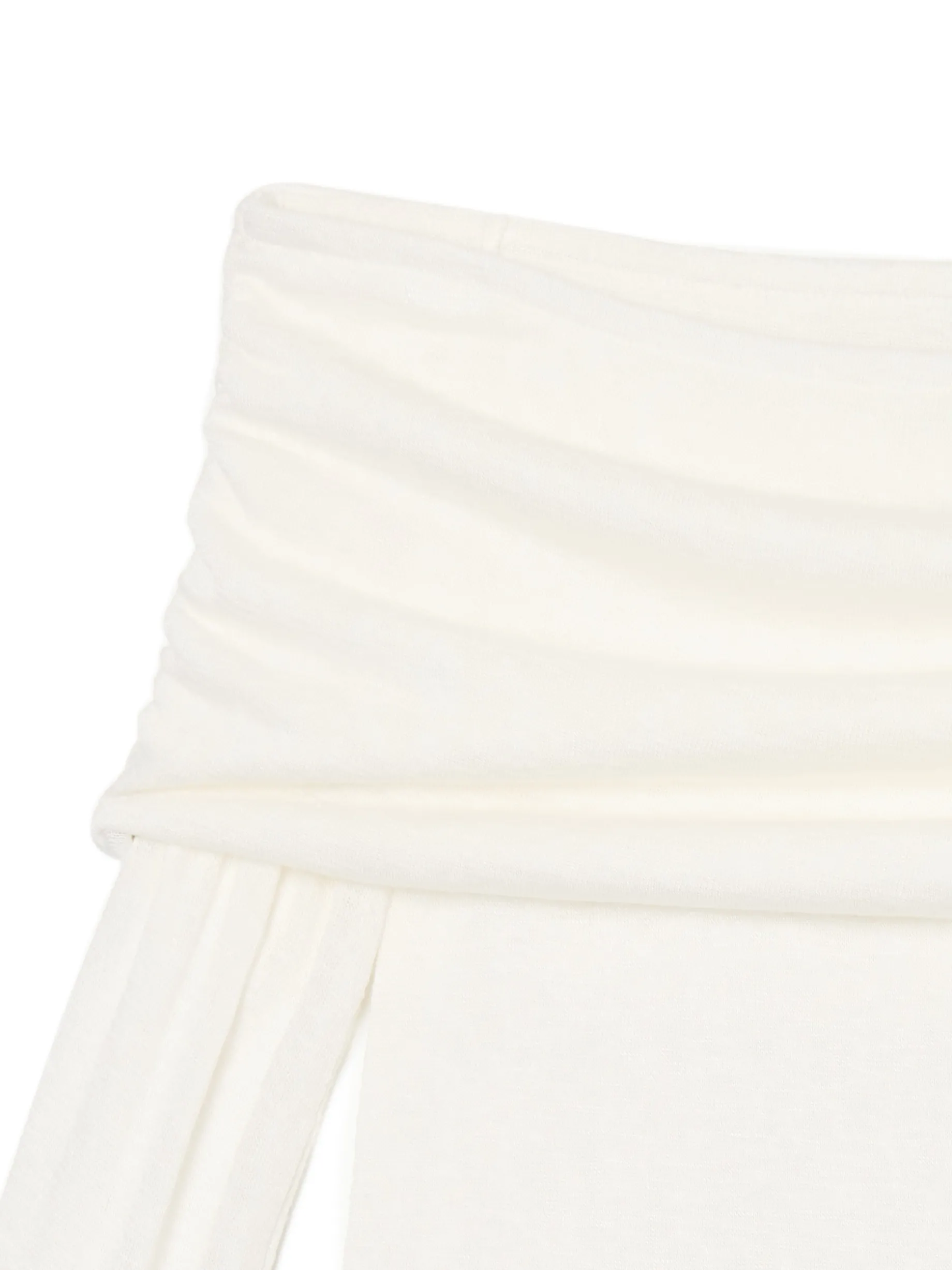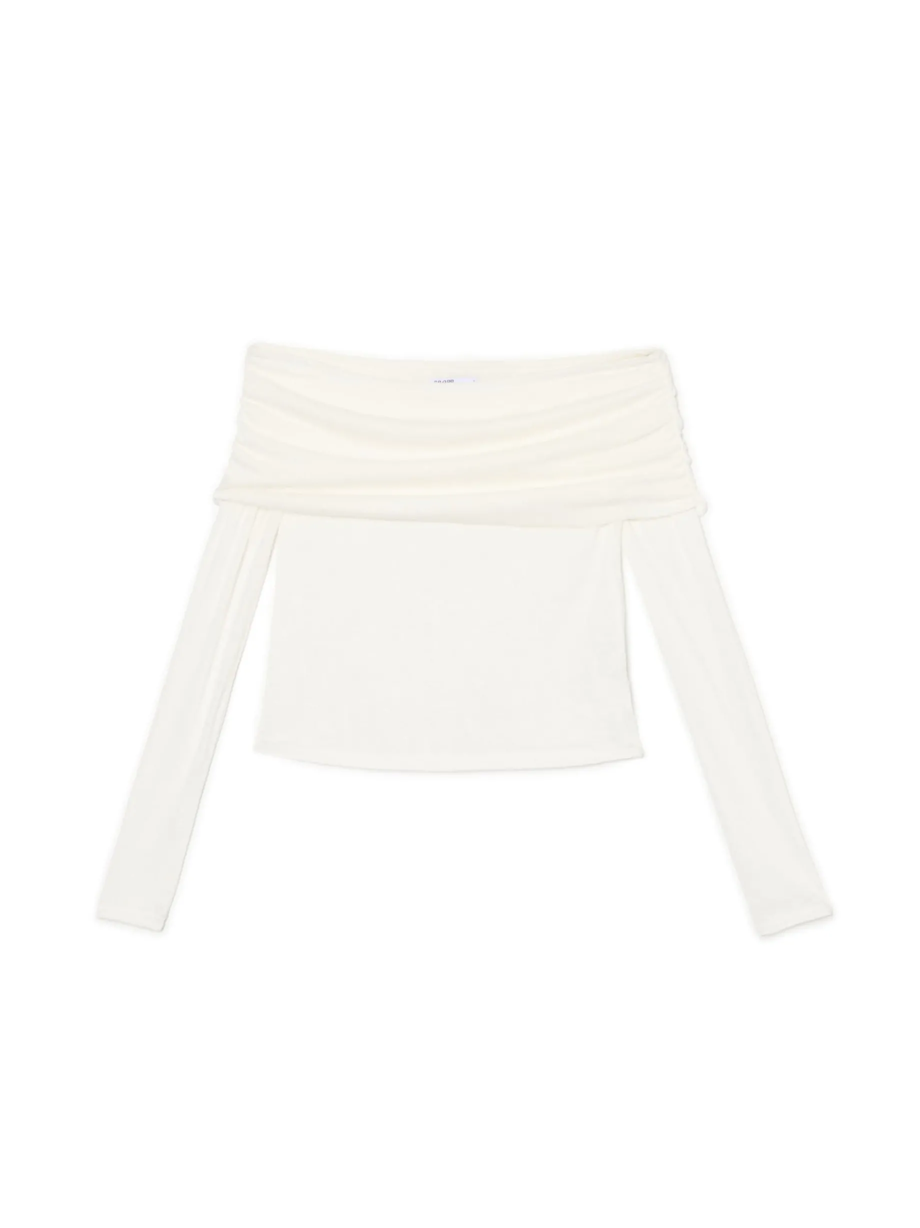 Biały sweter damski o dopasowanym kroju, uszyty z delikatnej dzianiny. Ten model wyróżnia obszerny golf z dekoracyjnym marszczeniem, eksponujący ramiona. dopasowany krój podkreślający sylwetkę dekolt w łódkę opadające ramiona długie, dopasowane rękawy ozdobne marszczenia