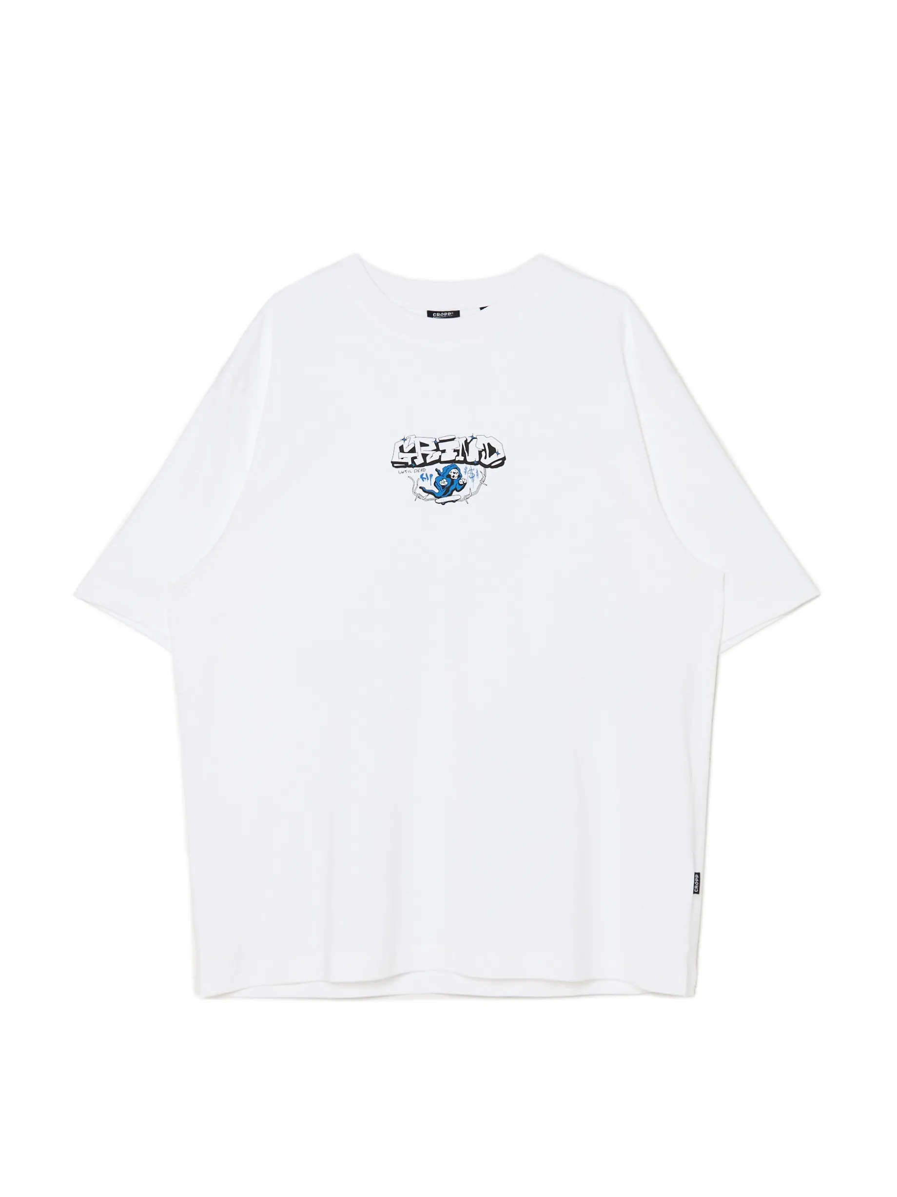Biała męska koszulka z krótkim rękawem, uszyta w 100% z bawełny. Idealny item dla skaterów! luźny fason z obniżoną linią ramion krótkie, swobodne rękawy mały nadruk na piersi, duży nadruk na plecach