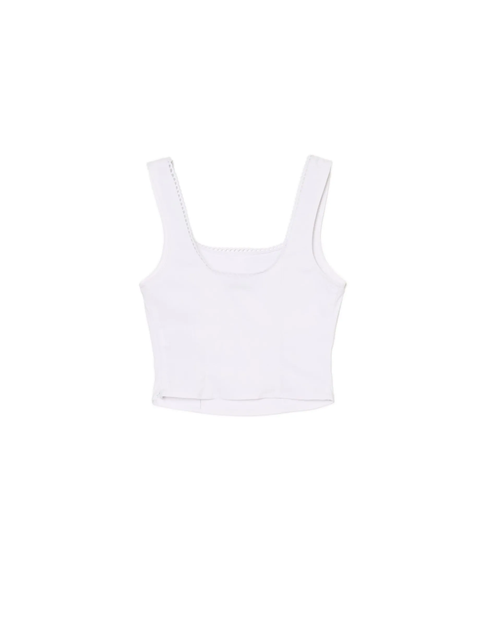 Damski top uszyty z mieszanki tkanin o dużej zawartości wiskozy. Ozdobą są wstawki modelujące sylwetkę, dekoracyjne wykończenie wokół dekoltu i mała kokardka na przodzie. wiskoza z domieszką elastycznych włókien dopasowany krój podkreślający sylwetkę zapięcie na kryty zamek z boku cienkie ramiączka modelujące zakładki z przodu kwadratowy dekolt z przodu i z tyłu ozdobne wykończenie przy dekolcie