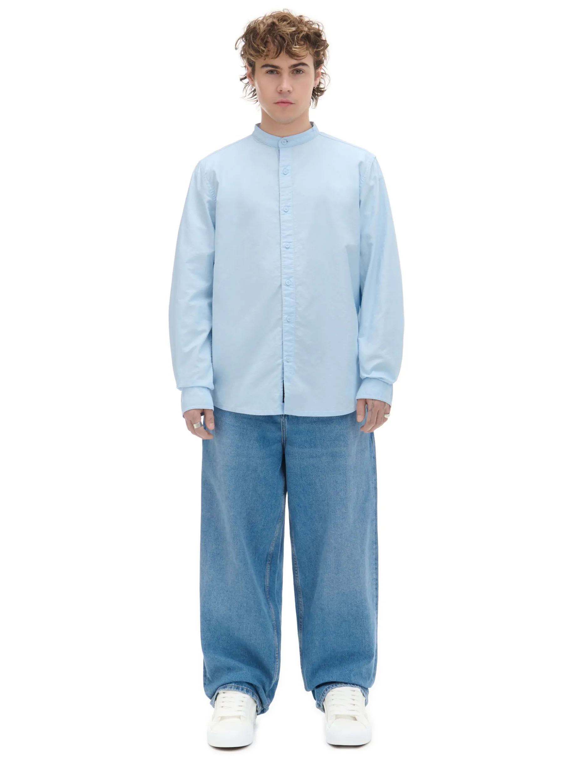Błękitna męska koszula, uszyta w 100% z bawełny. regularny krój kołnierzyk typu mao zapięcie na guziki długie rękawy z mankietami zapinanymi na dwa guziki