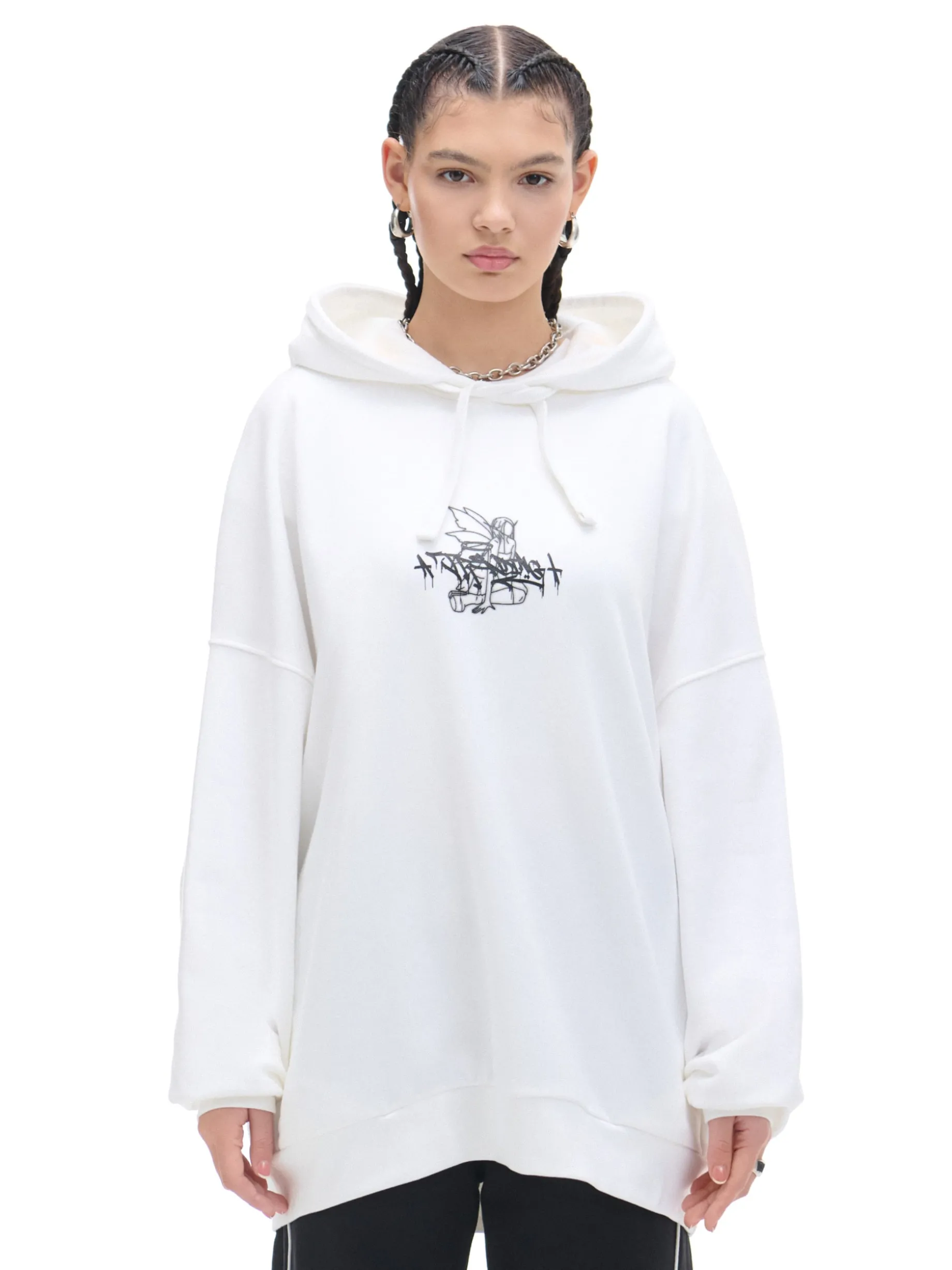 Damska bluza uszyta z dzianiny o wysokiej zawartości bawełny w kroju oversize. Jasnoszary kolor materiału i kontrastowy print będą fitowały z wieloma dodatkami! dzianinowy materiał z bawełną krój oversize długie rękawy z obniżoną linią ramion dół i rękawy wykończone ściągaczem dwie kieszenie z przodu szeroki kaptur z regulacją obwodu