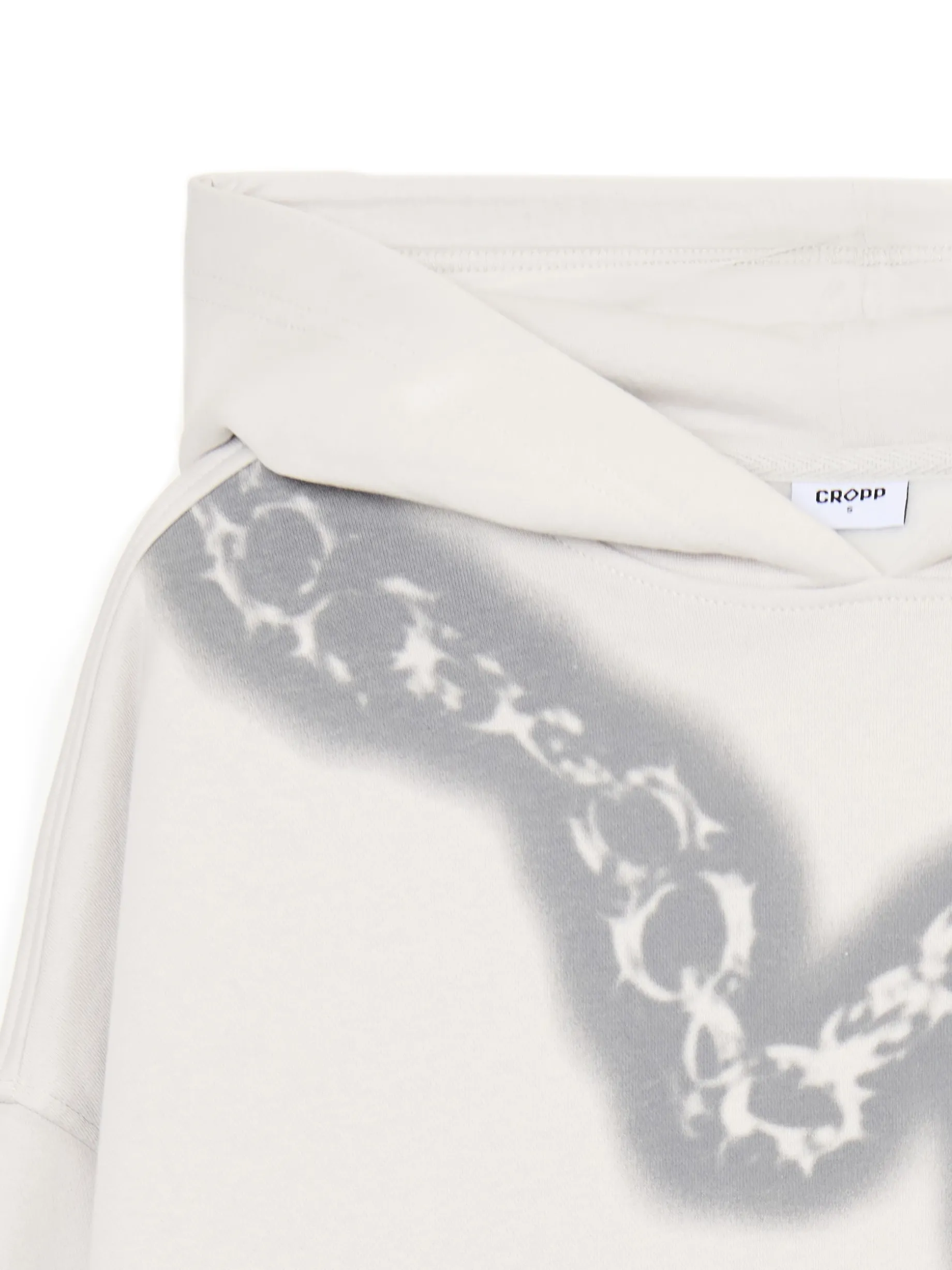 Jasna damska bluza z kapturem uszyta z mieszanki dzianin z przyjemną w dotyku bawełną fleecy w składzie. Z przodu i na rękawach nadruk z motywami łańcucha i serca. dzianinowy materiał z bawełną krój oversize lekkie ocieplenie miękki kaptur długie rękawy z obniżoną linią ramion dół i rękawy wykończone prążkowanym ściągaczem kieszeń kangurka na przodzie nadruk all over Produkt tworzy zestaw z modelem 613AQ-09X . Ten produkt należy do kolekcji UNISEX – zalecamy wybranie mniejszego rozmiaru niż zazwyczaj, jeśli chcesz uniknąć efektu oversize.