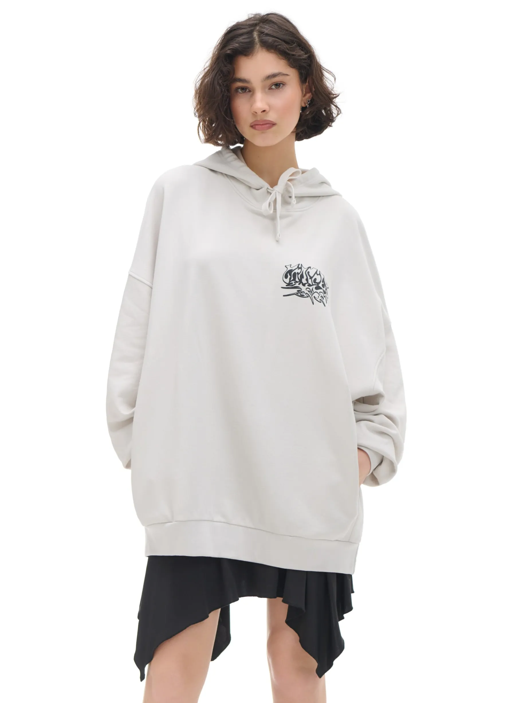 Damska bluza uszyta z dzianiny o wysokiej zawartości bawełny w kroju oversize. Jasnoszary kolor materiału i kontrastowy print będą fitowały z wieloma dodatkami! dzianinowy materiał z bawełną krój oversize długie rękawy z obniżoną linią ramion dół i rękawy wykończone ściągaczem dwie kieszenie z przodu szeroki kaptur z regulacją obwodu Wzrost modelki: 172 cm