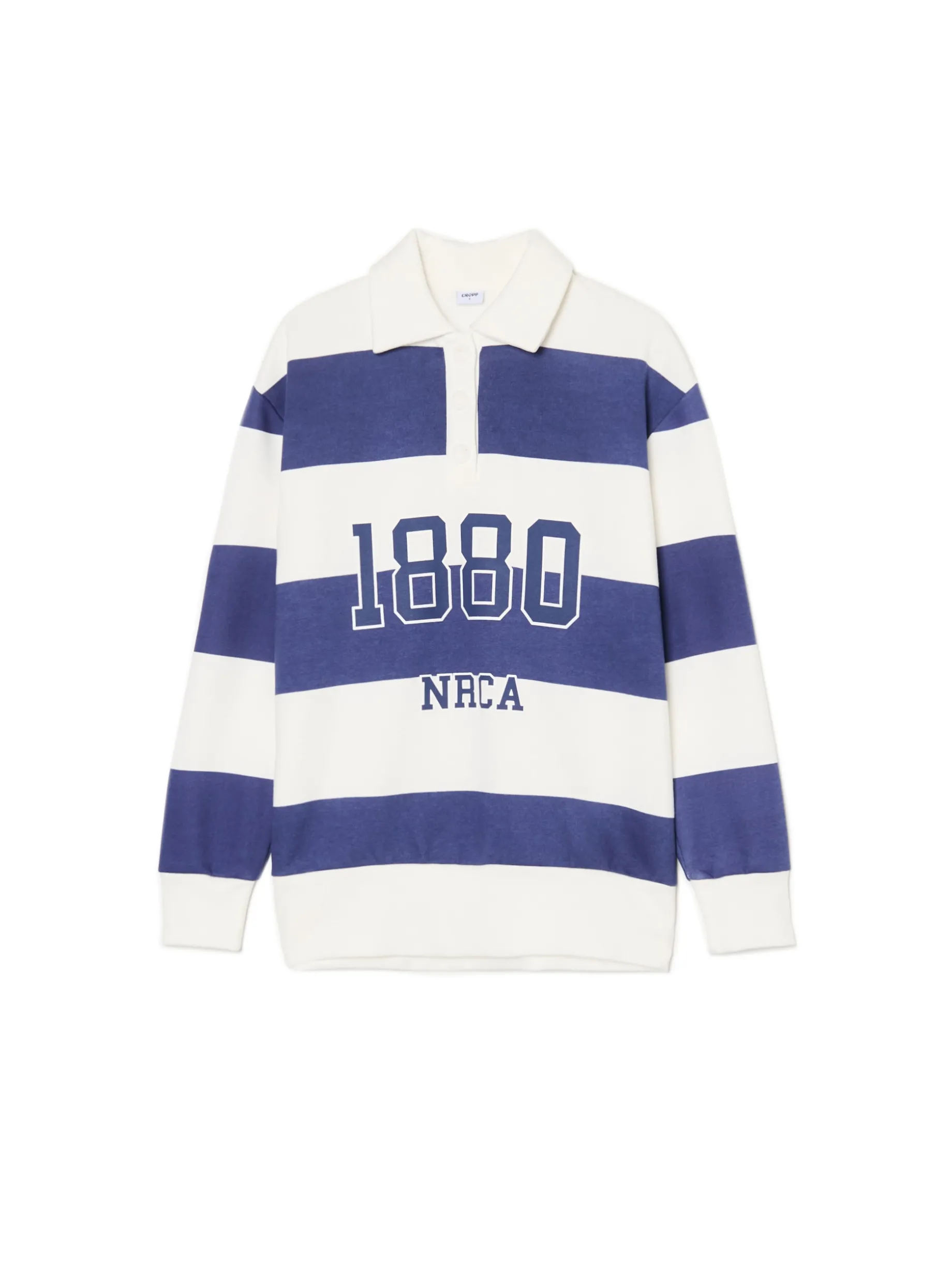 Damska bluza w wyjątkowym fasonie koszuli polo z klasycznym kołnierzykiem, uszyta z mieszanki dzianin z miękkim meszkiem. Na przodzie aplikacja w collegowym stylu. Klasyczny look w nowoczesnym designie, sprawdź! bluza o regularnym kroju uszyta z miękkiej dzianiny z bawełną góra zapinana na guziki klasyczny kołnierzyk długie rękawy z obniżoną linią ramion dół i rękawy wykończone ściągaczem wzór w paski na całości z przodu aplikacja Wzrost modelki: 177 cm