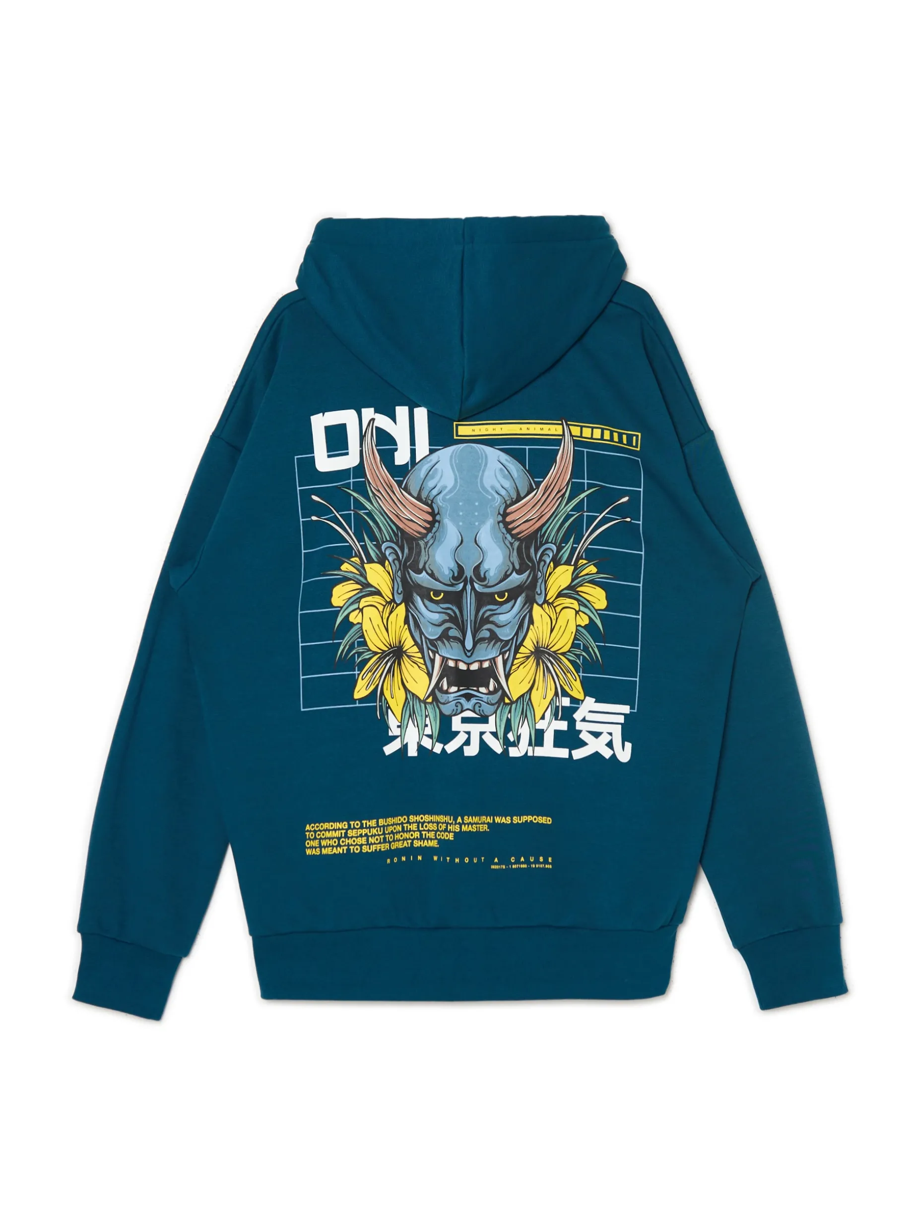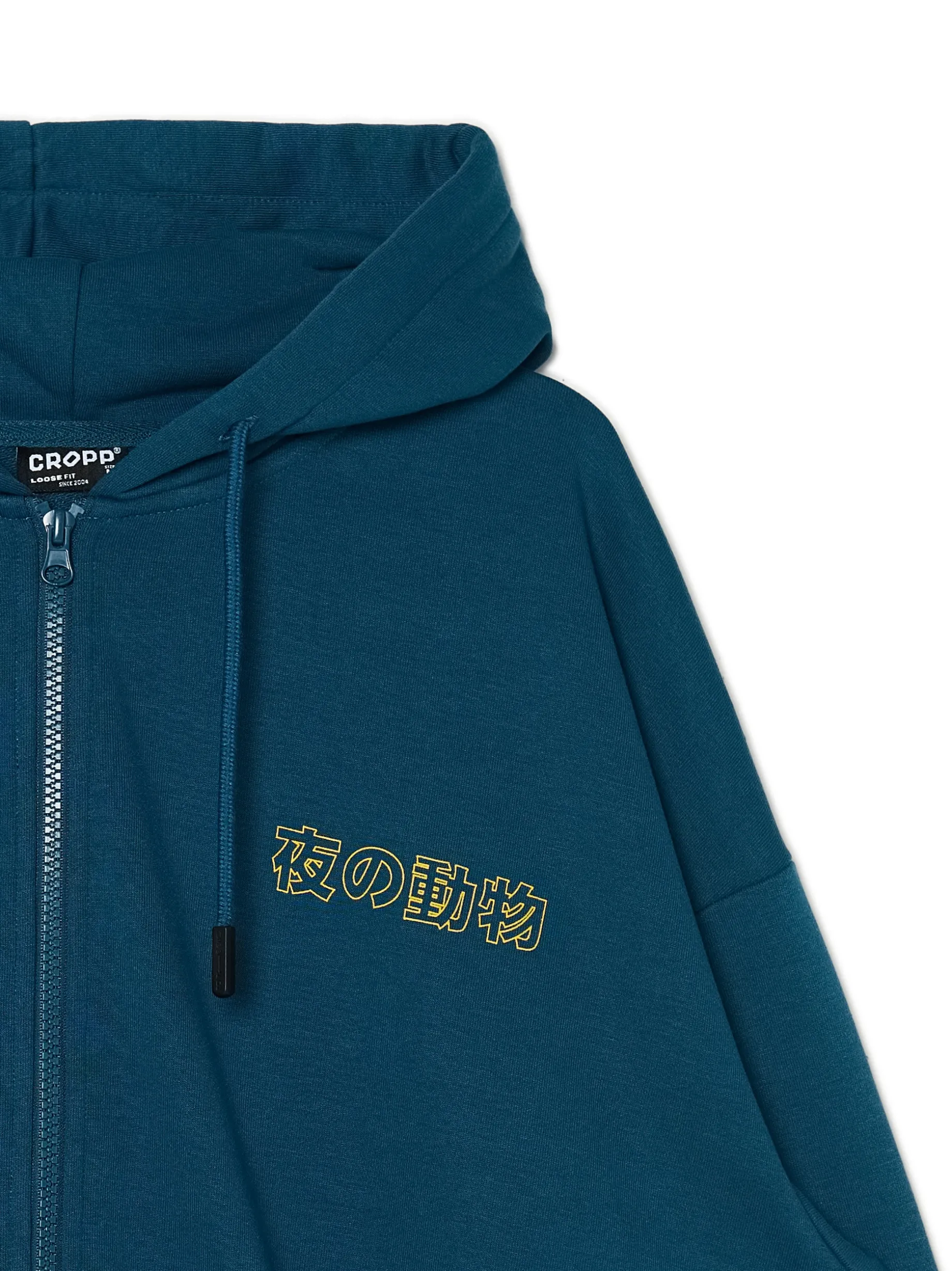 Męska bluza z kapturem o luźnym kroju w niebieskim kolorze, uszyta z dzianiny z dodatkiem bawełny french terry. Po obu stronach nadruk w japońskim stylu. dzianinowy materiał z bawełną swobodny, luźny krój zapięcie na zamek na całej długości miękki kaptur z troczkami dół i rękawy wykończone prążkowanym ściągaczem dwie kieszenie boczne mały nadruk na piersi, duży nadruk na plecach efekt sprania Gramatura: 340 gsm