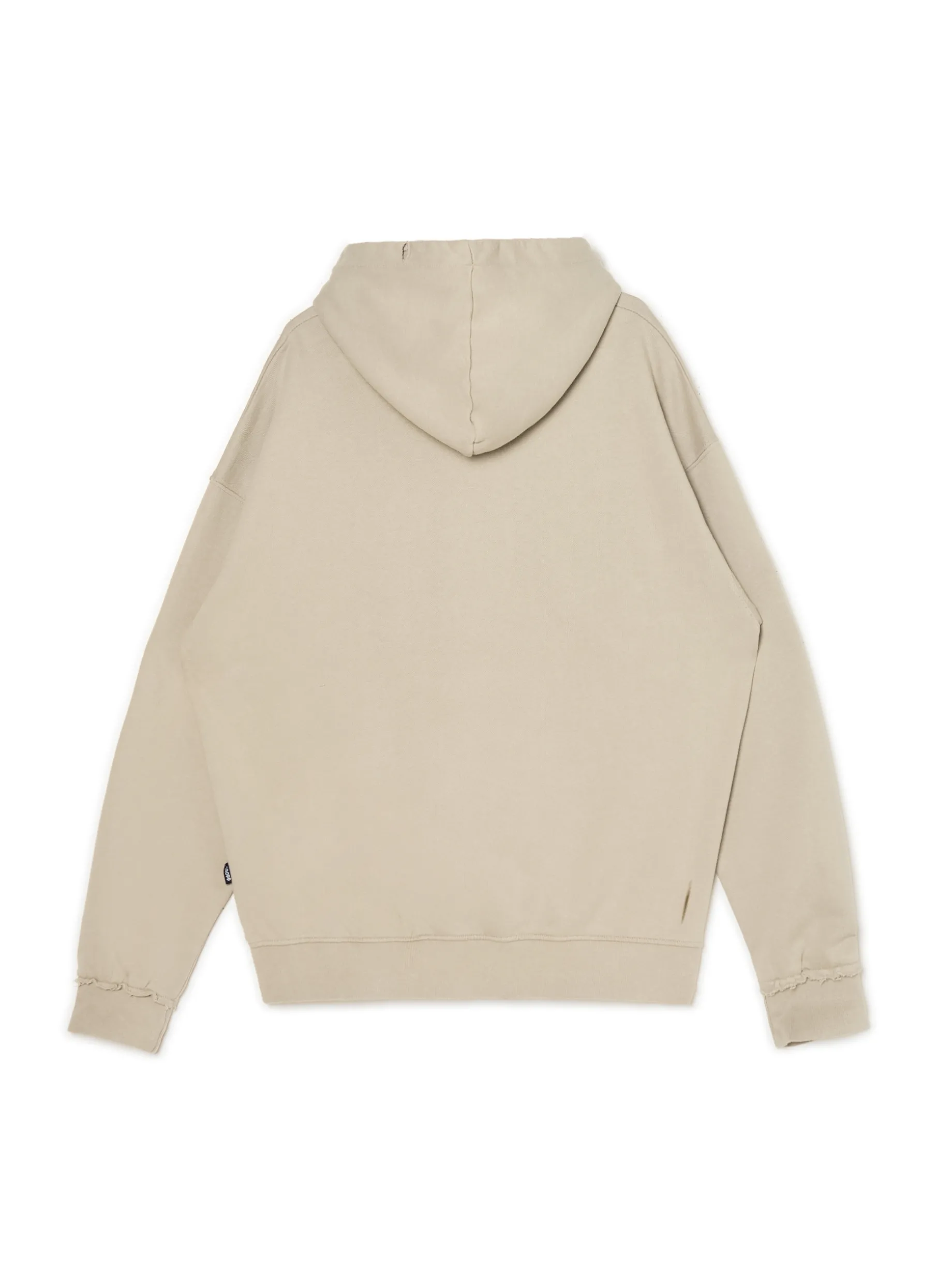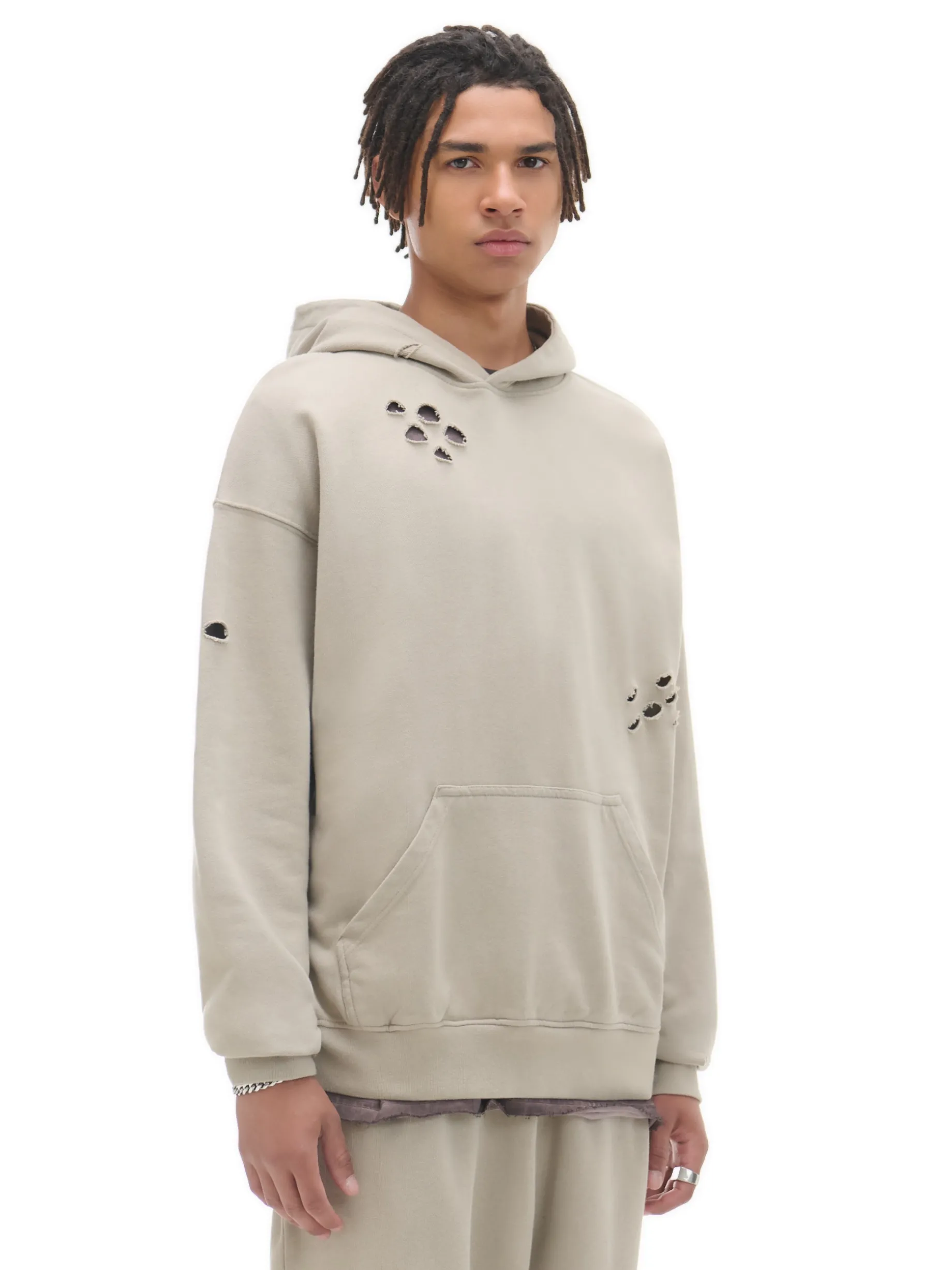 Męska beżowa bluza z kapturem typu hoodie. Dziury i poszarpane krawędzie przy mankietach od rękawów nadają jej charakteru. Look & vibe! 100% oddychającej bawełny swobodny krój loose duża kieszeń typu kangur ściągacze na biodrach i mankietach poszarpane krawędzie przy mankietach asymetryczne dziury na materiale