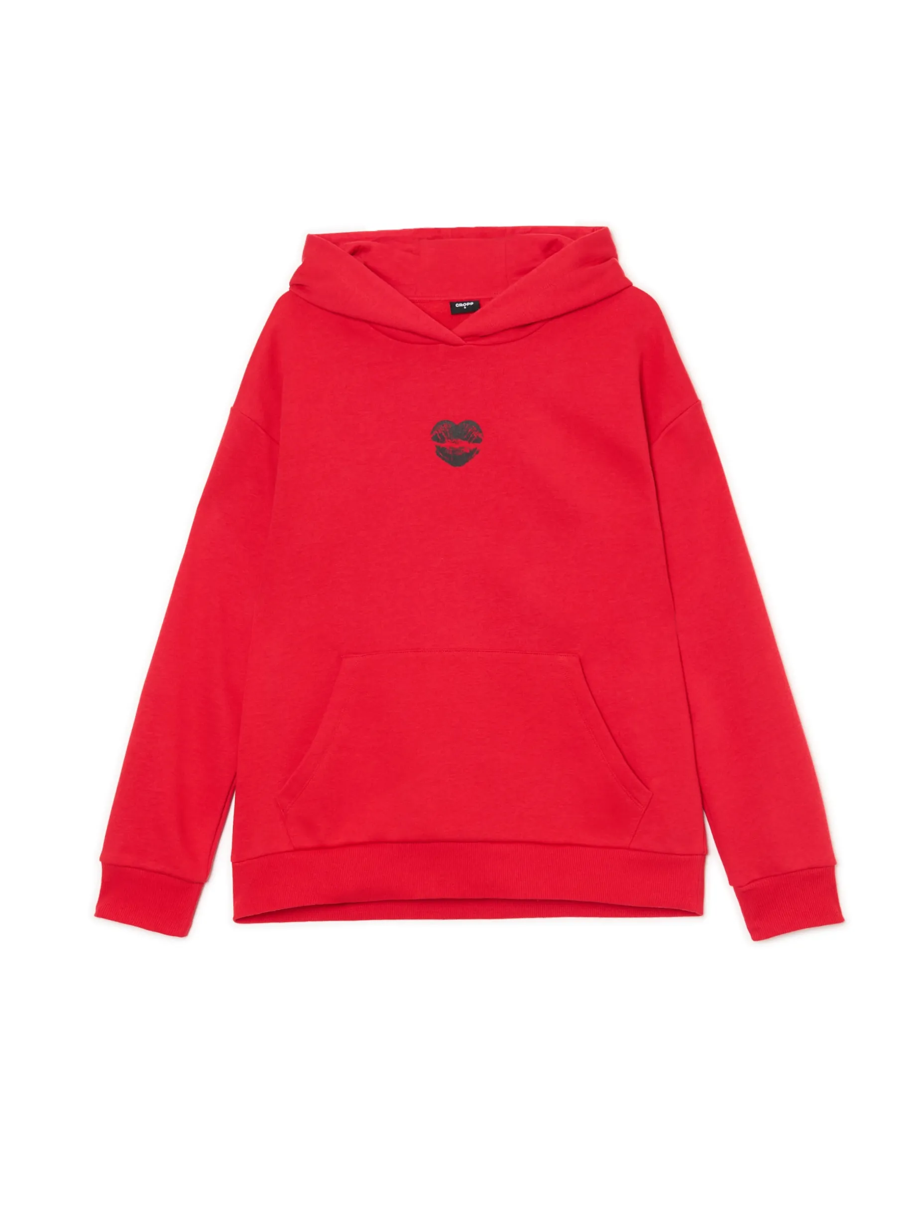 Ciepła damska bluza z kapturem uszyta z trwałej mieszanki dzianin w czerwonym kolorze. Item, który otuli Cię w chłodne wieczory. uszyta z miękkiej dzianiny z bawełną regularny krój obszerny kaptur długie rękawy z obniżoną linią ramion z przodu duża kieszeń typu kangurka dół i rękawy wykończone prążkowanym ściągaczem niewielki nadruk z przodu