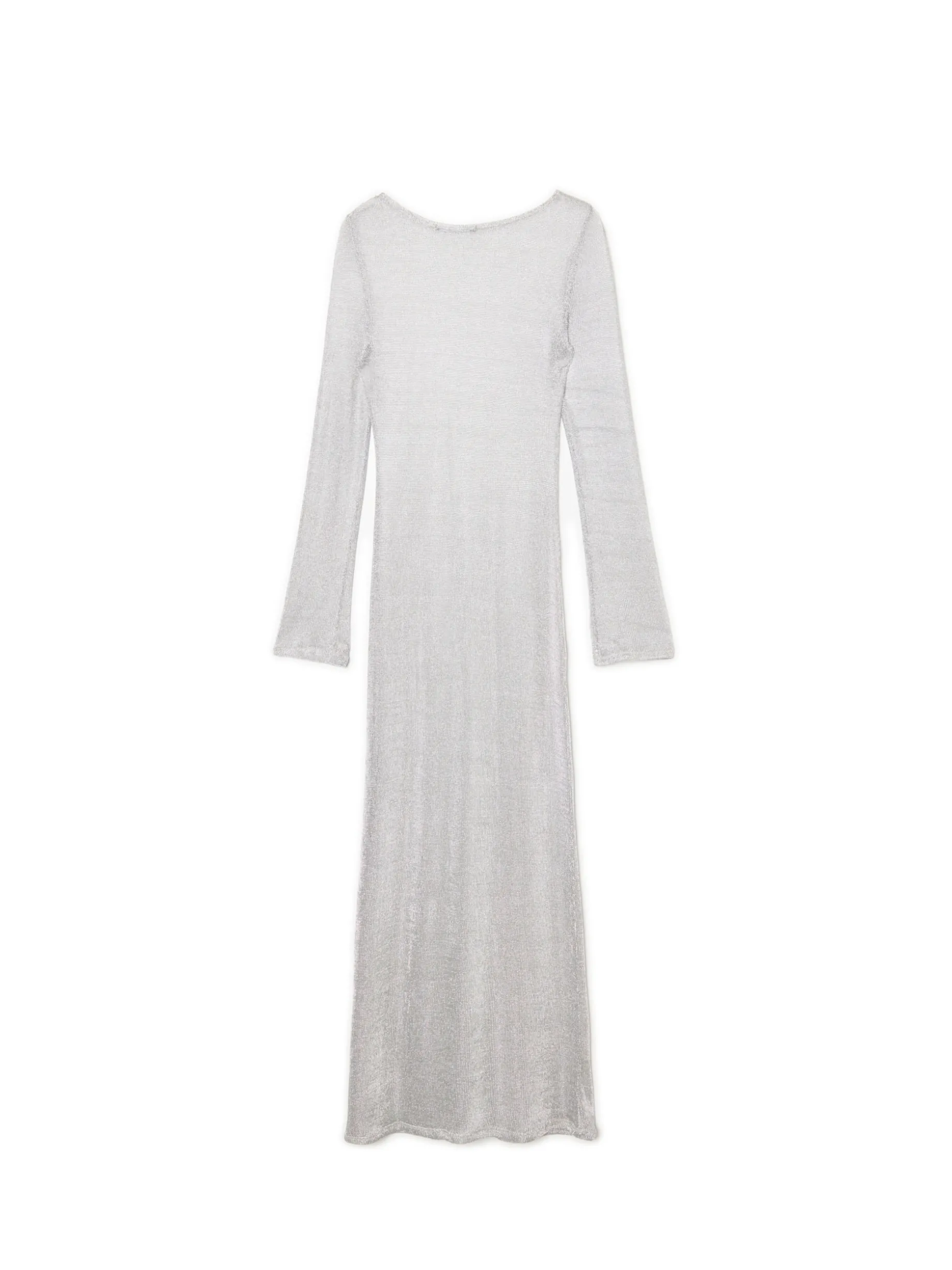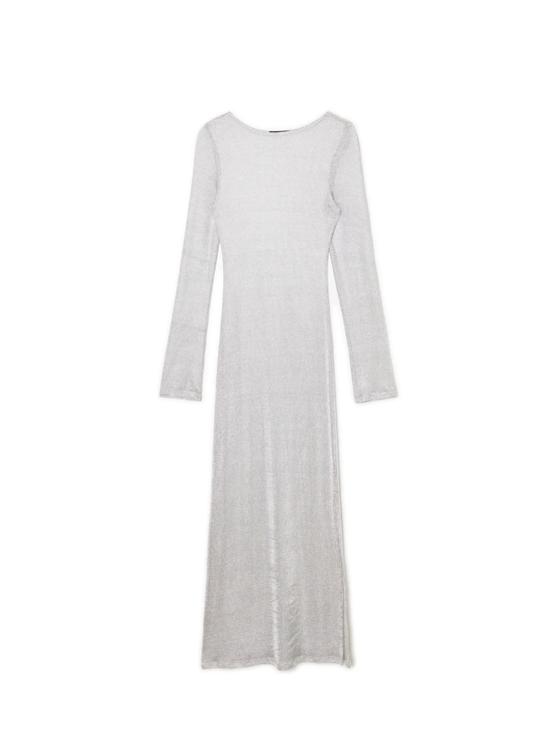 Damska siateczkowa suknia o długości maxi uszyta z mieszanki tkanin imitującej sweter. Z boku bardzo długie, wygodne rozcięcie, podkreślające nogi właścicielki. Srebrny, delikatnie połyskujący kolor będzie wyglądał sztosowo podczas Sylwestrowej zabawy.