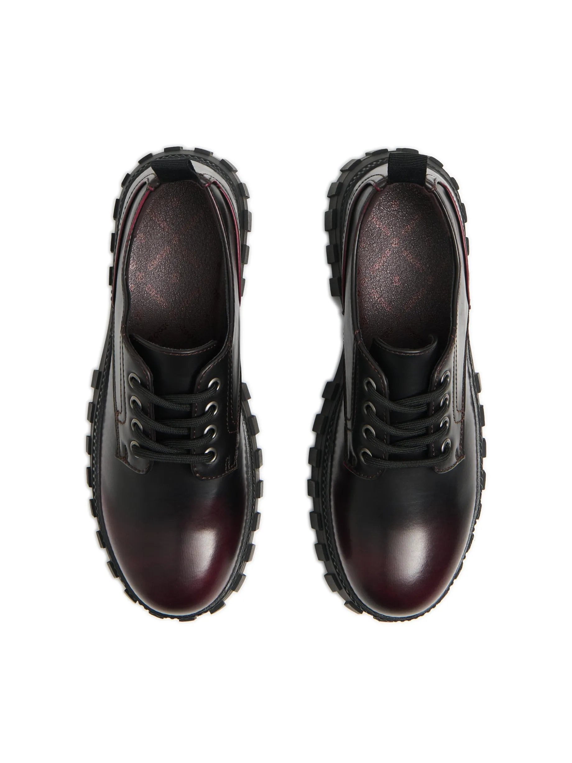 Damskie półbuty typu derby wykonane z imitacji skóry. Solidna podeszwa z gumy termoplastycznej chroni przed różnego typu powierzchniami. Wyjątkowy bordowo-czarny kolor będzie idealnym dodatkiem jesiennych stylizacji. wykonane z łączonych materiałów przejściowe półbuty z imitacji skóry traperowa podeszwa wykonana z gumy termoplastycznej wiązane na elastyczne, prążkowane sznurówki wygodny uchwyt do wkładania i zdejmowania butów ozdobne przeszycia