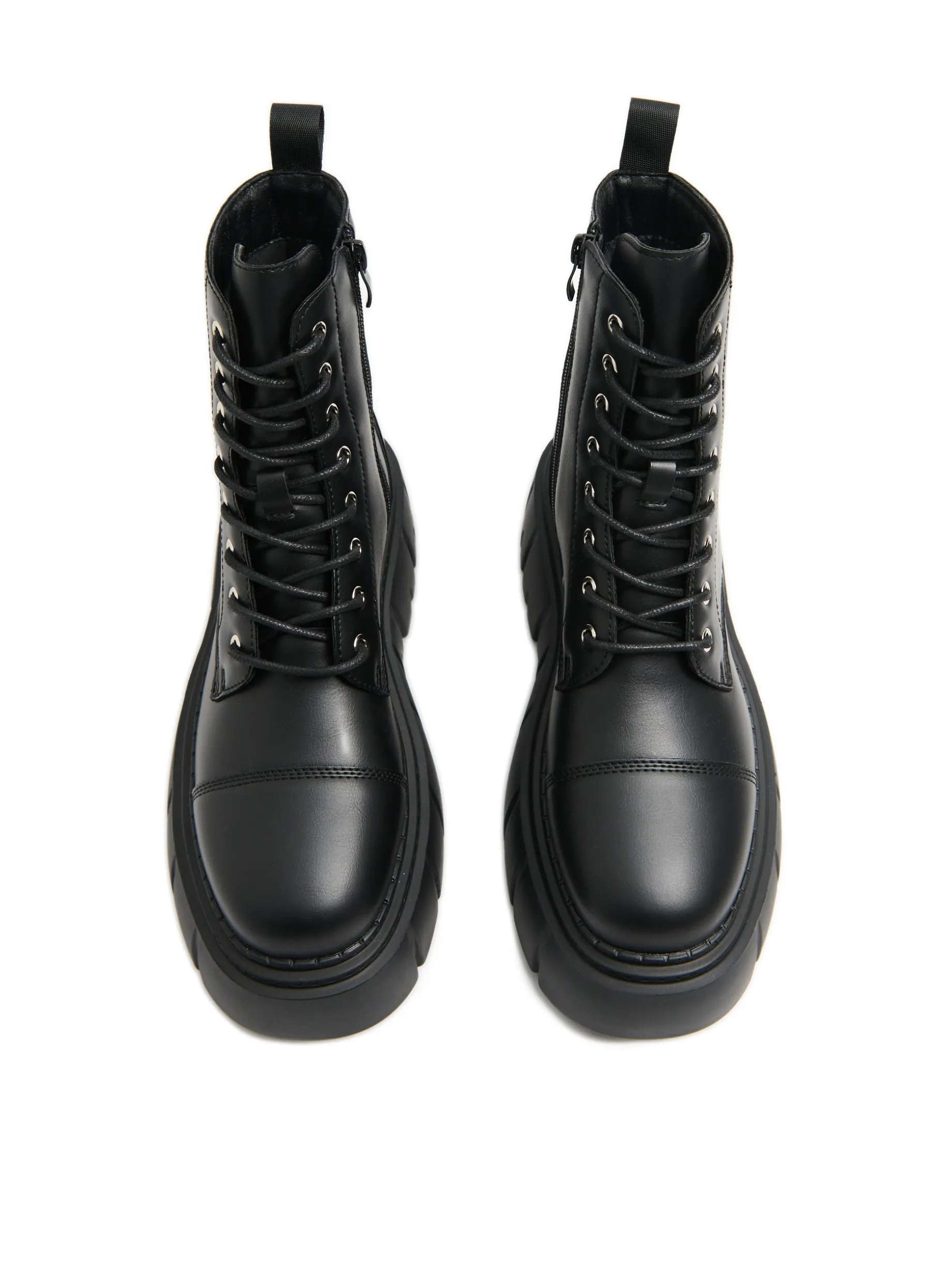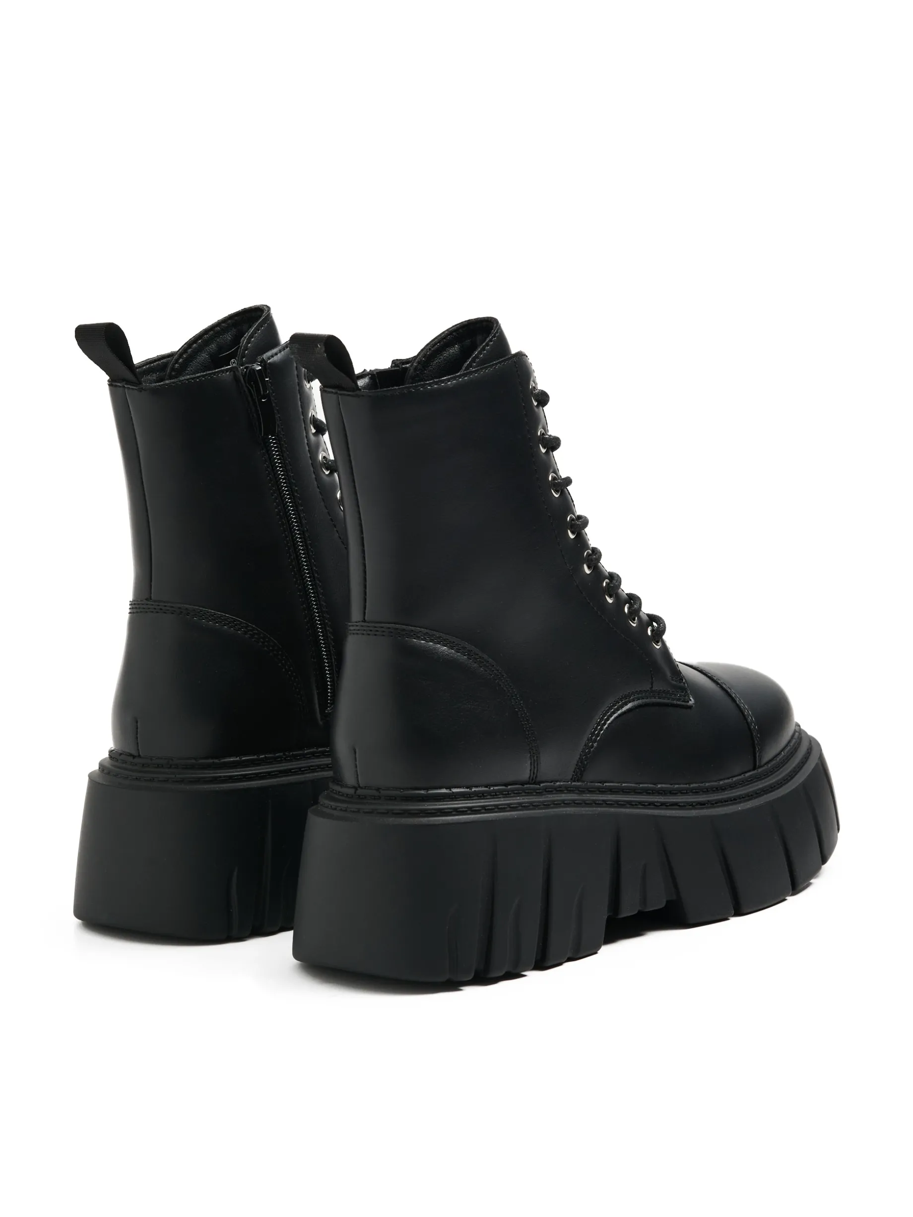 Damskie botki z wysoką cholewką, wykonane z materiału imitującego skórę. Wyposażone w solidne podeszwy, idealne na sezon jesienno-zimowy. botki za kostkę cholewka z imitacji skóry traperowa, masywna podeszwa wiązane na czarne sznurowadła metalowe detale wygodny uchwyt do wkładania i zdejmowania butów