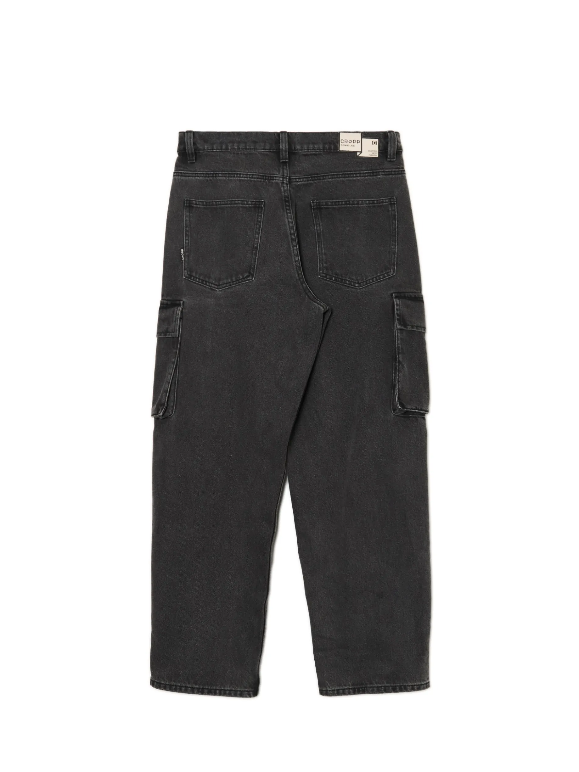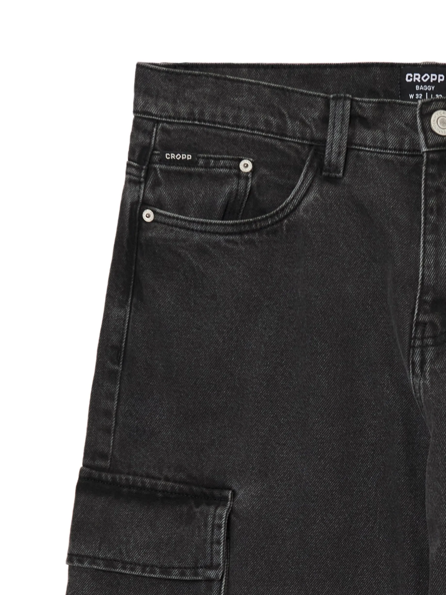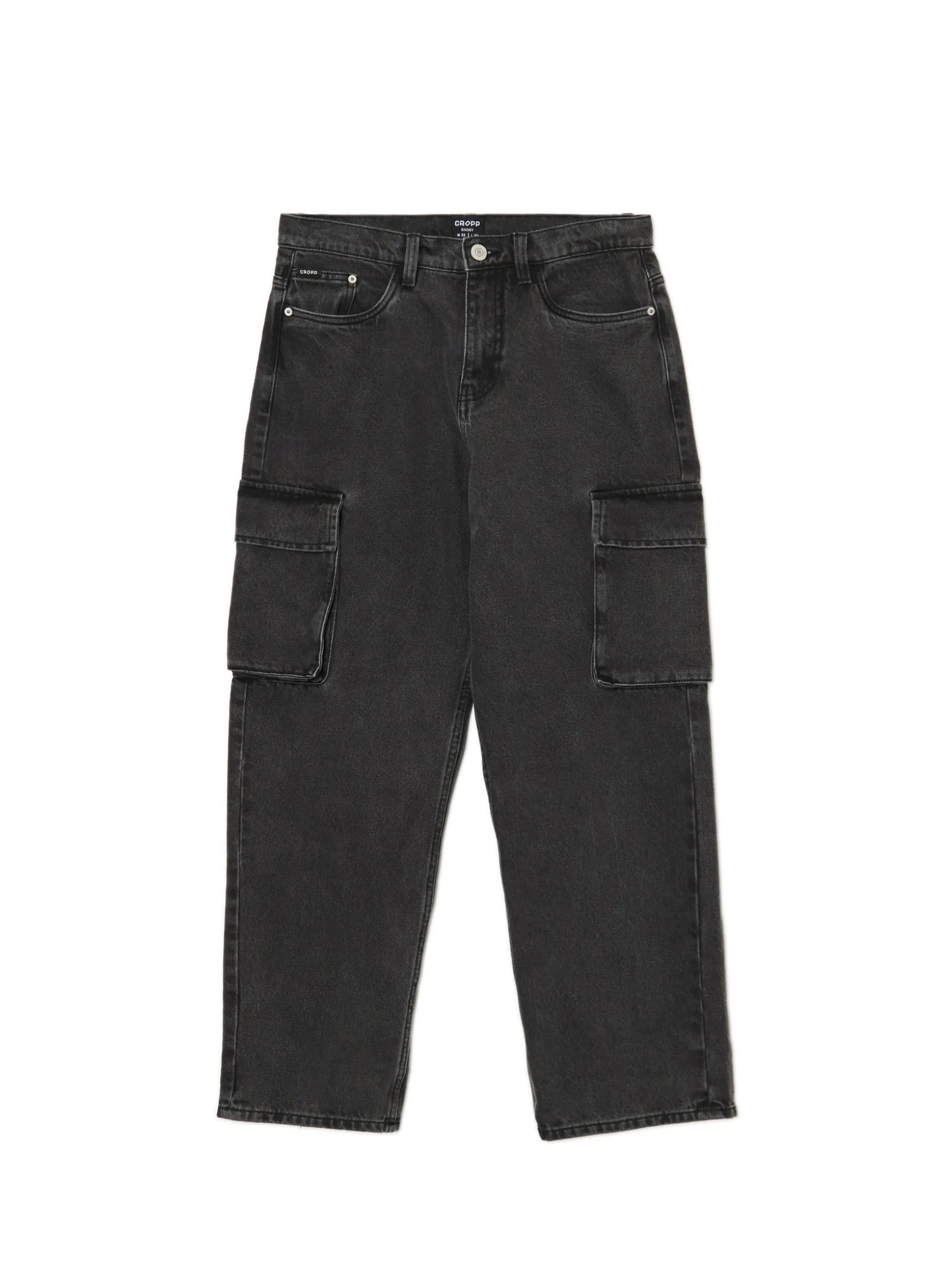 Męskie spodnie typu baggy uszyte w 100% z bawełnianej tkaniny. Dodatkowe kieszenie cargo z patkami i delikatny efekt sprania na całej powierzchni materiału nadają temu klasycznemu modelowi nowoczesności. denim o szarym odcieniu z delikatnym efektem sprania obszerny krój baggy zapięcie na zamek i guzik pięć kieszeni dodatkowe kieszenie cargo na nogawkach naszywka z napisem Cropp Model prezentuje produkt w rozmiarze M/L. Wzrost modela: 185 cm