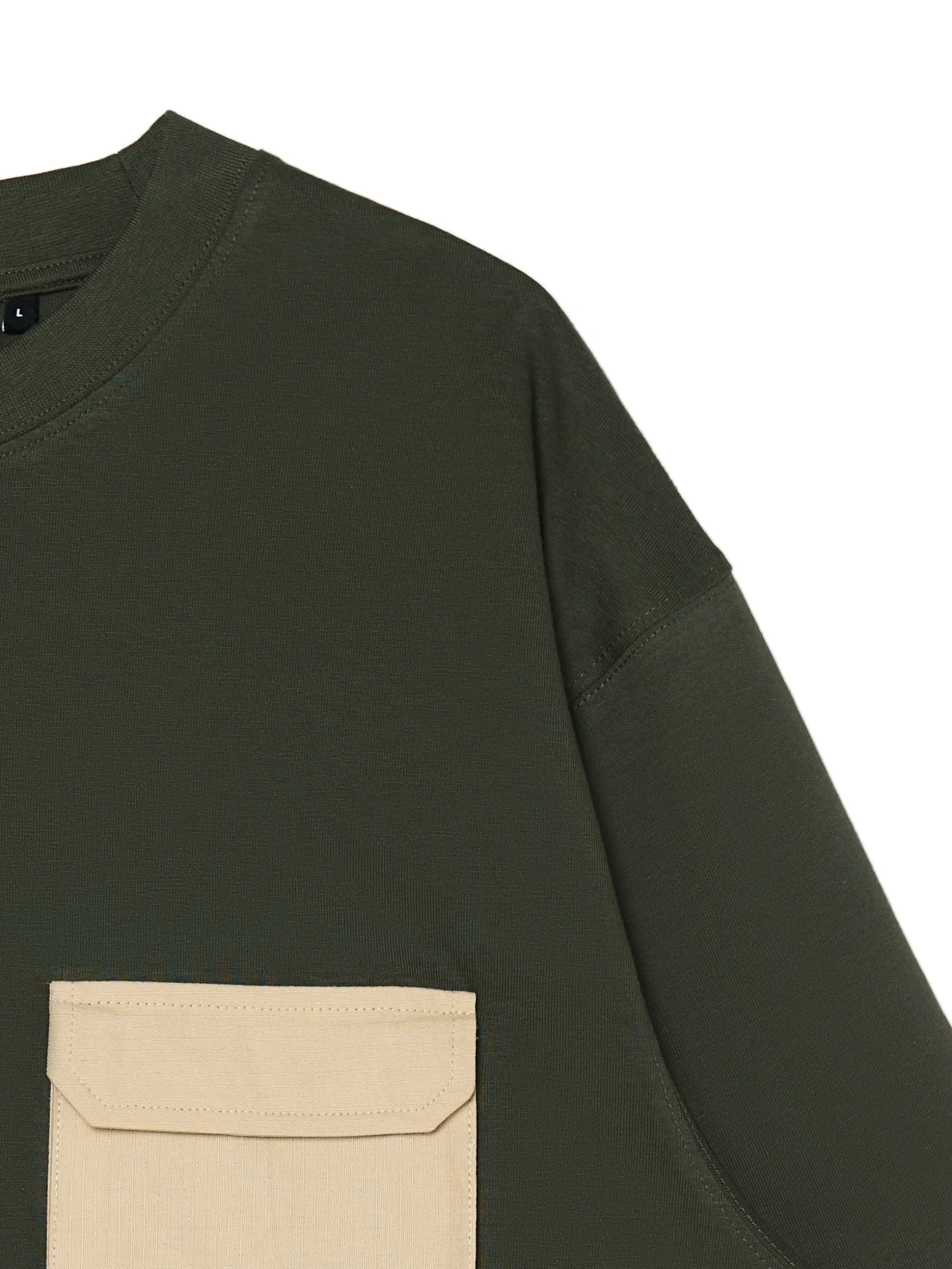 T-shirt męski w kolorze zielonym, uszyty z bawełnianego materiału. Wyróżnikiem tego modelu jest kieszonka typu cargo na przodzie w jaśniejszym odcieniu. 100% bawełny wygodny krój comfort krótkie, swobodne rękawy lekko obniżona linia ramion naszywana kieszeń na piersi dekoracyjne rozcięcia po bokach