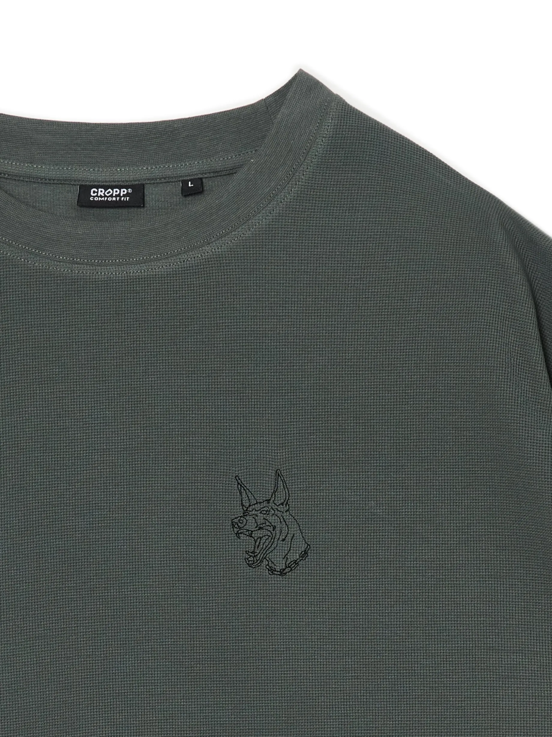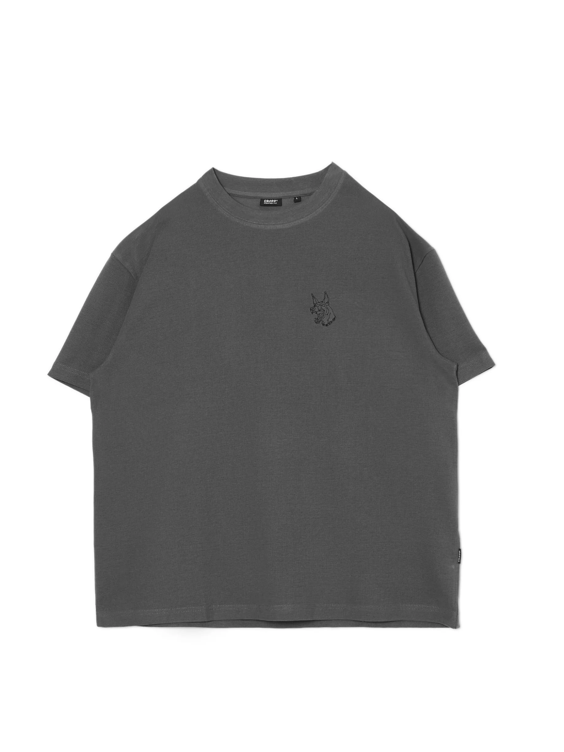 Męska koszulka z krótkim rękawem, uszyta z bawełny. Na przodzie drobna naszywka z motywem psa. 100% bawełny swobodny, luźny krój półokrągły dekolt z lamówką krótkie rękawy z obniżoną linią ramion Model prezentuje produkt w rozmiarze M/L. Wzrost modela: 185 cm