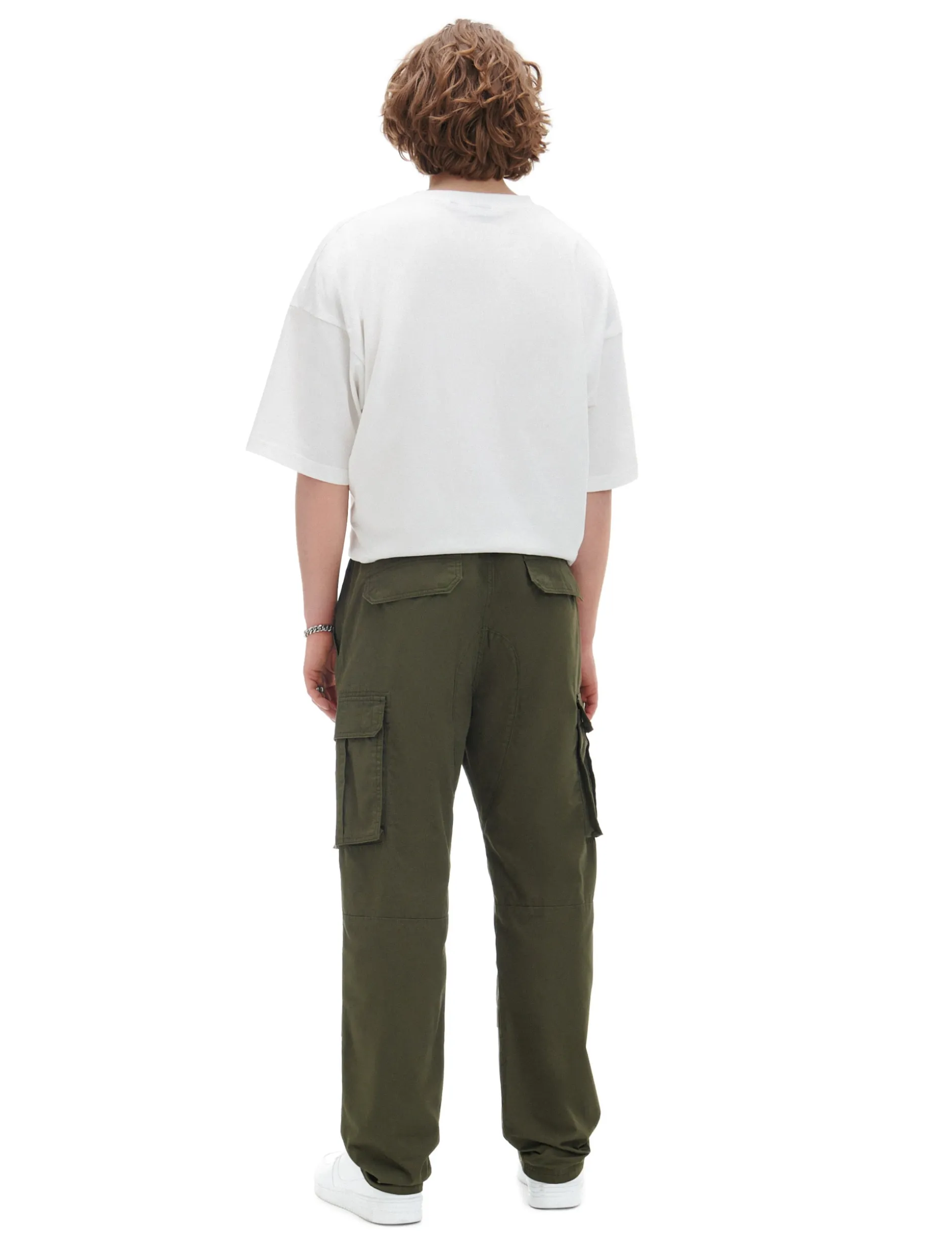 Męskie spodnie z paskiem, uszyte z ciemnozielonego materiału o stuprocentowej zawartości bawełny. wygodny krój comfort regularny stan, zapięcie na guzik i zamek sześć kieszeni, w tym dwie typu cargo z patkami poziome przeszycia w zestawie materiałowy pasek szlufki na pasek Wzrost modela: 184 cm