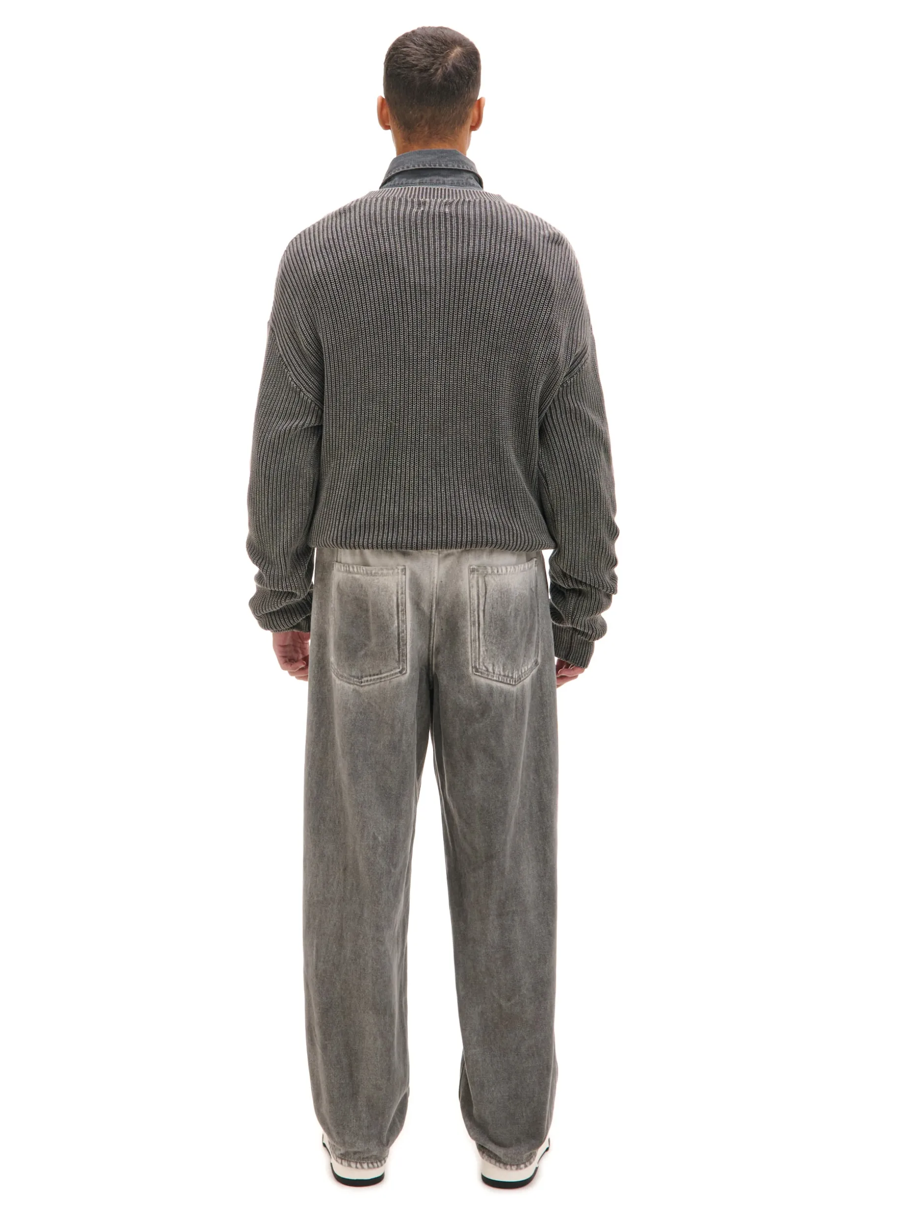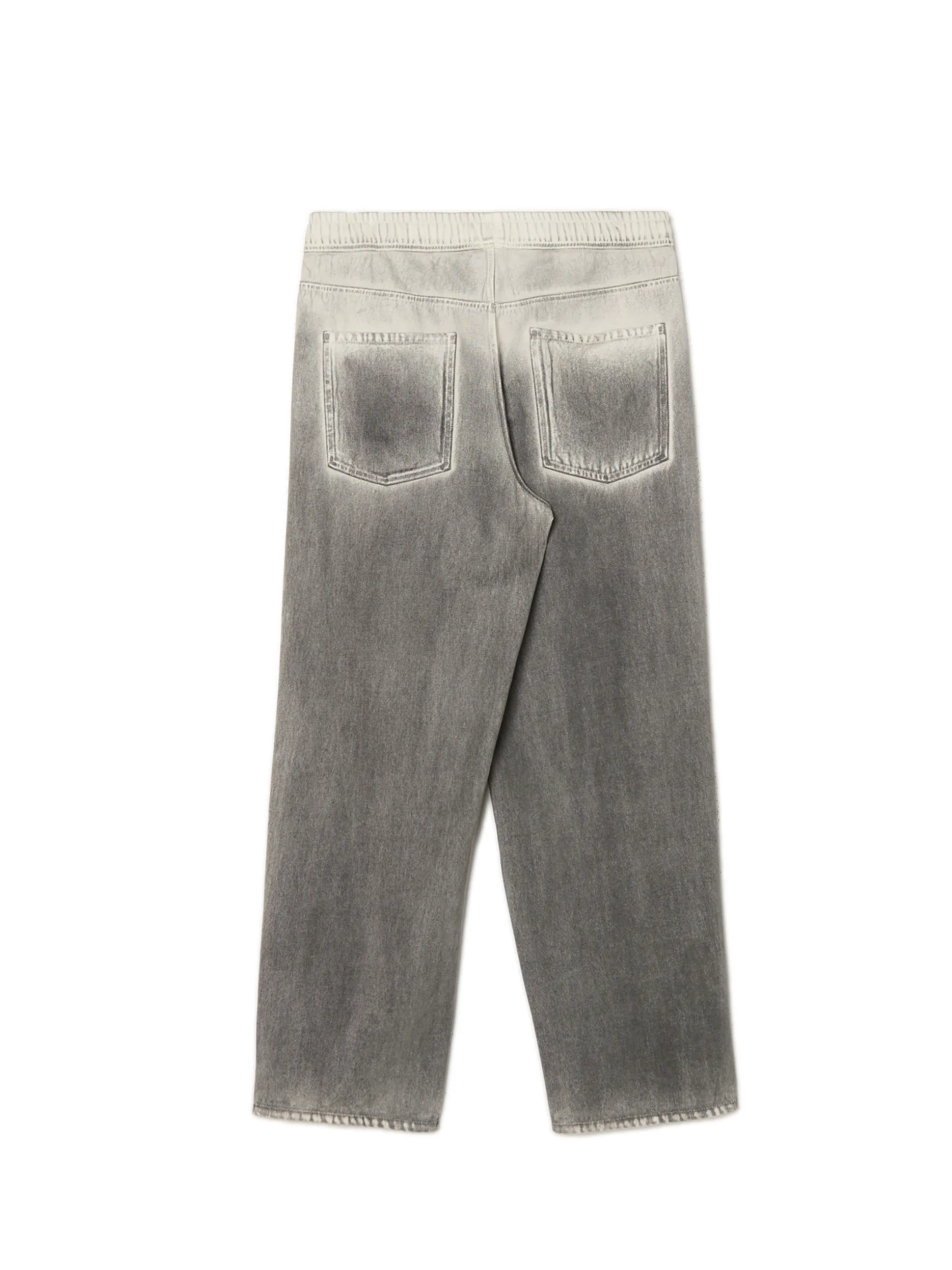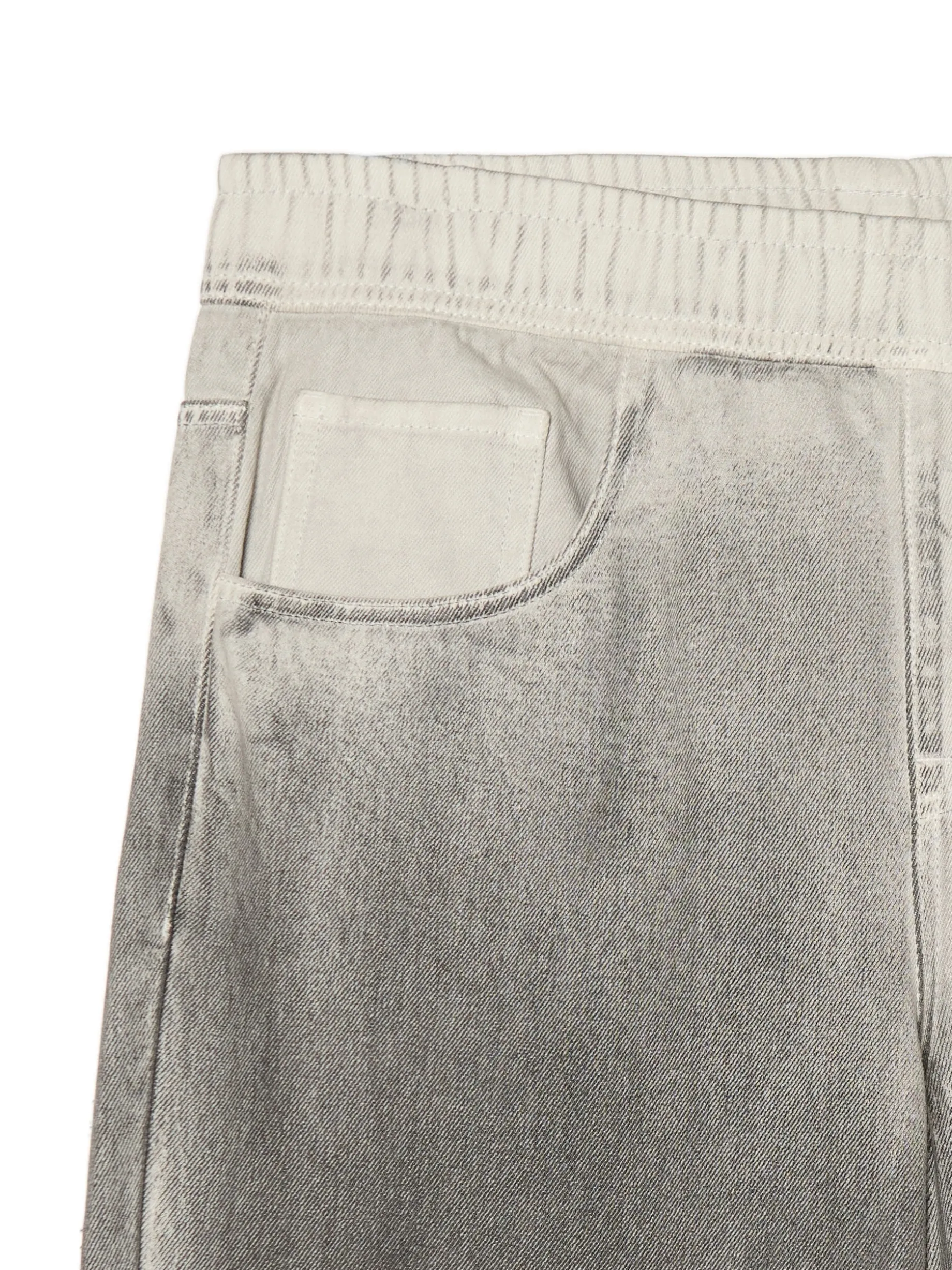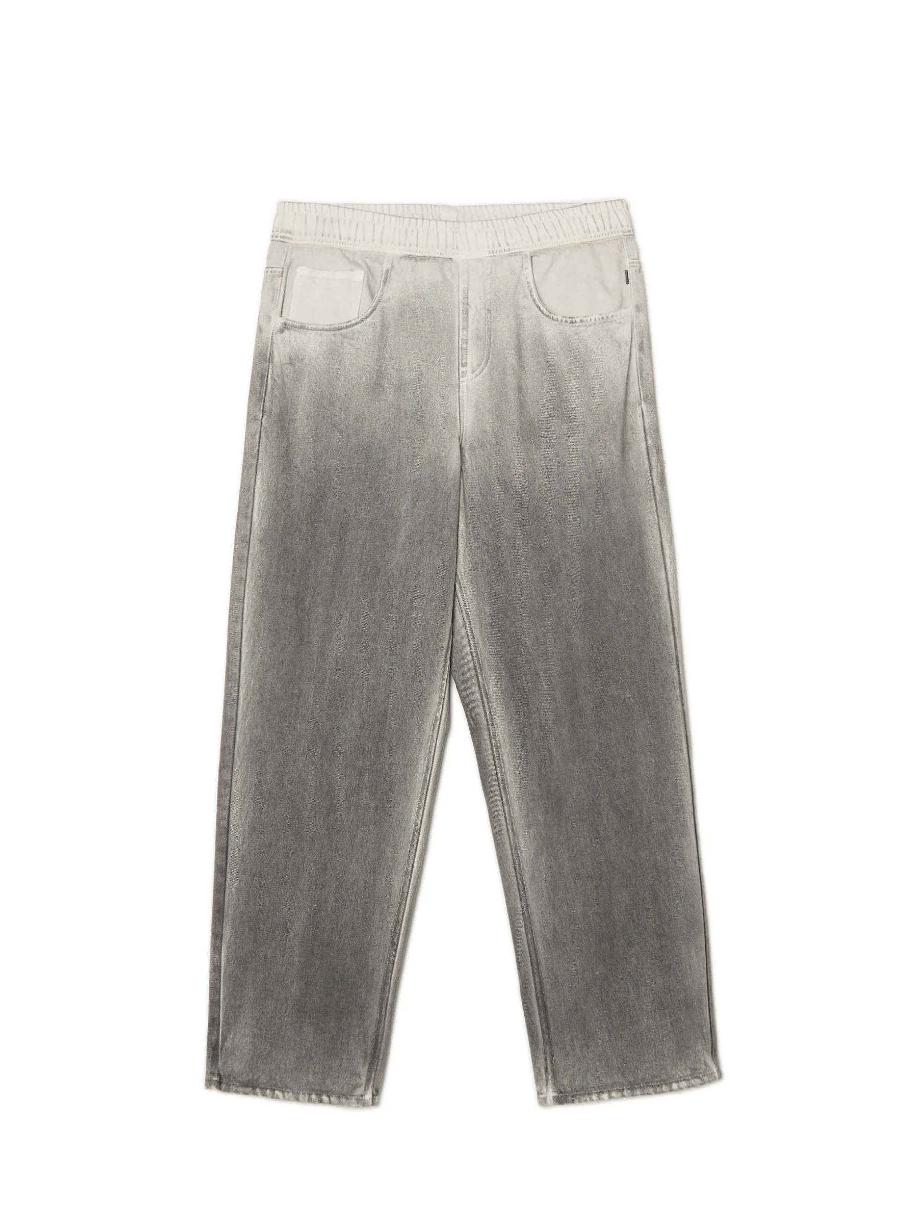 Męskie spodnie o szerokich nogawkach, uszyte z tkaniny typu coated. Woskowany materiał wyglądem przypomina efekt skóry. Ten item fituje ze zwiewnymi materiałami tworząc efektowne stylizacje. 100% bawełny spodnie o kroju wide leg imitacja rozporka długie, szerokie nogawki elastyczna guma w pasie pięć kieszeni efekt ombre na całości
