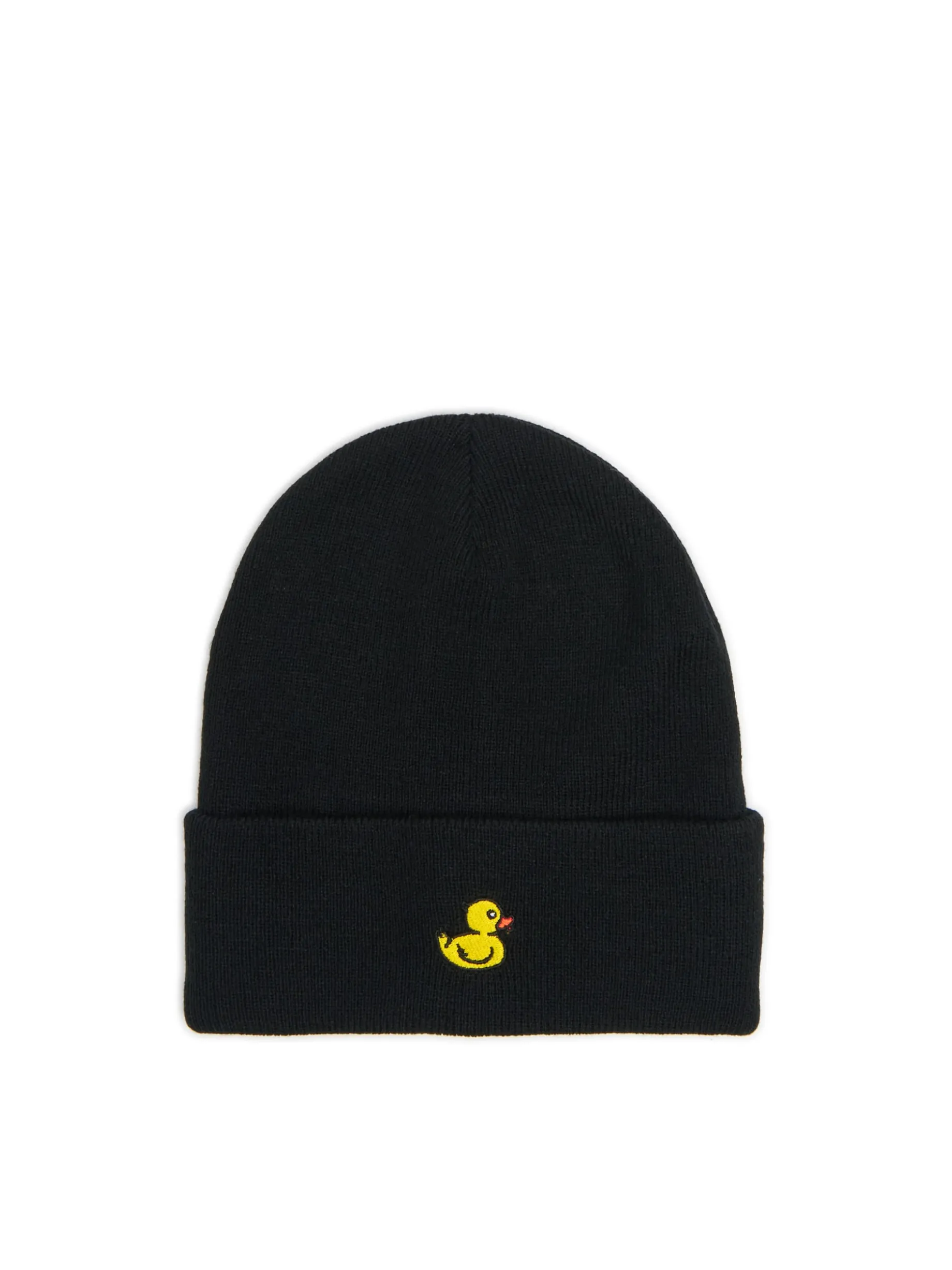 Męska czapka beanie z uroczą naszywką w kształcie małej kaczuszki. Uszyta z trwałej dzianiny w kolorze czarnym. Fituje z każdym rodzajem bluzy, kurtki czy płaszcza. Jeden klik i do koszyka! elastyczna, prążkowana dzianina prosty krój autorskie hafty na całości